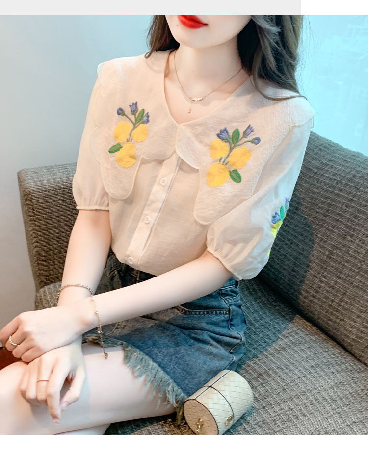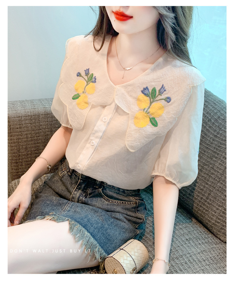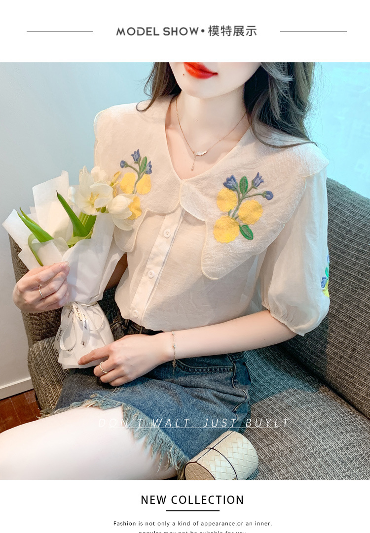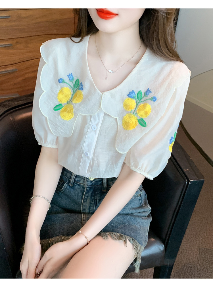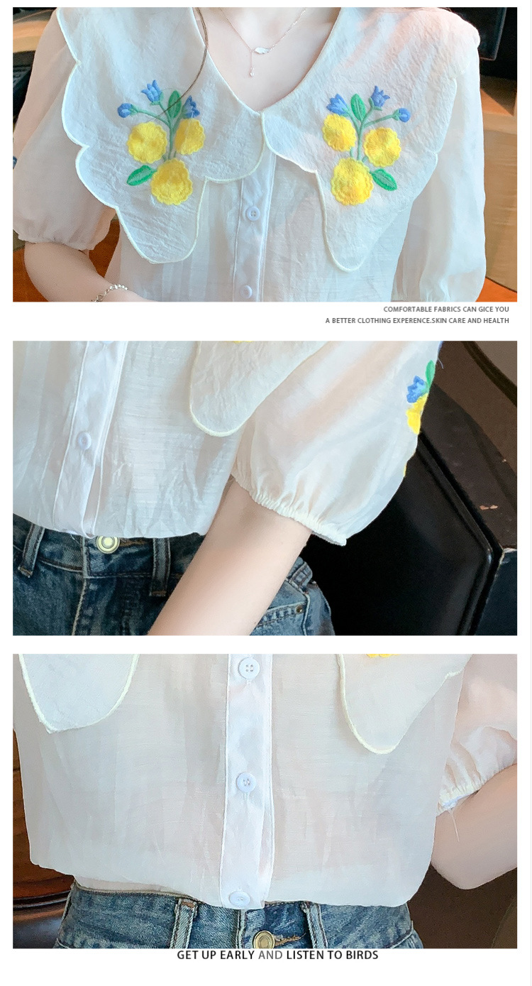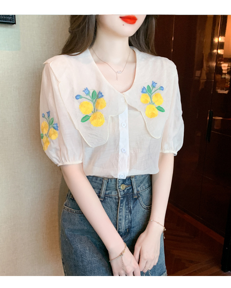 모리 스타일 옐로우 작은 꽃 큰 옷깃 쉬폰 셔츠 프랑스 로맨틱 달콤한 세련된 스타일 퍼프 슬리브 탑