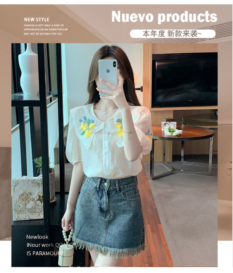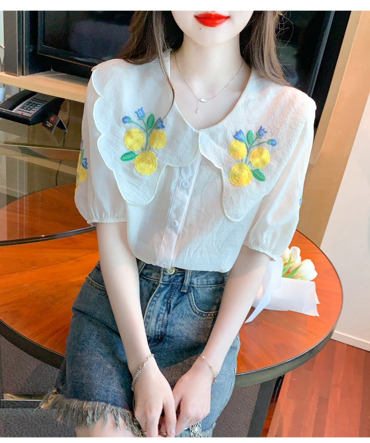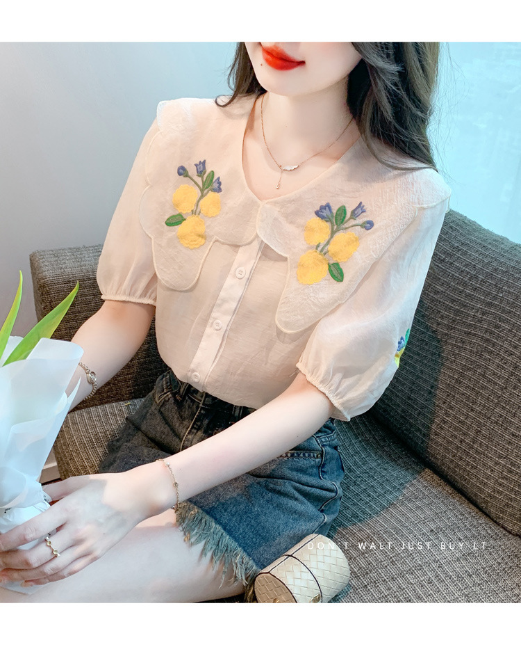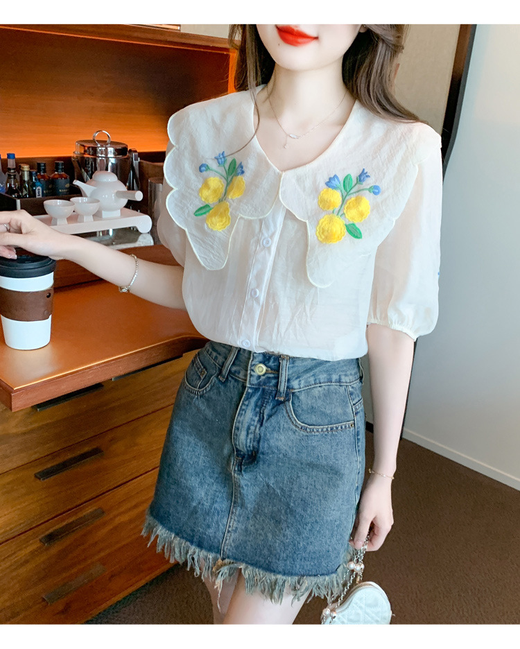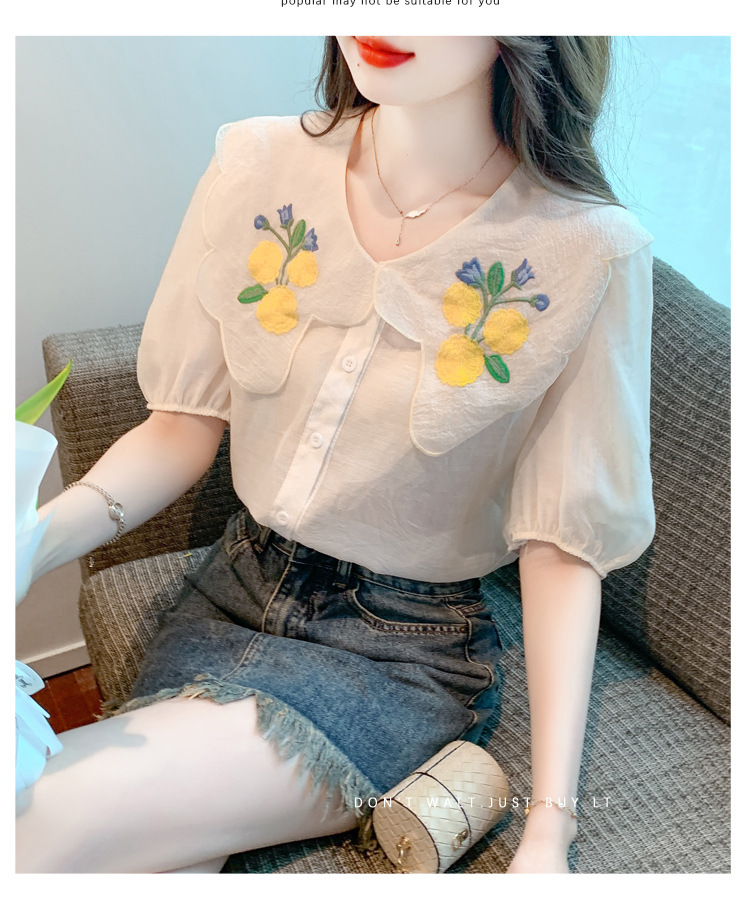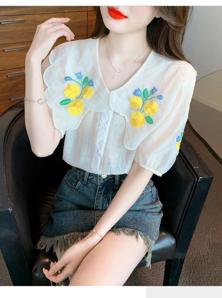 모리 스타일 옐로우 작은 꽃 큰 옷깃 쉬폰 셔츠 프랑스 로맨틱 달콤한 세련된 스타일 퍼프 슬리브 탑