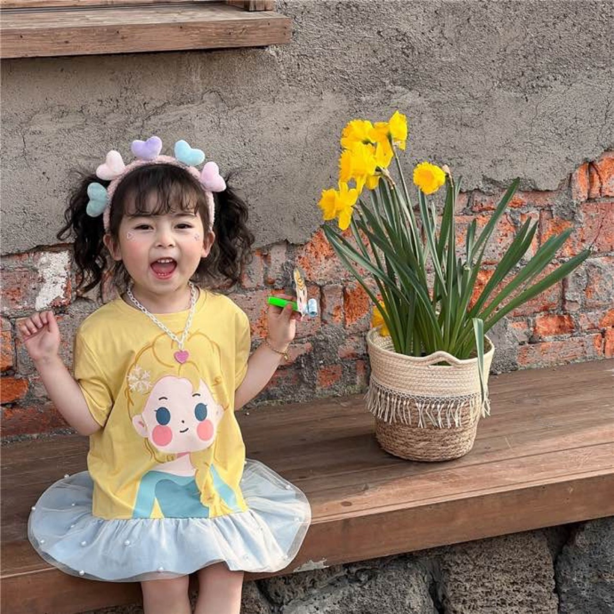 여아용 메쉬 원피스 2025 여름 중간 길이 드레스 한국 스타일 귀여운 만화 공주 시리즈 러플 드레스