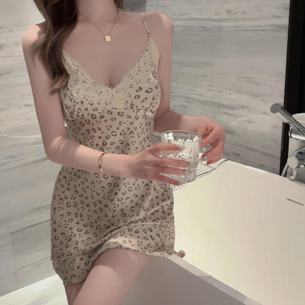 여름 새로운 섹시한 레오파드 레이스 v 넥 서스펜더 잠옷 여성용 가슴 패드 홈웨어 꽃 무늬 잠옷 여성용스토어 가기