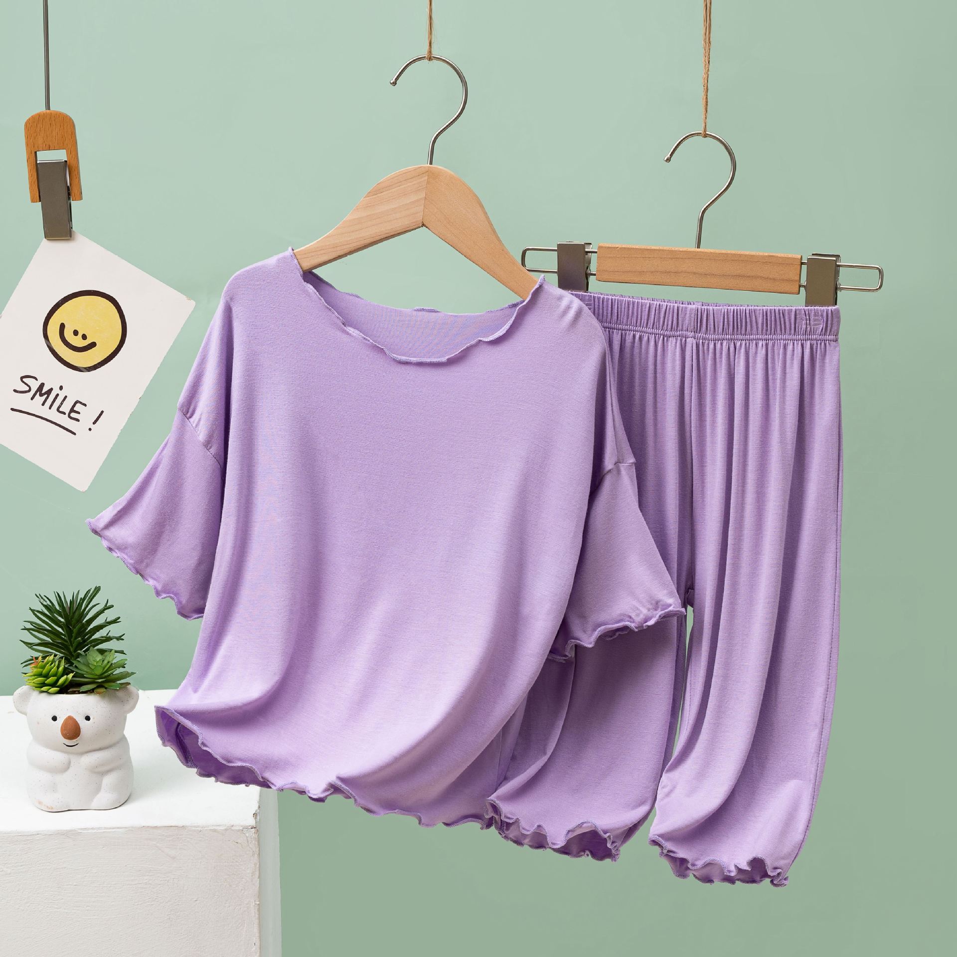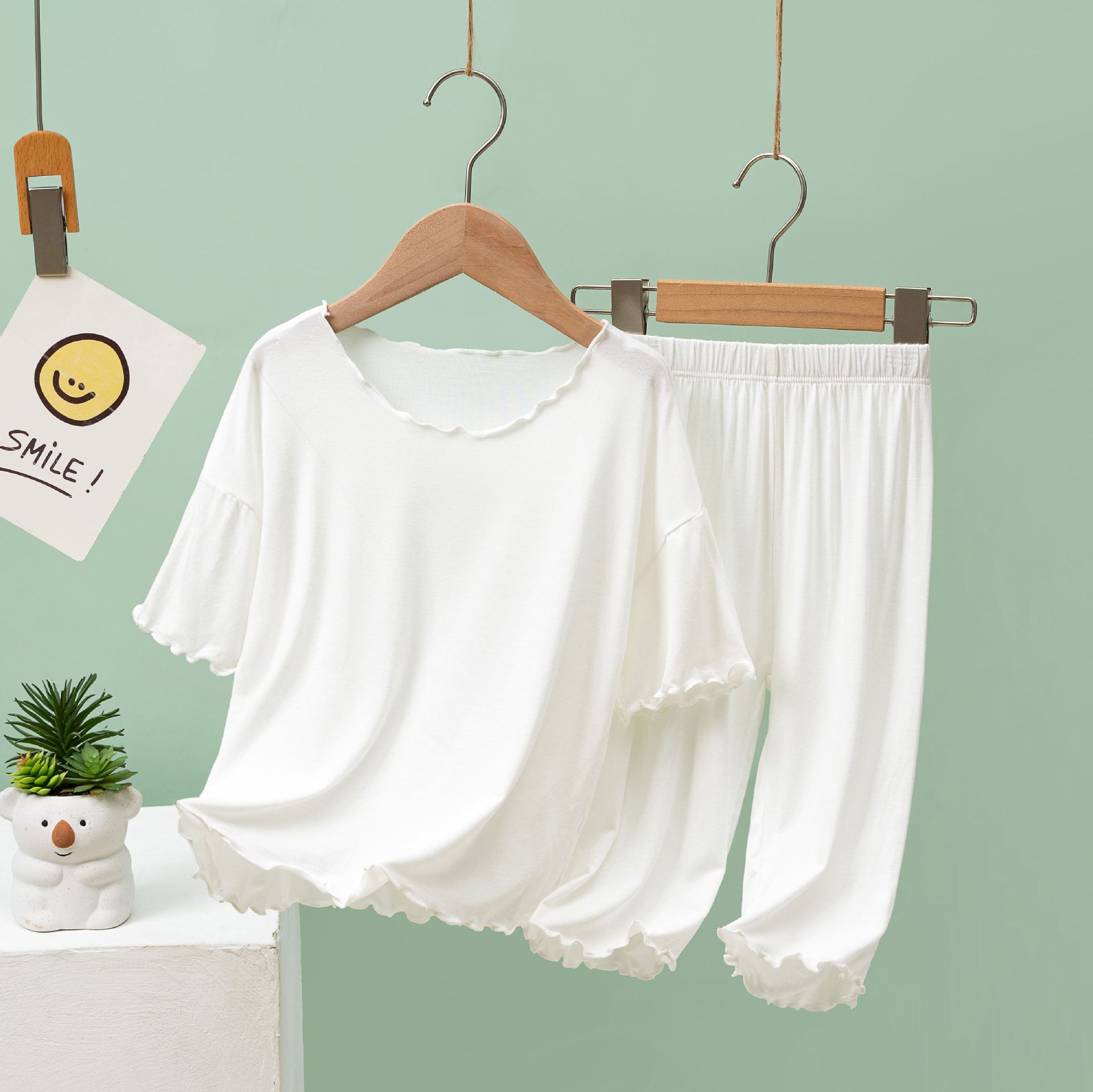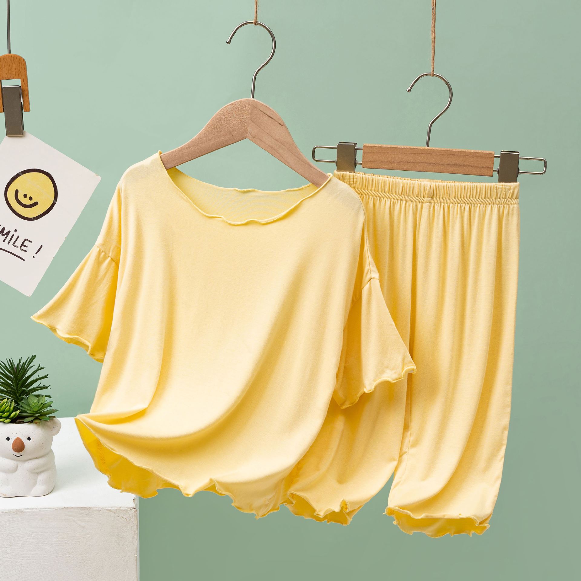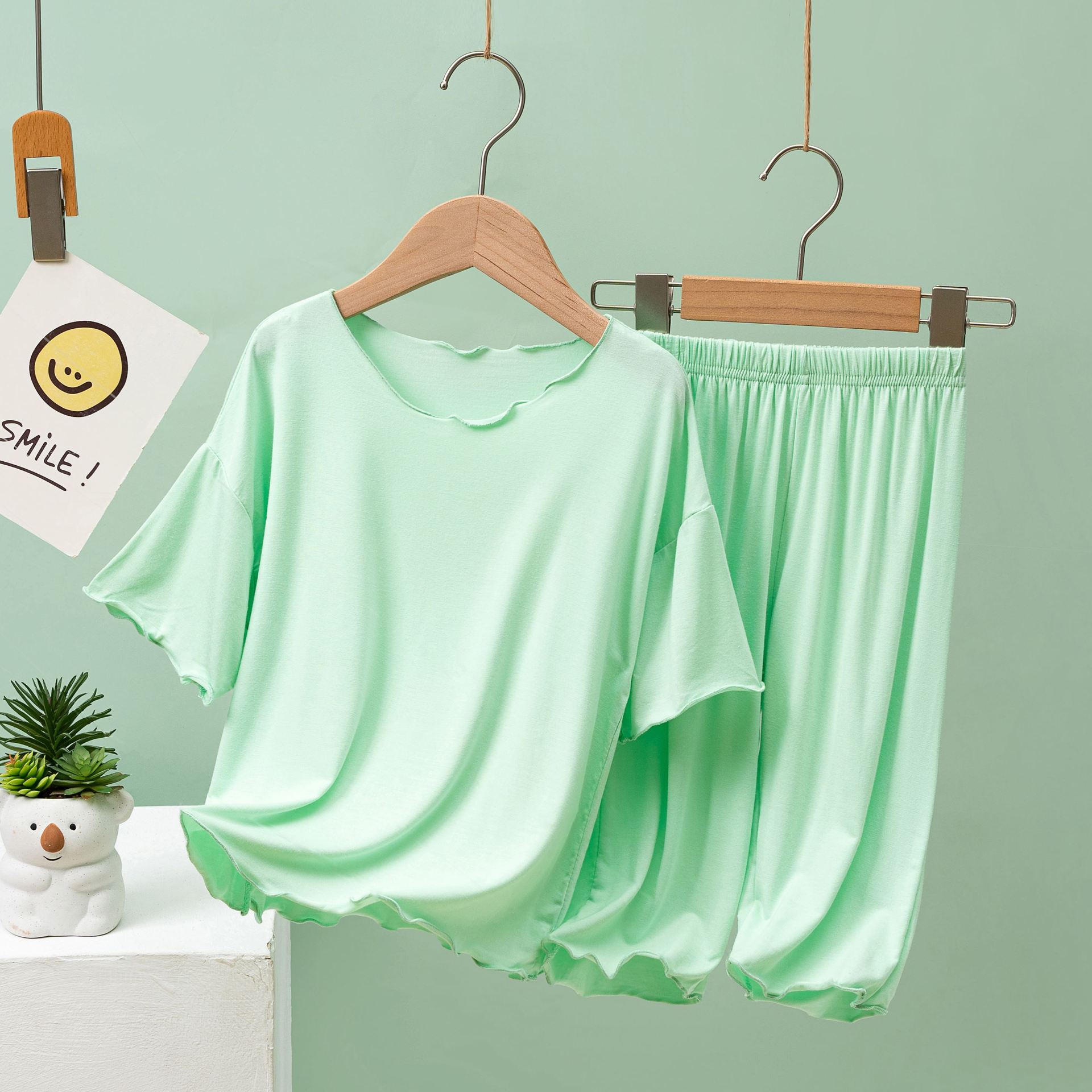 여아 반팔 반바지 잠옷 여름 모달 얇은 귀테 가정복 어린이 아이스 실크 에어컨 옷 세트
