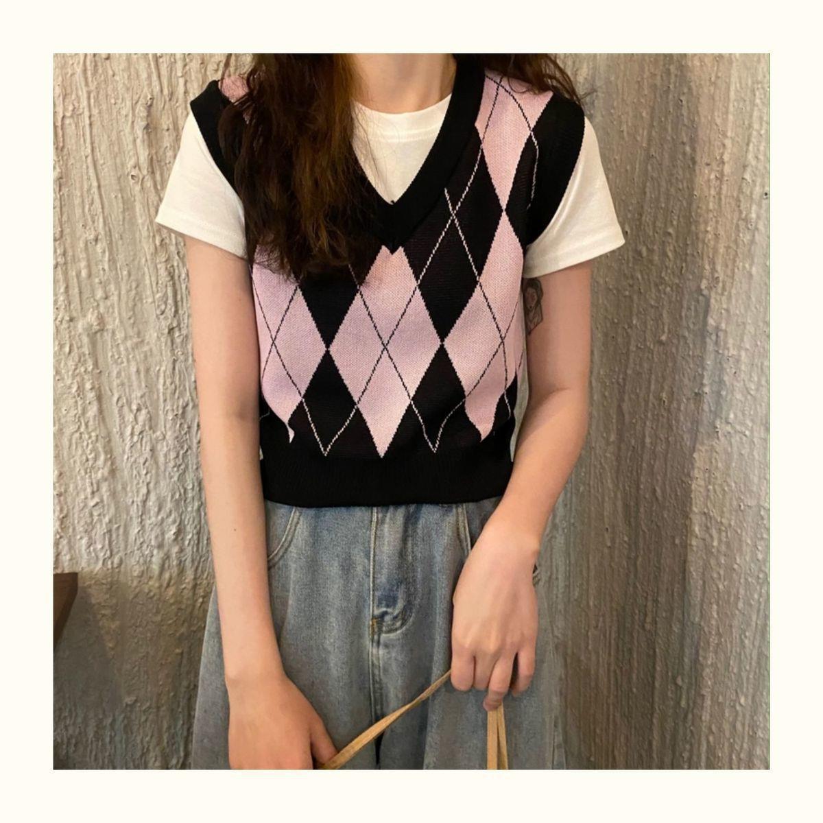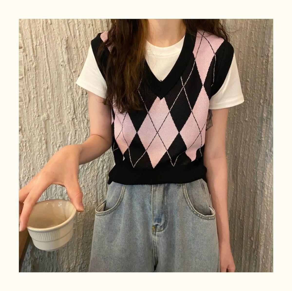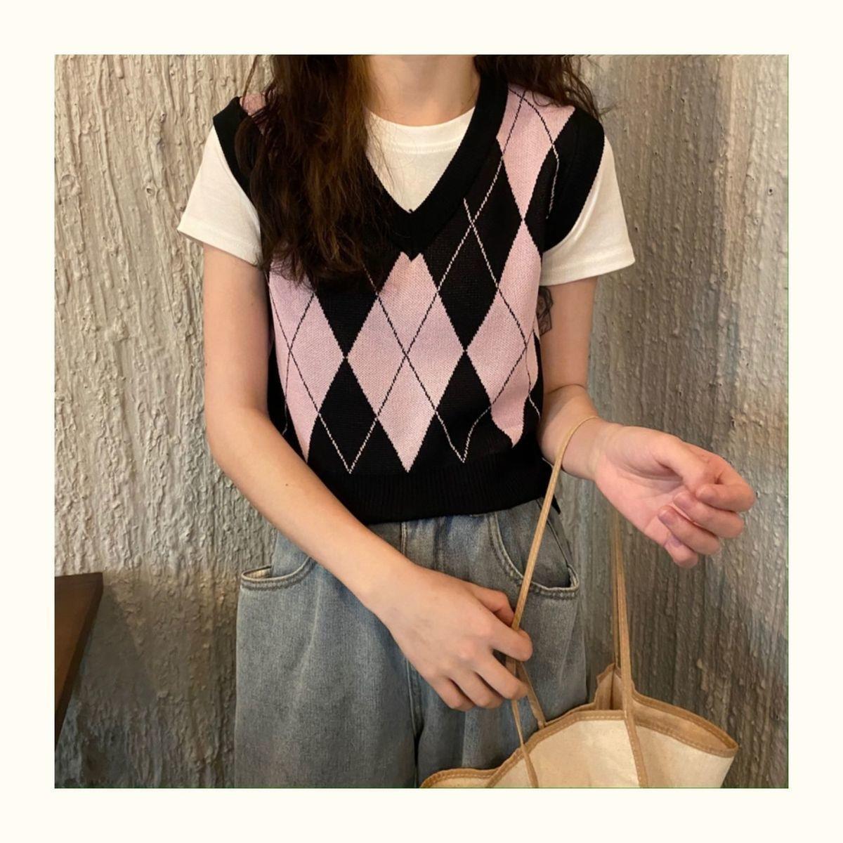 여성용 루즈핏 민소매 니트 조끼 캐주얼 2025 신상 인기 개성 넘치는 여름 얇은 마름모 패턴스토어 가기