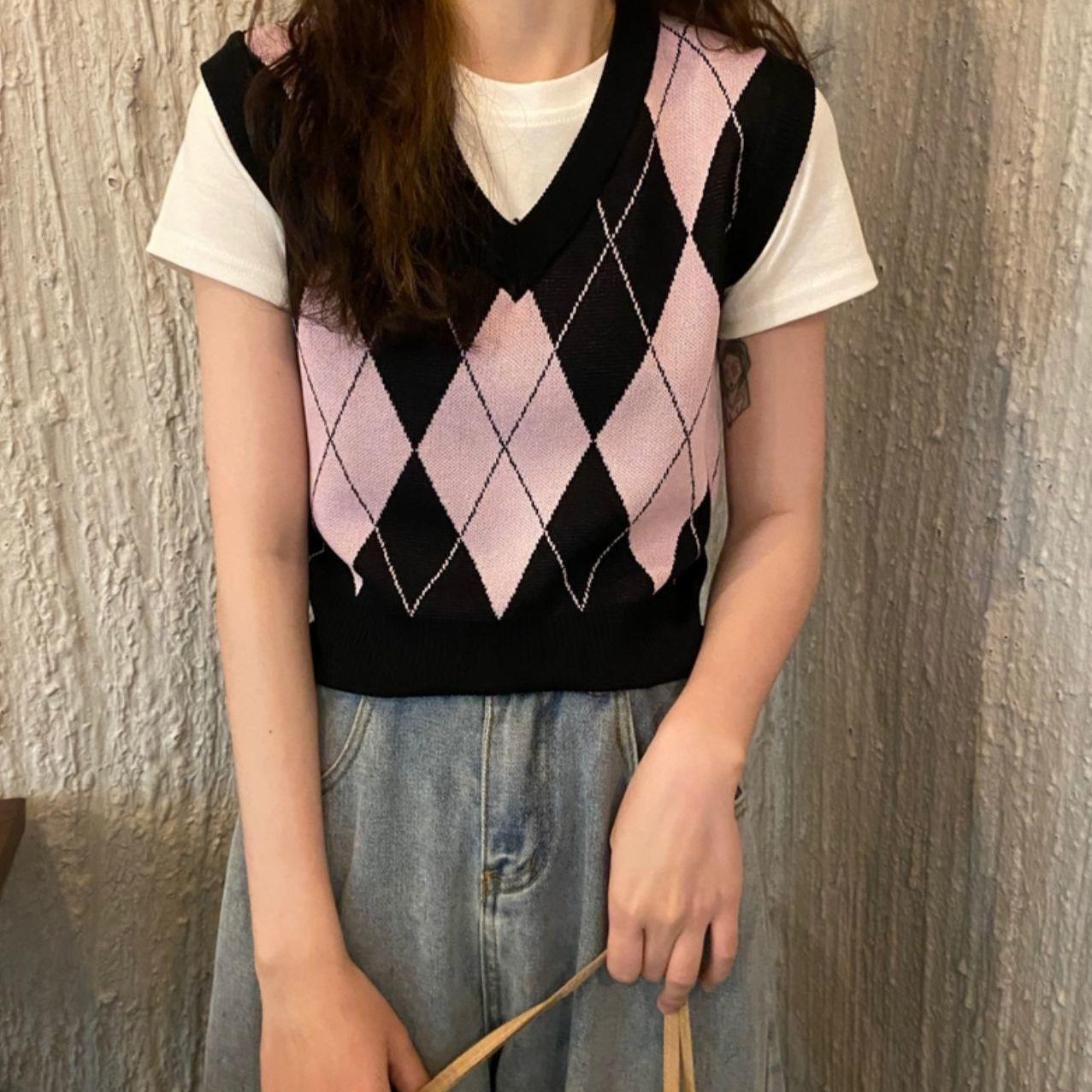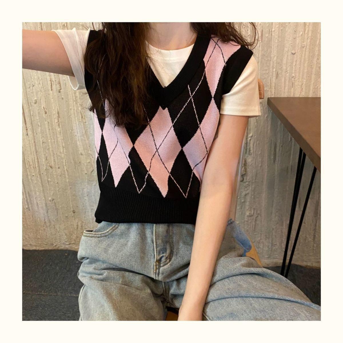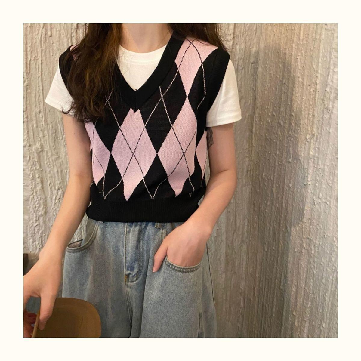 여성용 루즈핏 민소매 니트 조끼 캐주얼 2025 신상 인기 개성 넘치는 여름 얇은 마름모 패턴스토어 가기