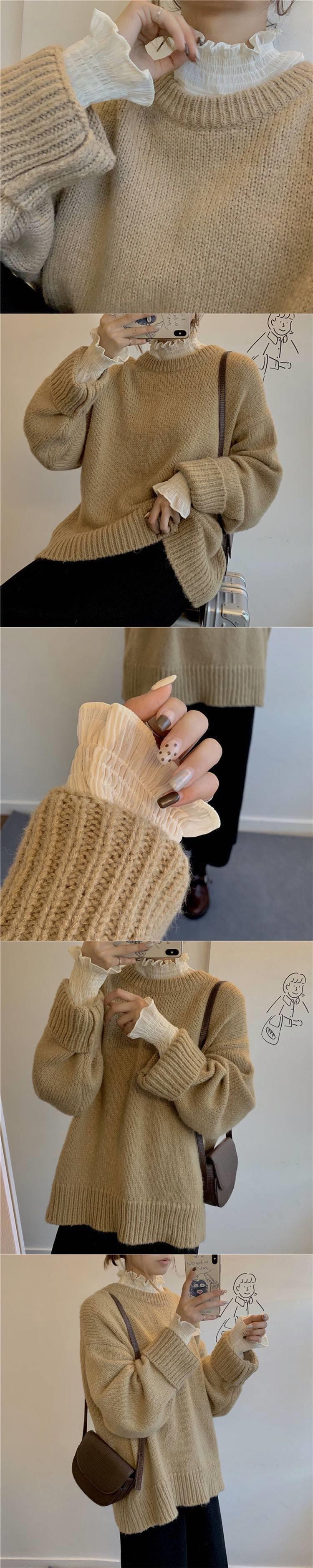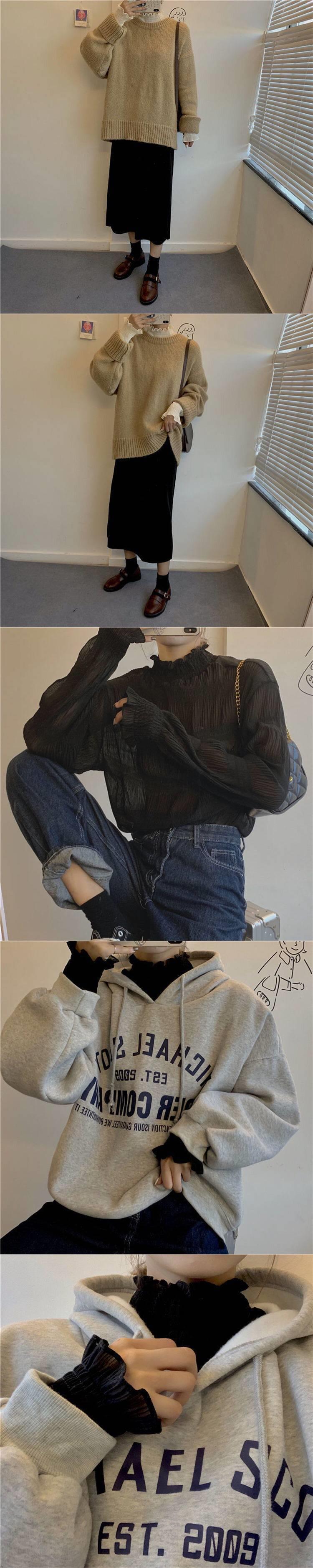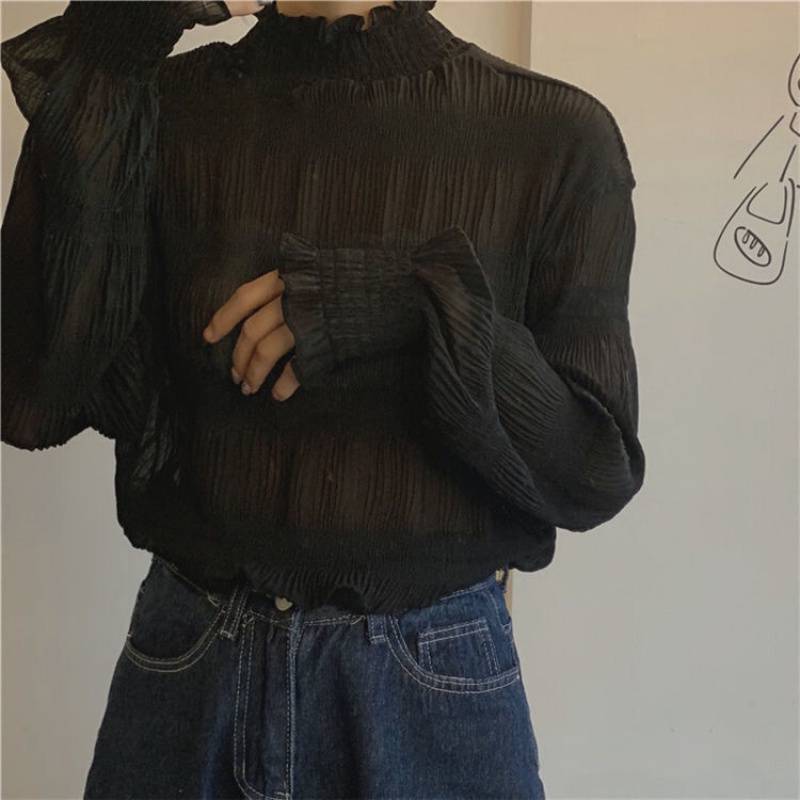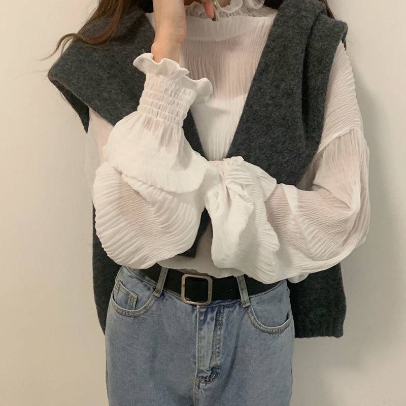 매우 우아한 시폰 상의와 스웨터, 여성용 신상품 러플 반하이넥 긴팔 베이스 레이어 탑이 트렌디하다.스토어 가기