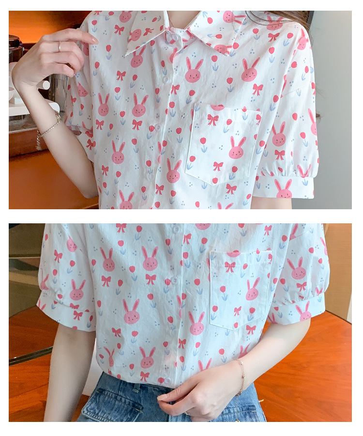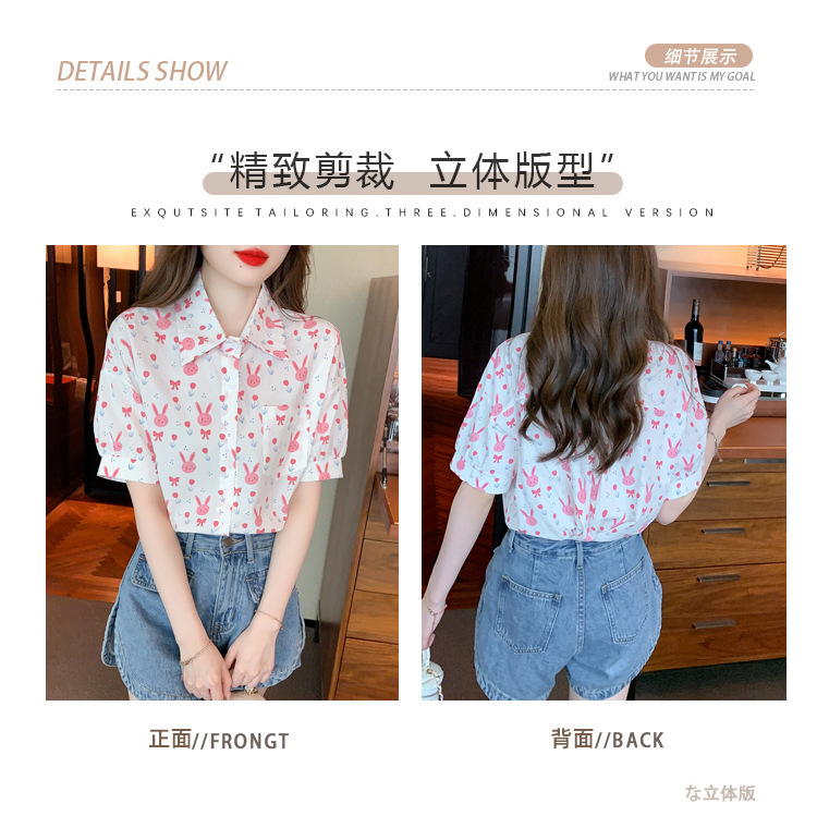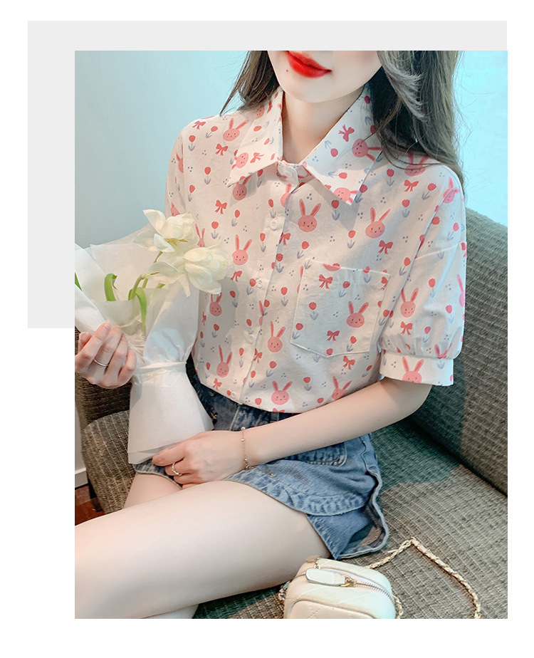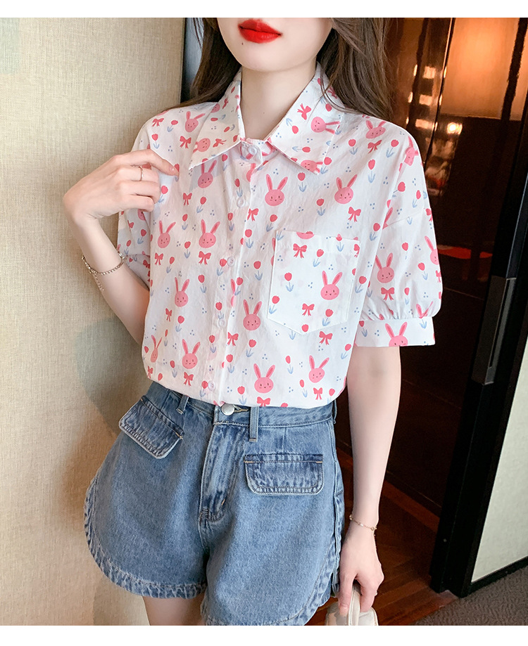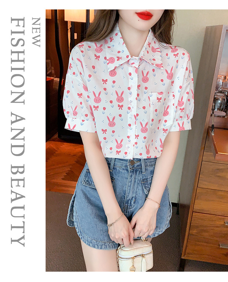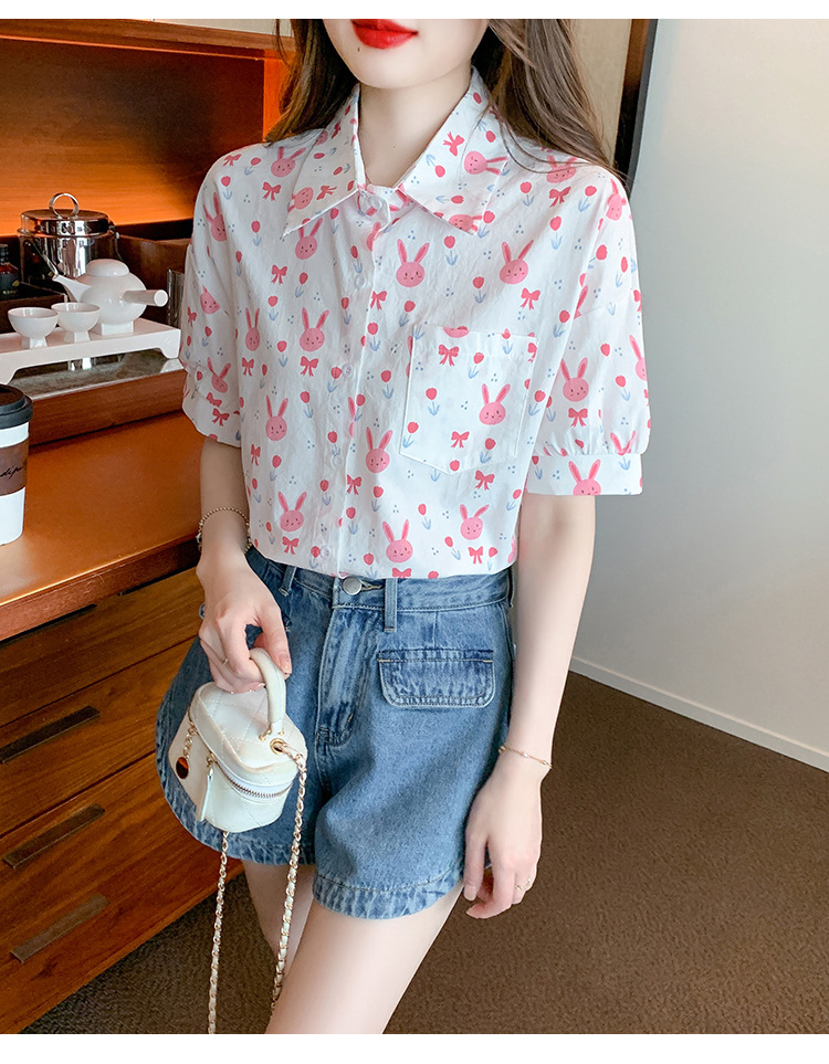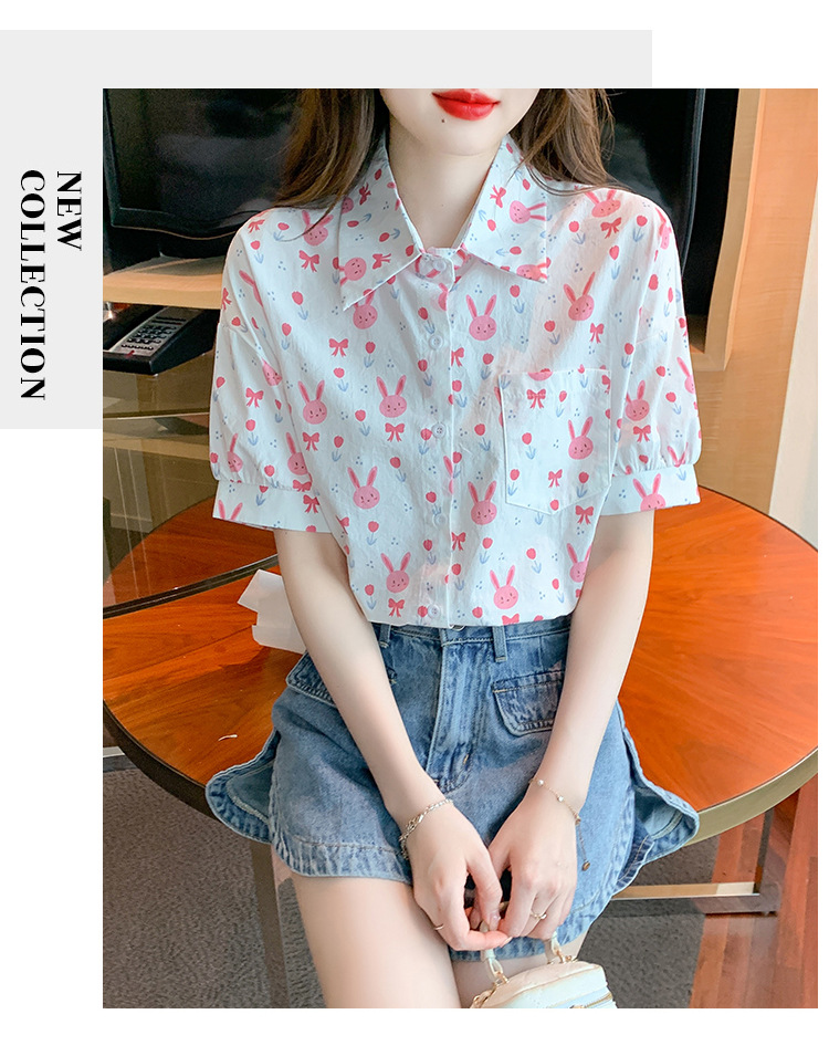 리얼 샷 2024 여름 새로운 한국 스타일 느슨한 디자인 센스 틈새 달콤한 만화 인쇄 올매치 반팔 셔츠스토어 가기