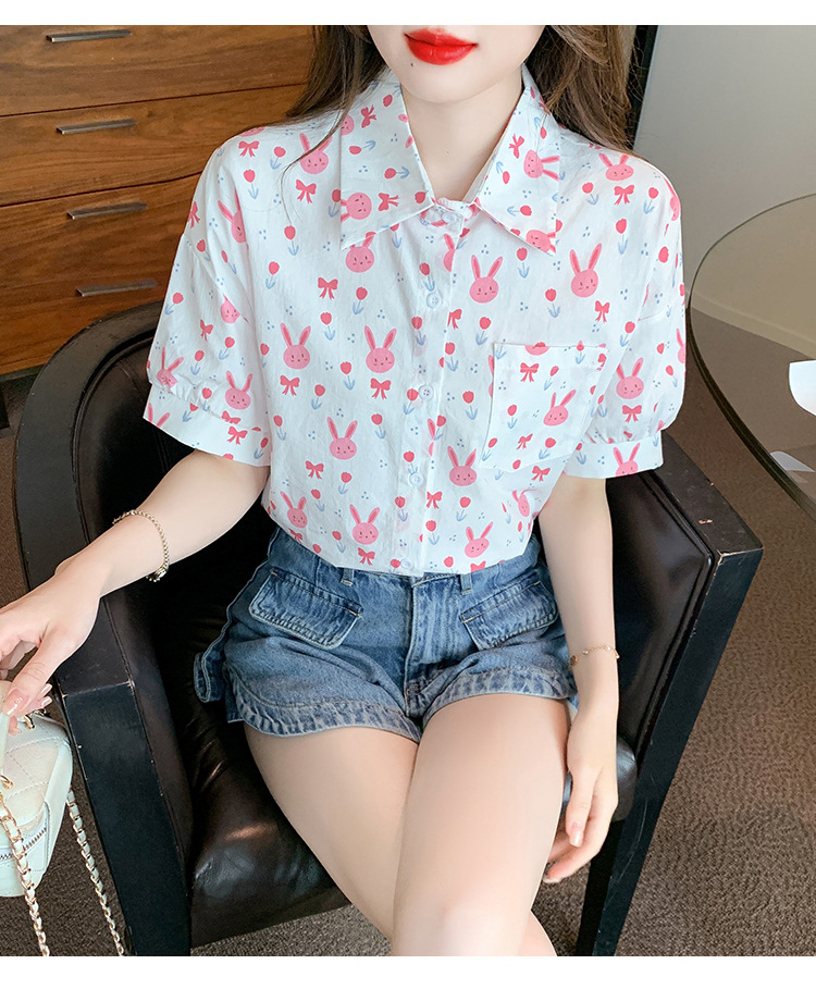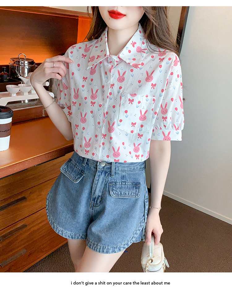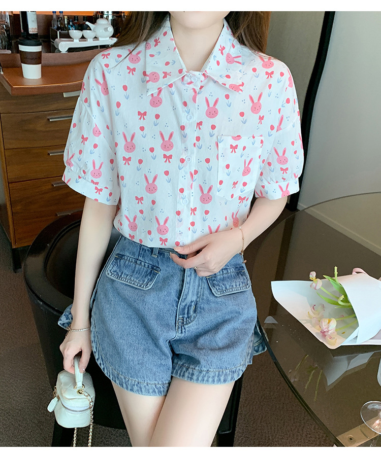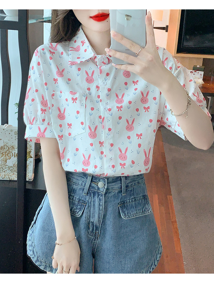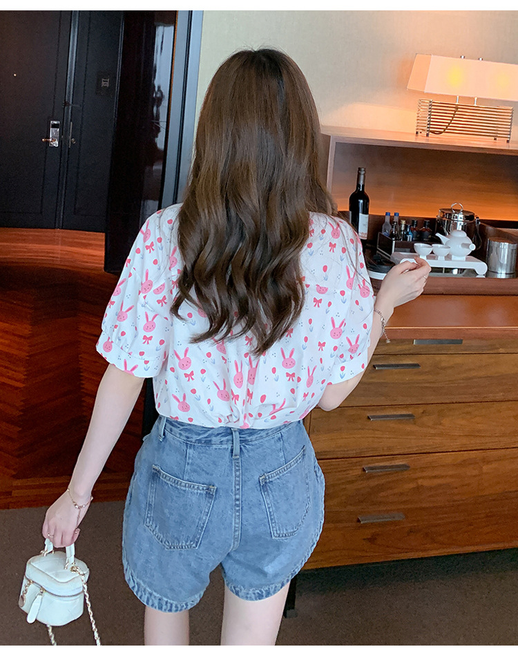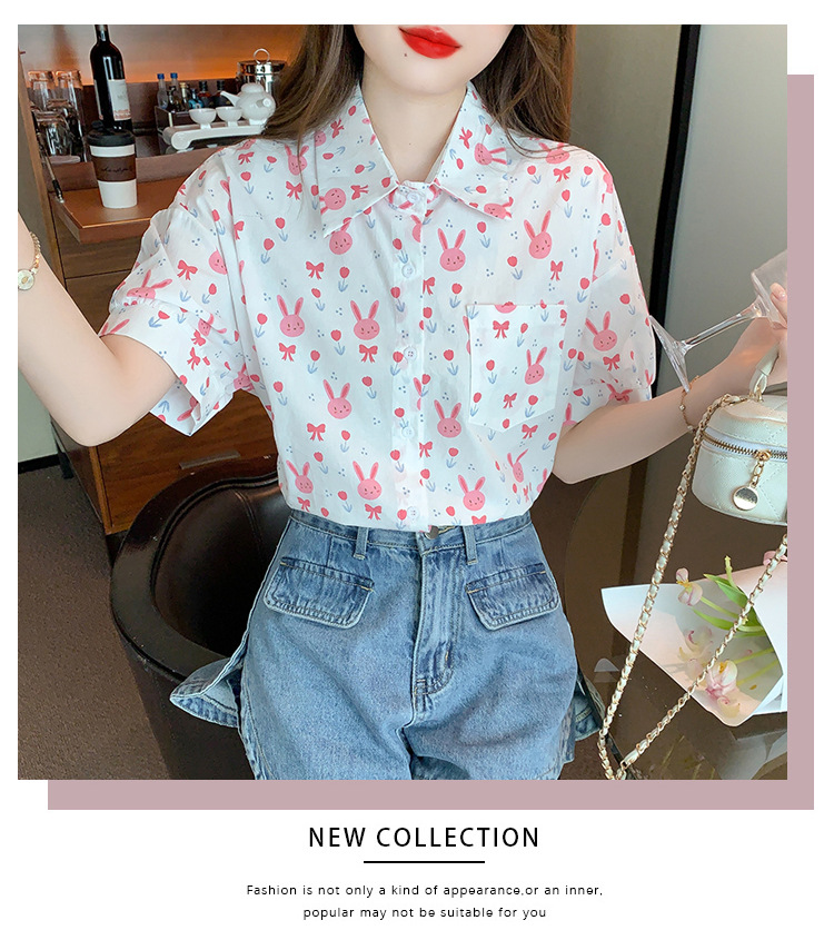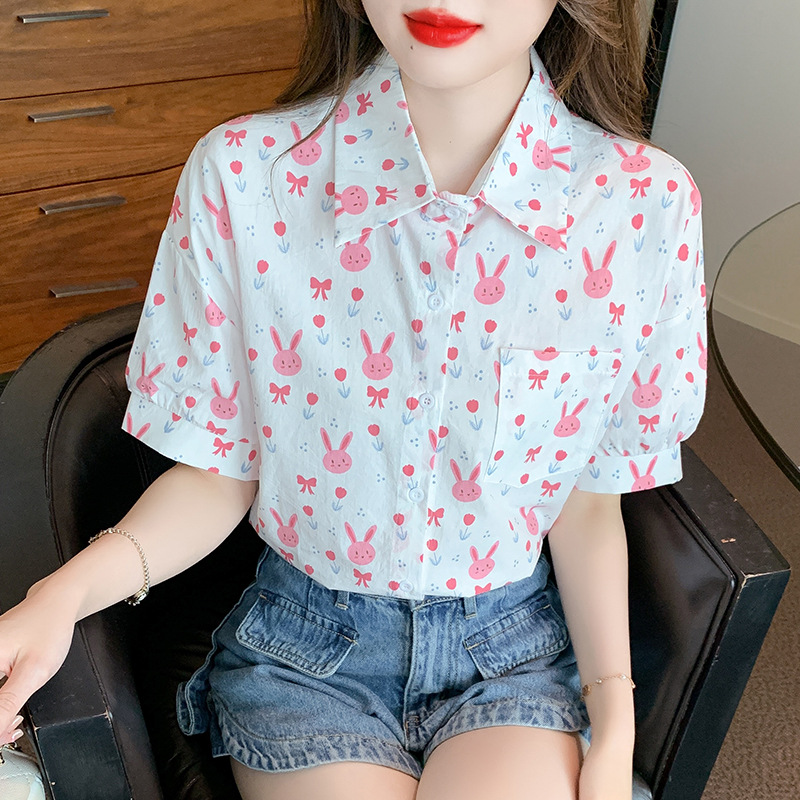 리얼 샷 2024 여름 새로운 한국 스타일 느슨한 디자인 센스 틈새 달콤한 만화 인쇄 올매치 반팔 셔츠