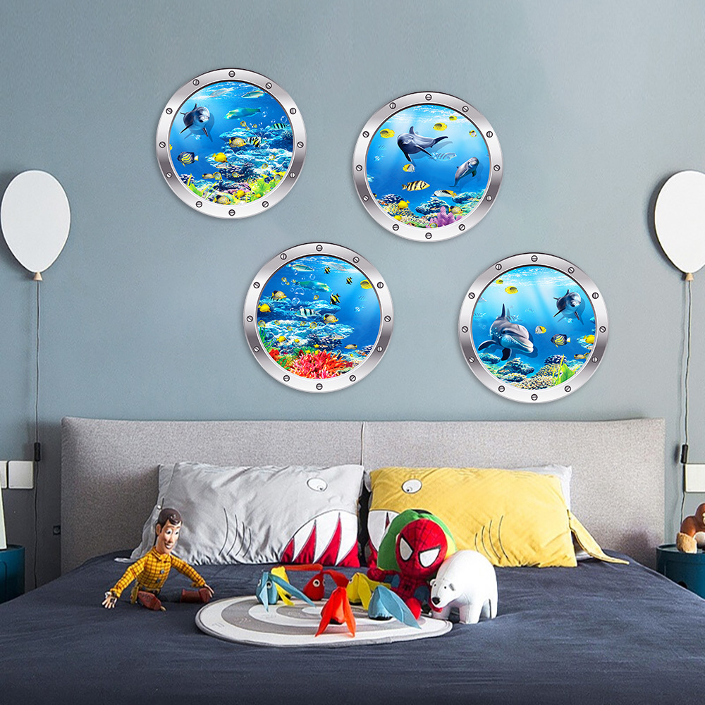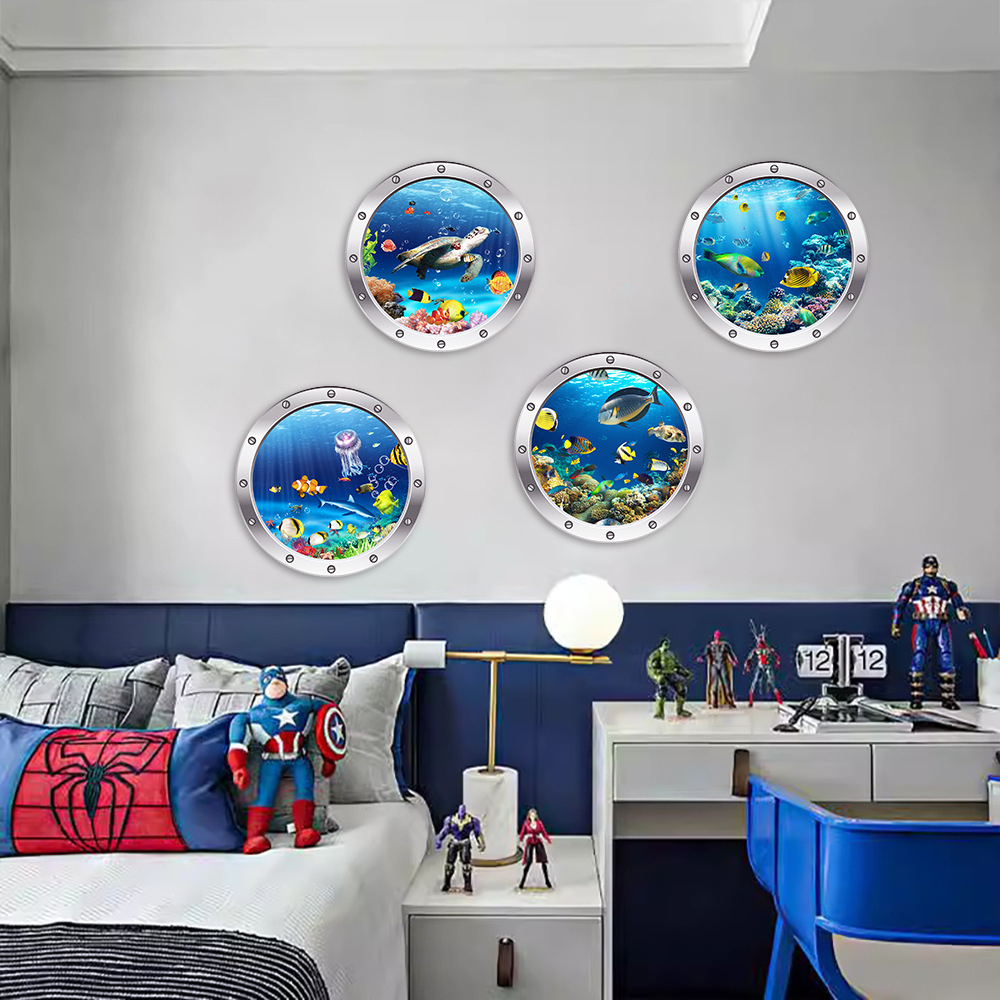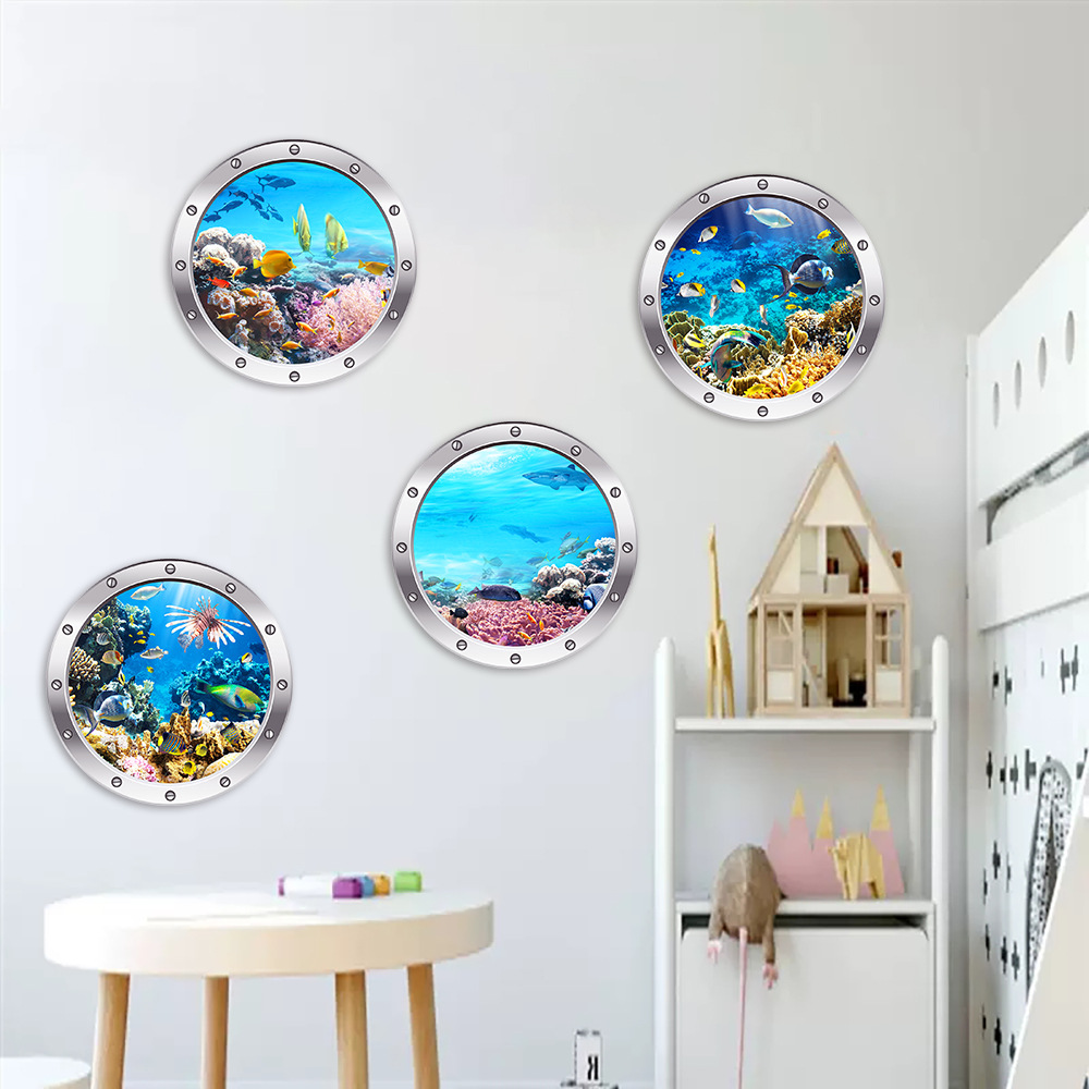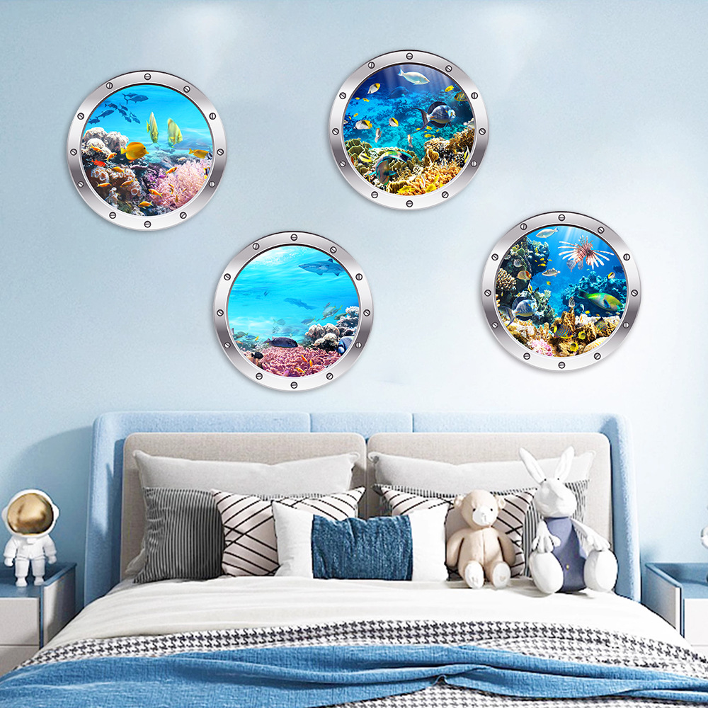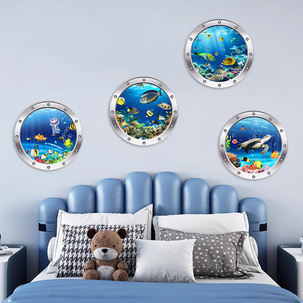 4 조각 수중 세계 잠수함 가짜 창 스티커 침실 침대 옆 어린이 방 크리스탈 하드 조각 장식 벽 스티커