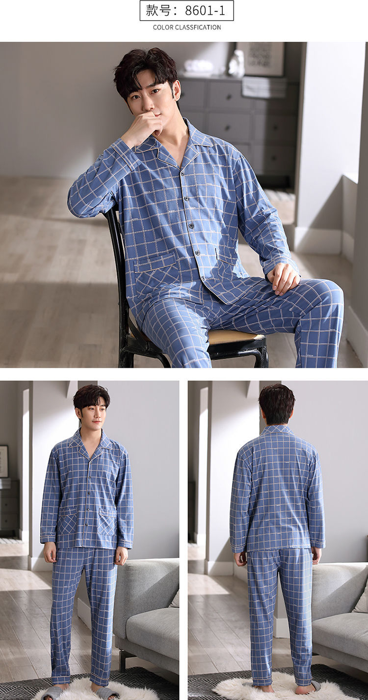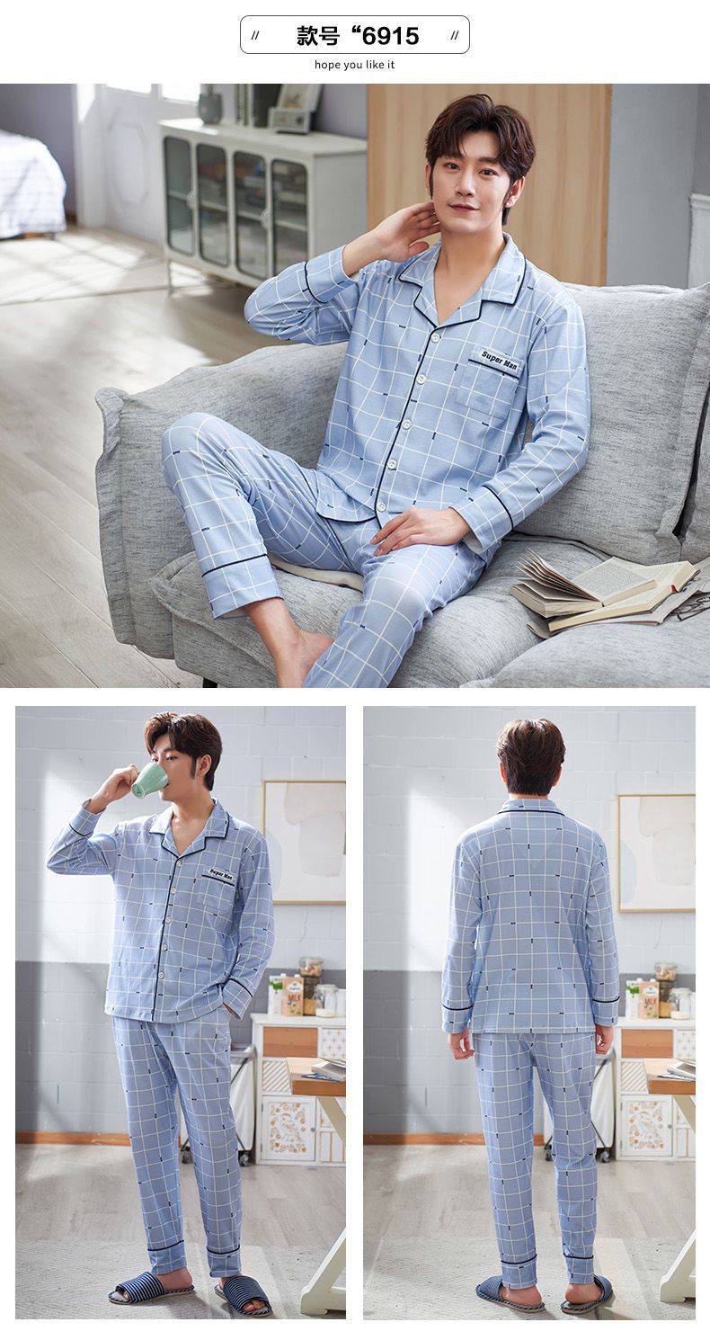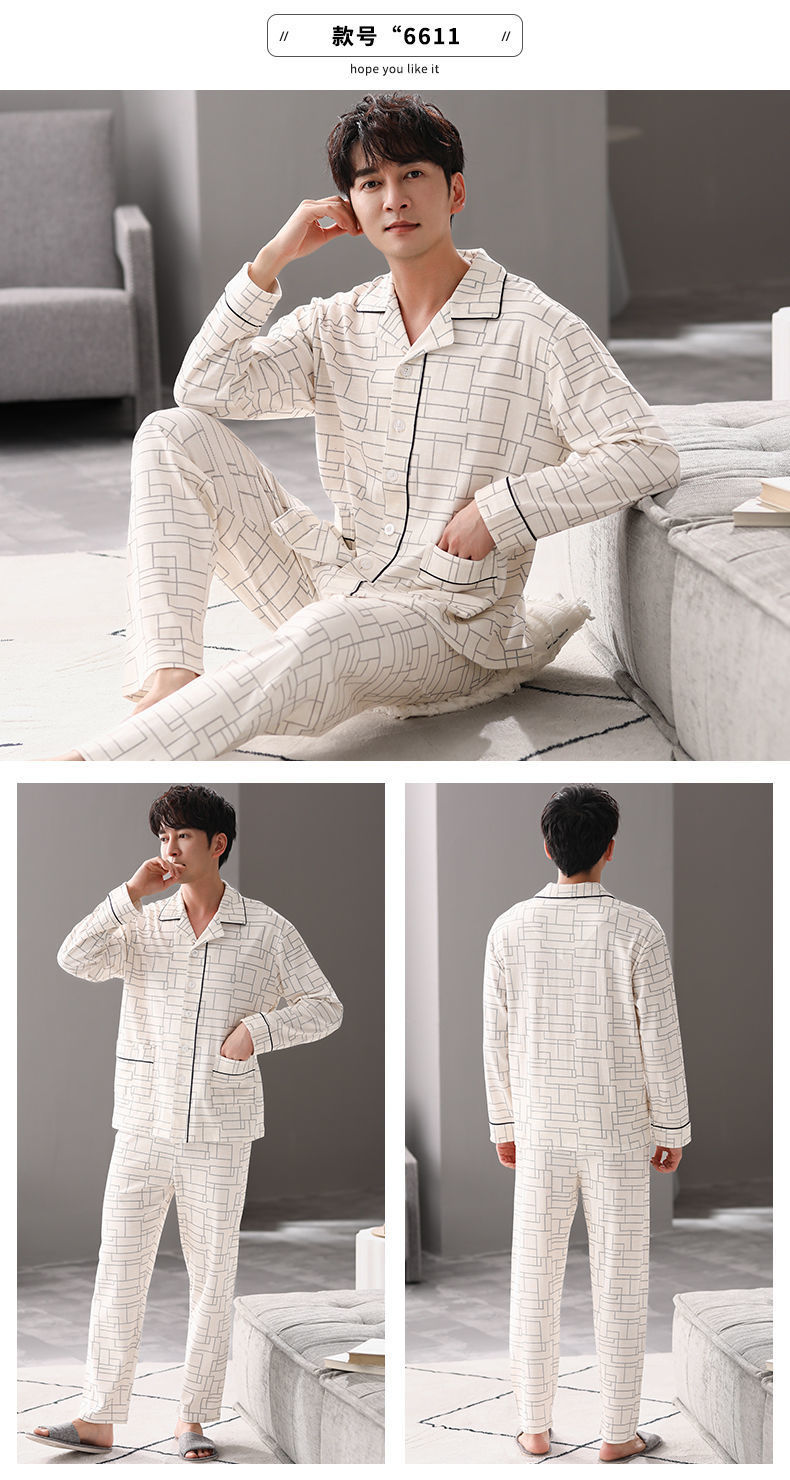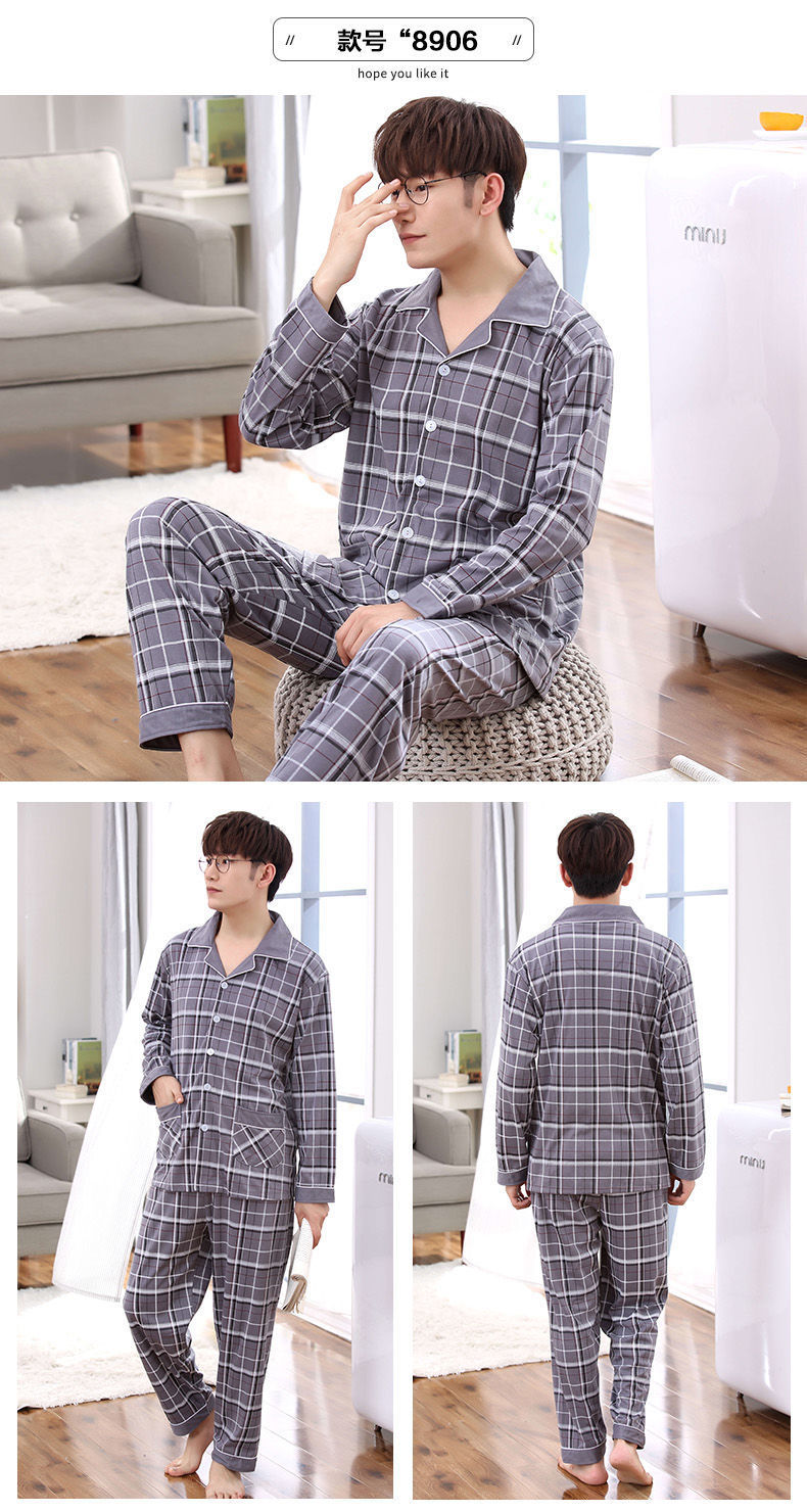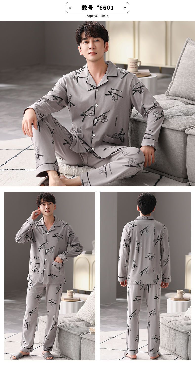 남자의 100% 면 잠옷 긴 소매 옷깃 카디건 면 세트 봄과 가을 플러스 사이즈 청소년 중년 및 노인 가정 의류스토어 가기