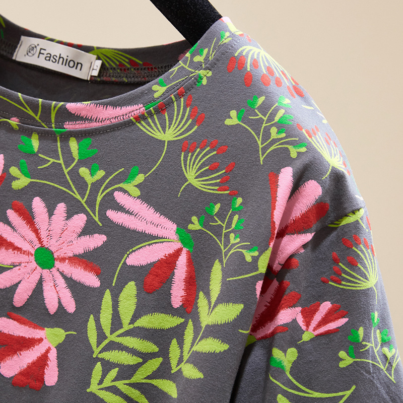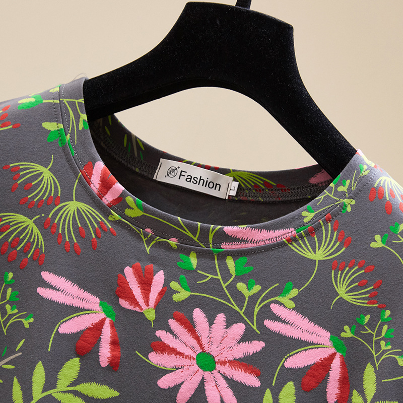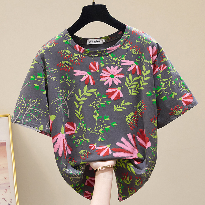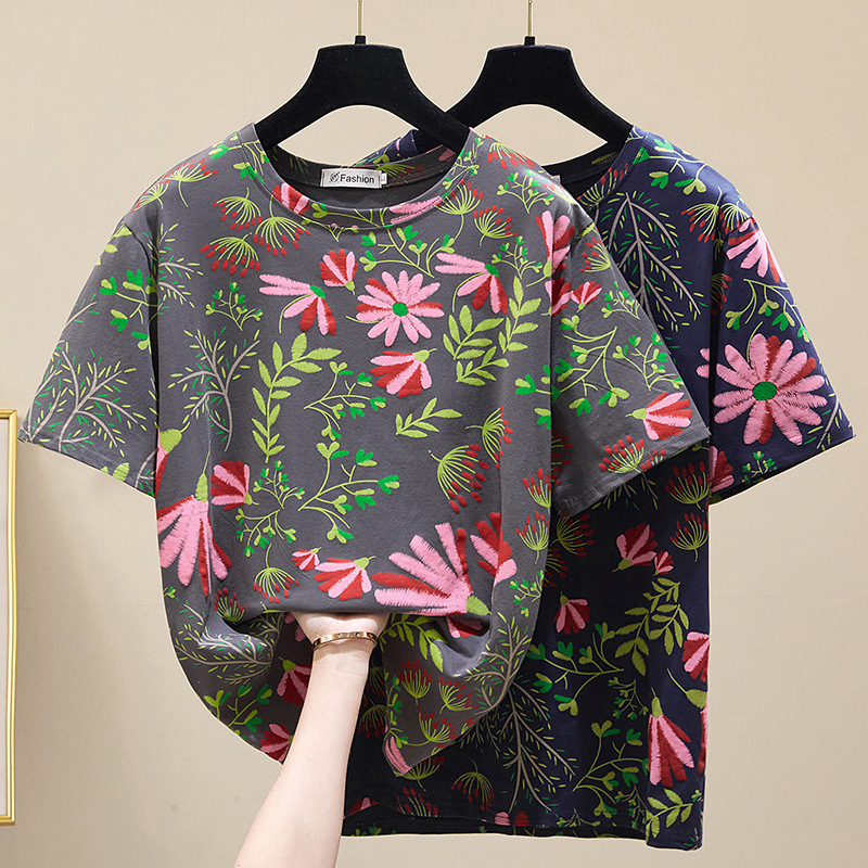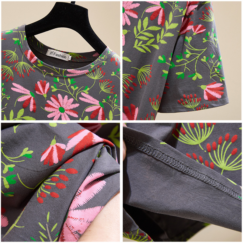 대형 여성용 캐주얼 반팔 티셔츠 여성용 2024 여름 뚱뚱한 소녀의 인쇄 된 둥근 목 느슨한 슬리밍 탑 티셔츠
