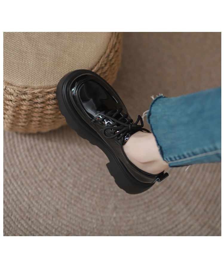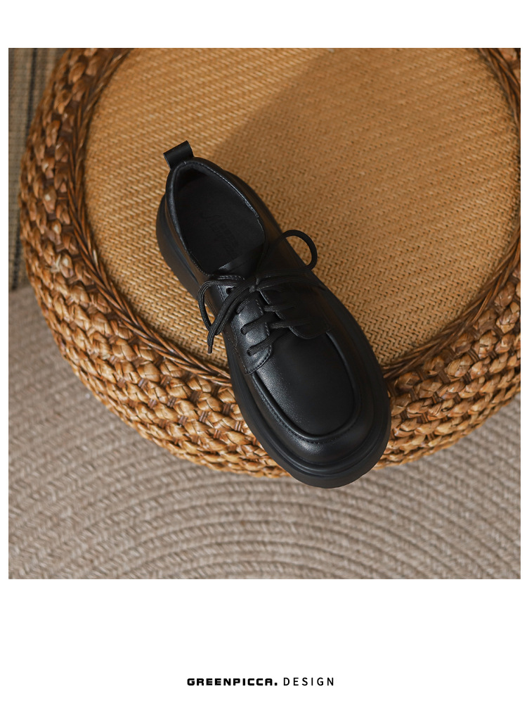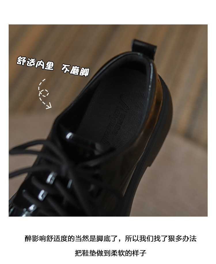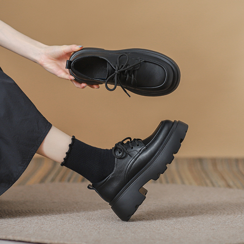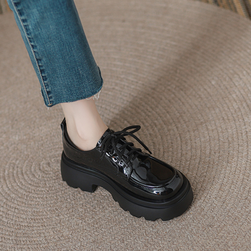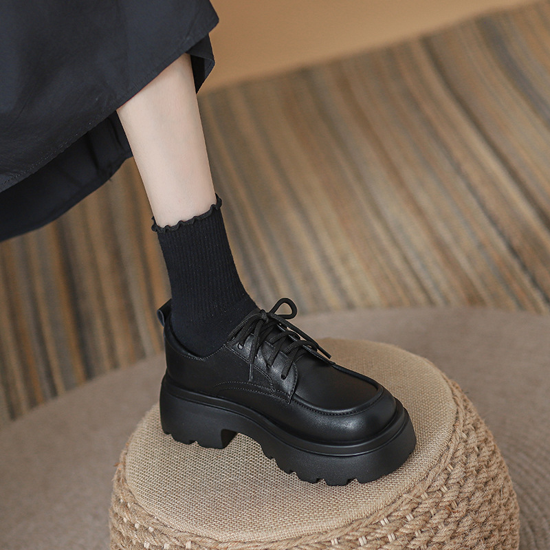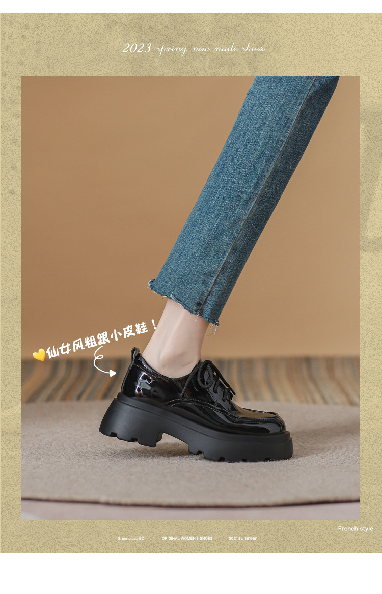 가죽 로퍼 여성용 2023 새로운 청키 힐 영국 스타일 작은 가죽 신발 여성용 기모 레이스 업 두꺼운 블랙 싱글 레이어 신발스토어 가기