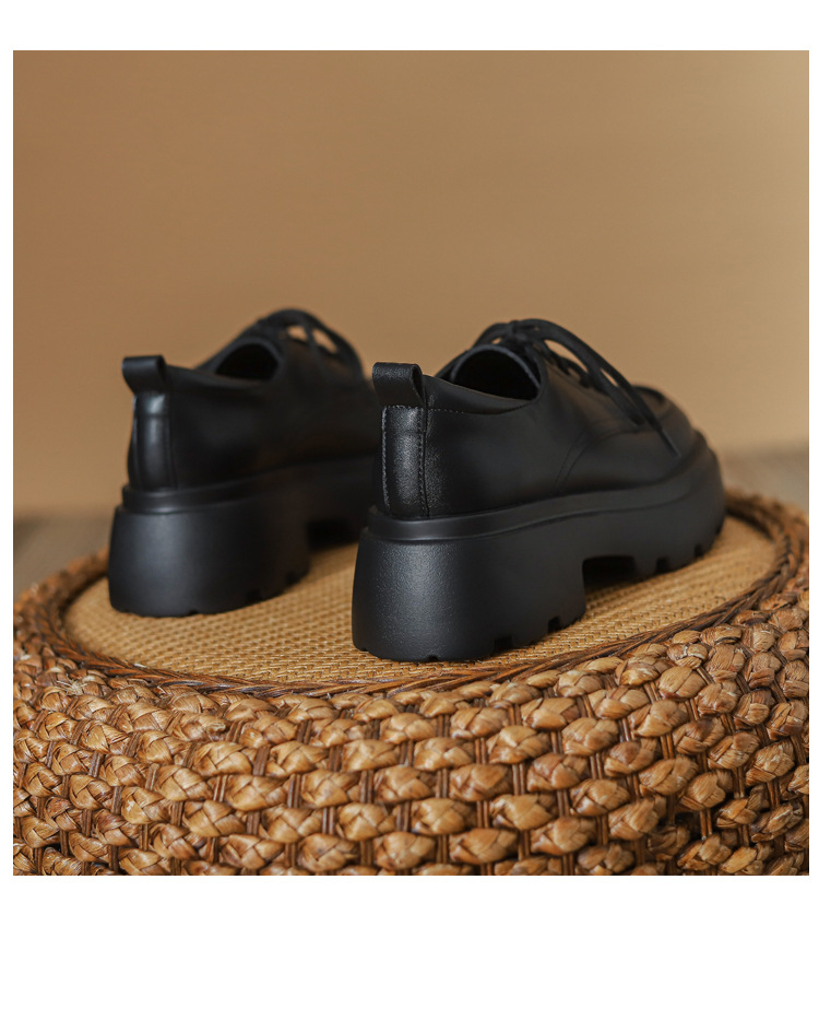 가죽 로퍼 여성용 2023 새로운 청키 힐 영국 스타일 작은 가죽 신발 여성용 기모 레이스 업 두꺼운 블랙 싱글 레이어 신발