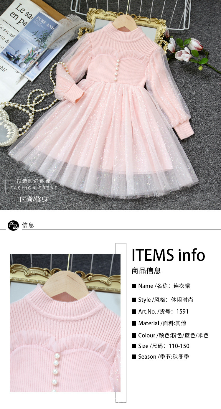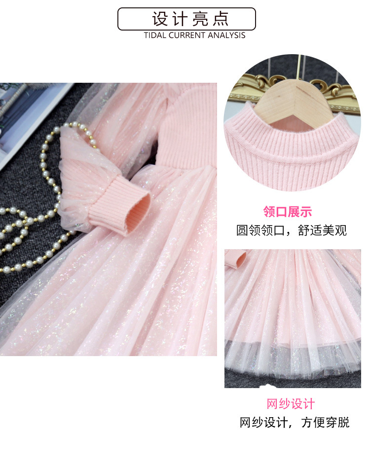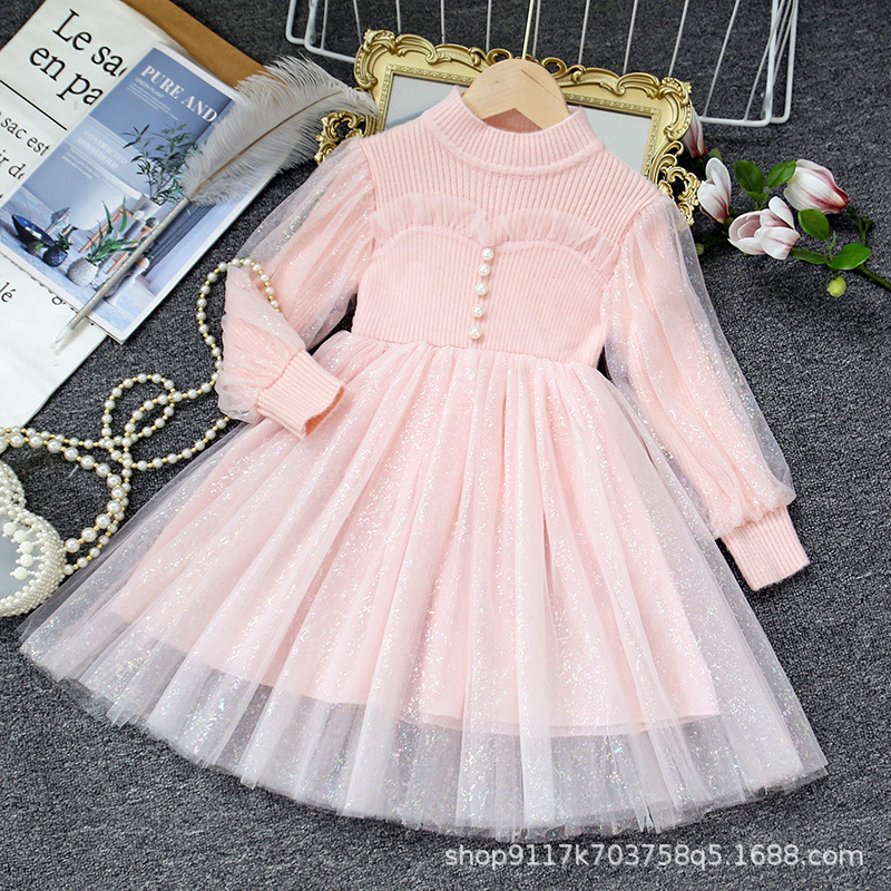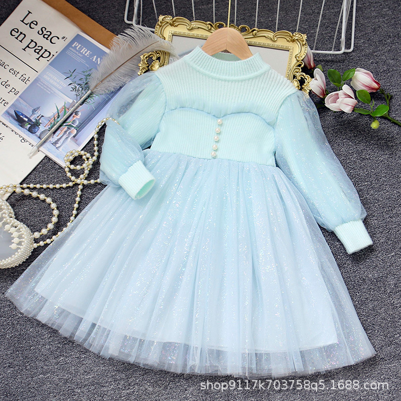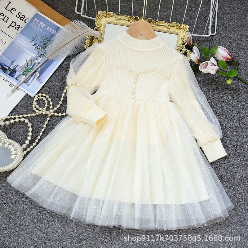 여아 공주 원피스 2023 가을과 겨울 니트 스티치 메쉬 원피스 세련된 여아 랜턴 슬리브 요정 원피스