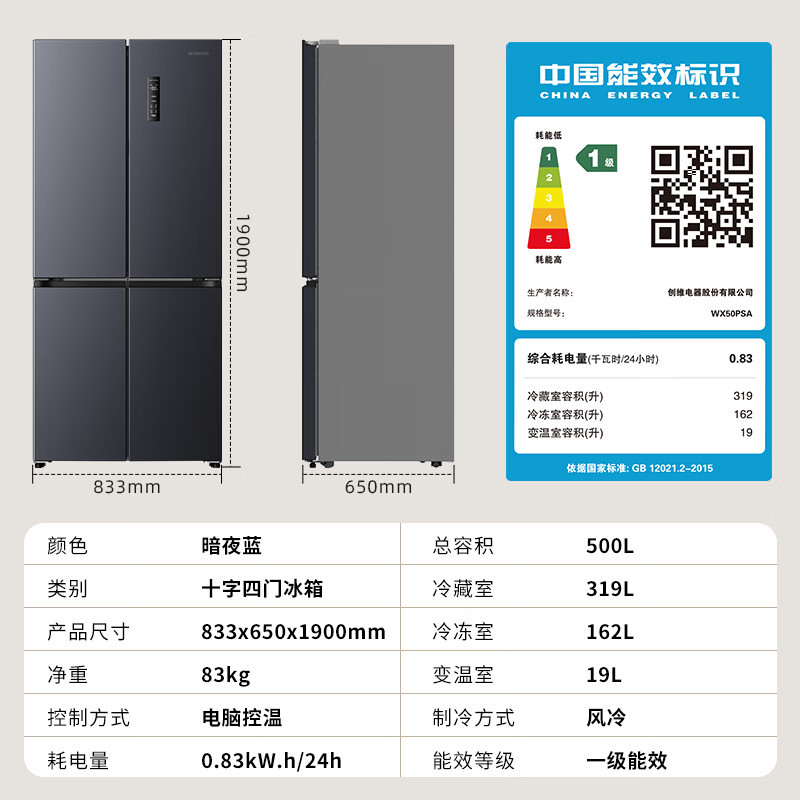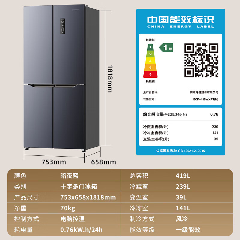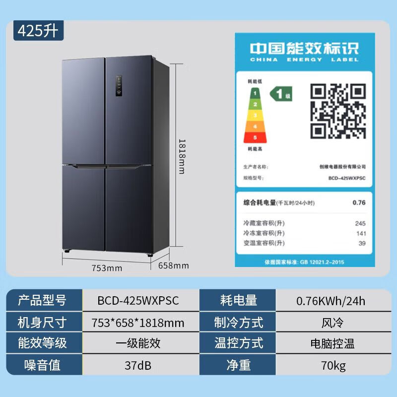 创维十字对开门冰箱变频风冷无霜一级能效智能母婴抗菌电冰箱426L