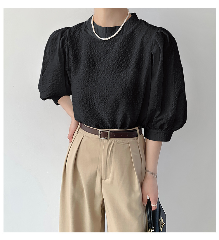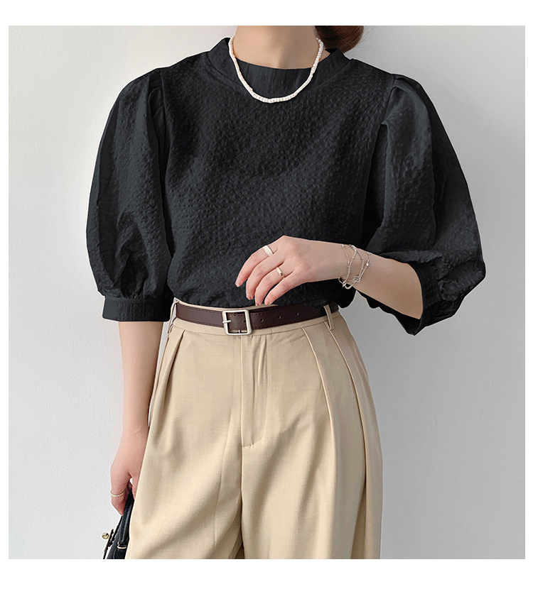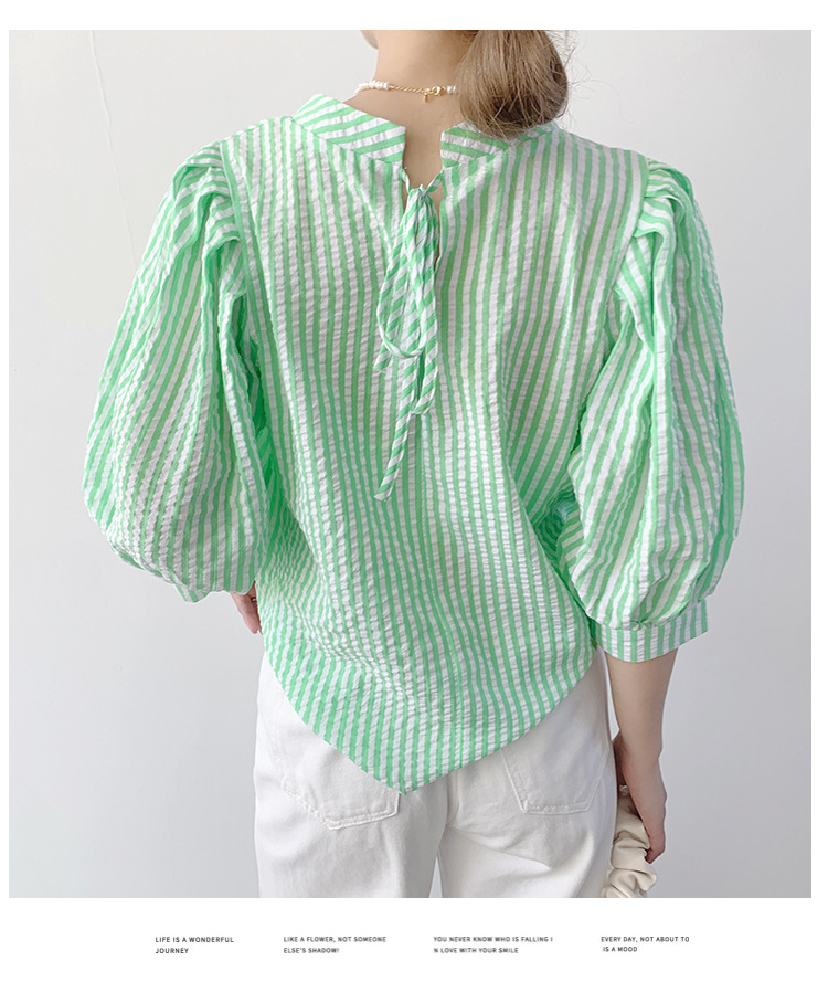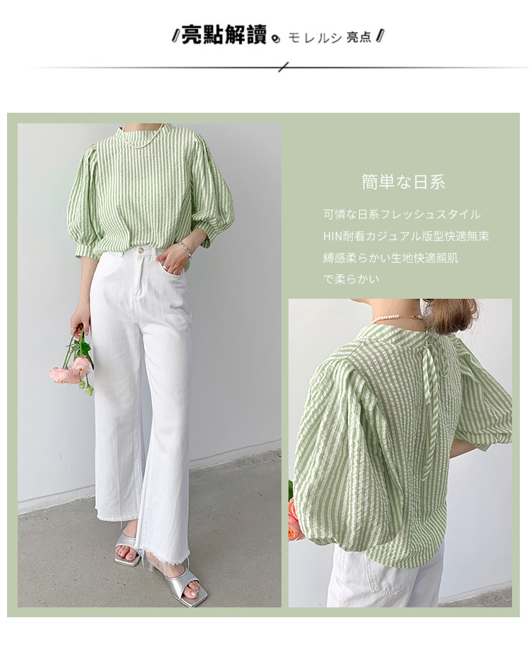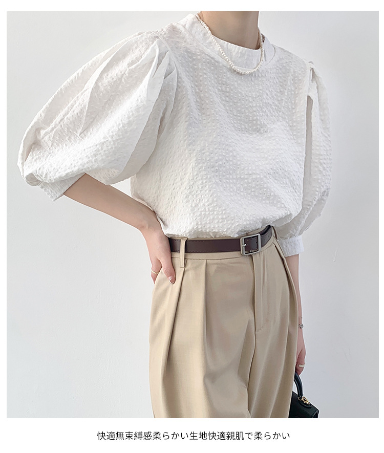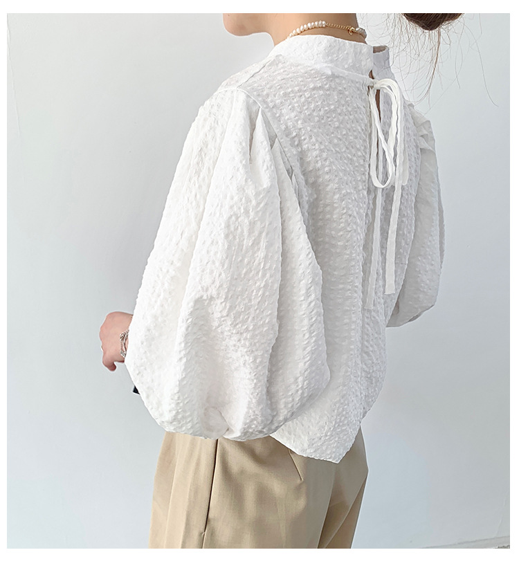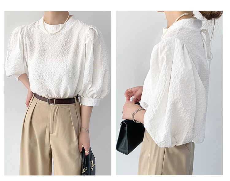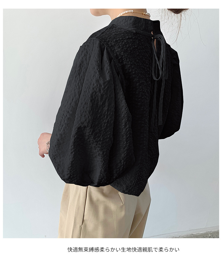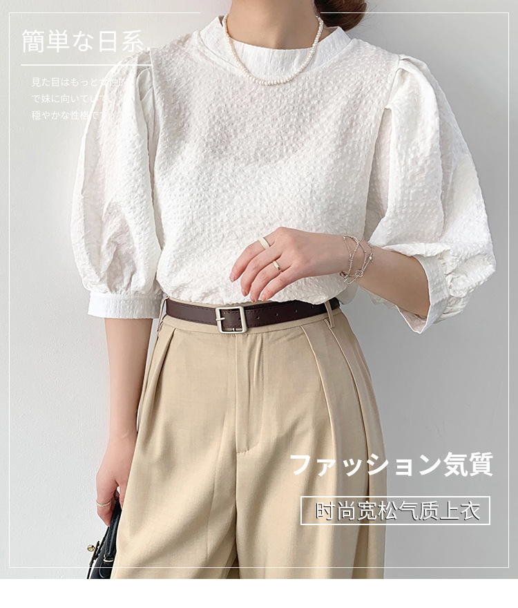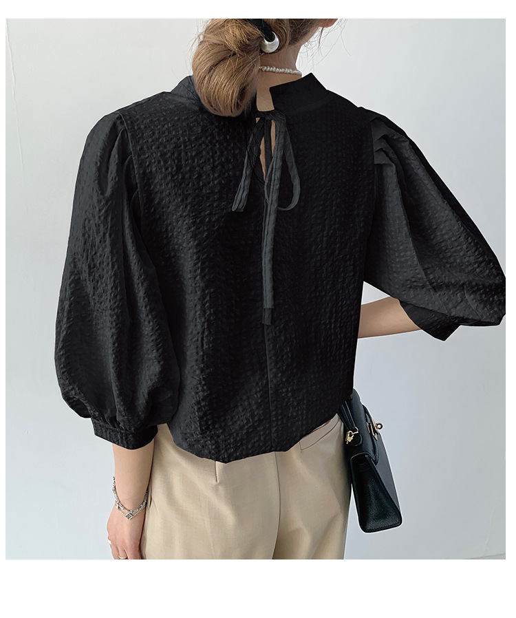 일본풍 여름 라쿠텐 신상품, 우아한 통근 스타일 퍼프소매 5부소매 레이스업 쉬폰 셔츠 여성 상의