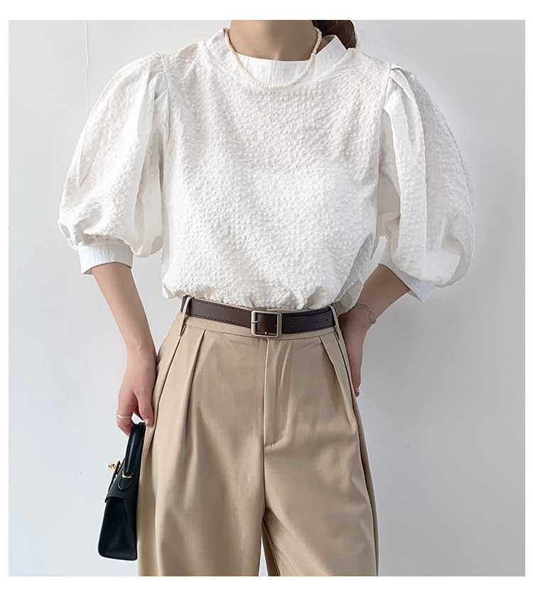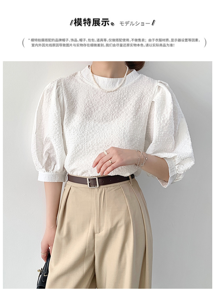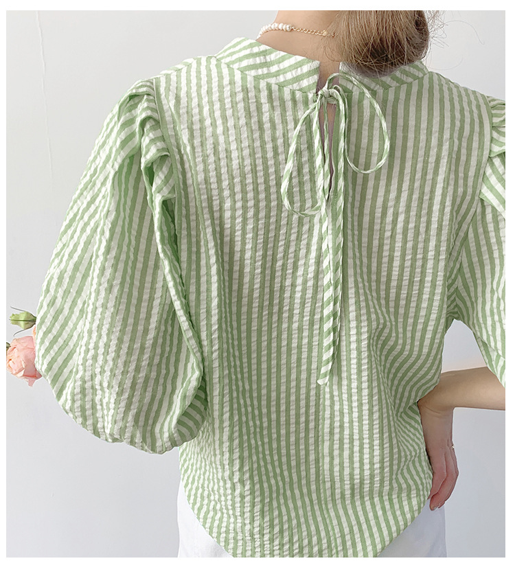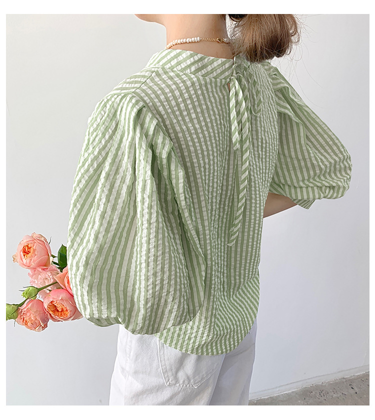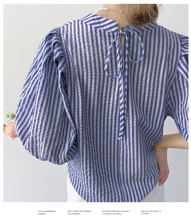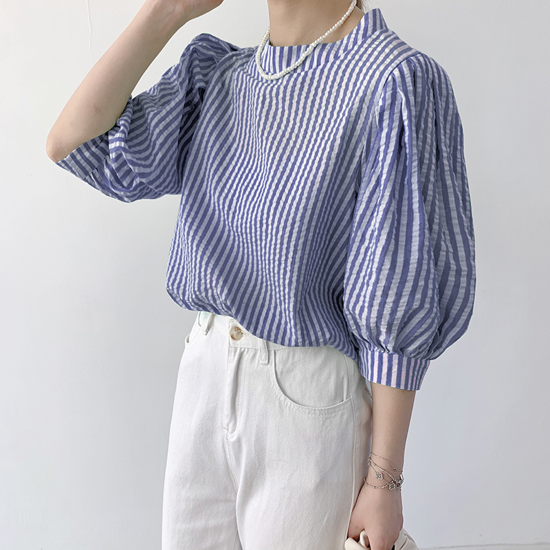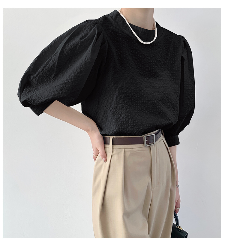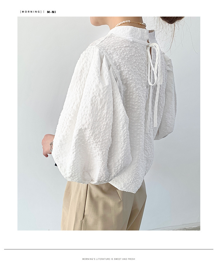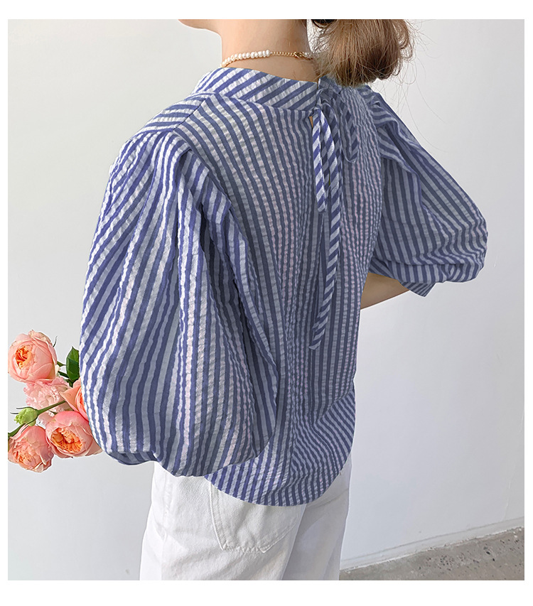 일본풍 여름 라쿠텐 신상품, 우아한 통근 스타일 퍼프소매 5부소매 레이스업 쉬폰 셔츠 여성 상의