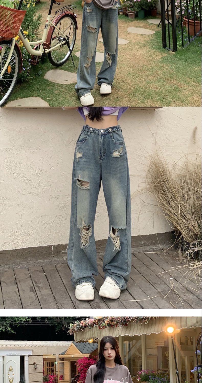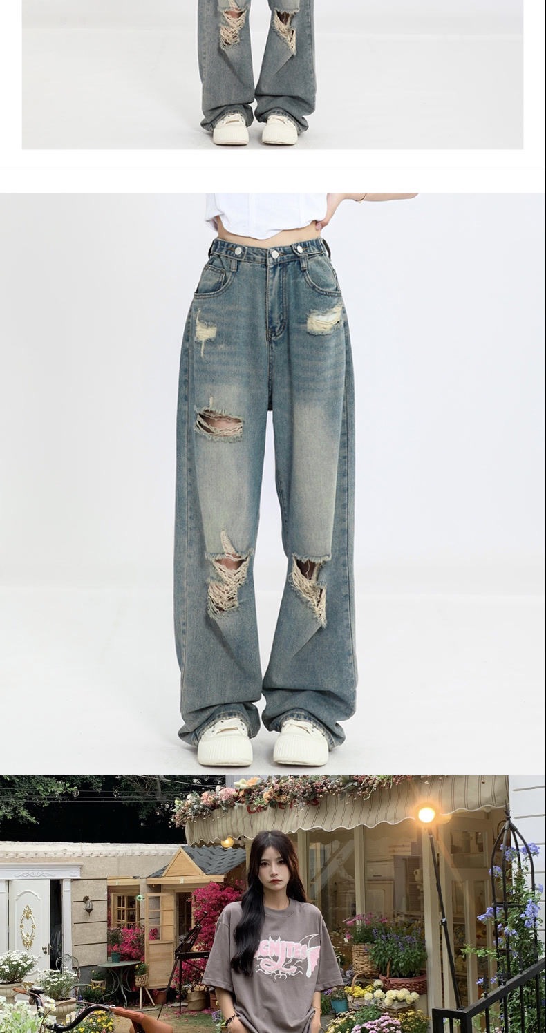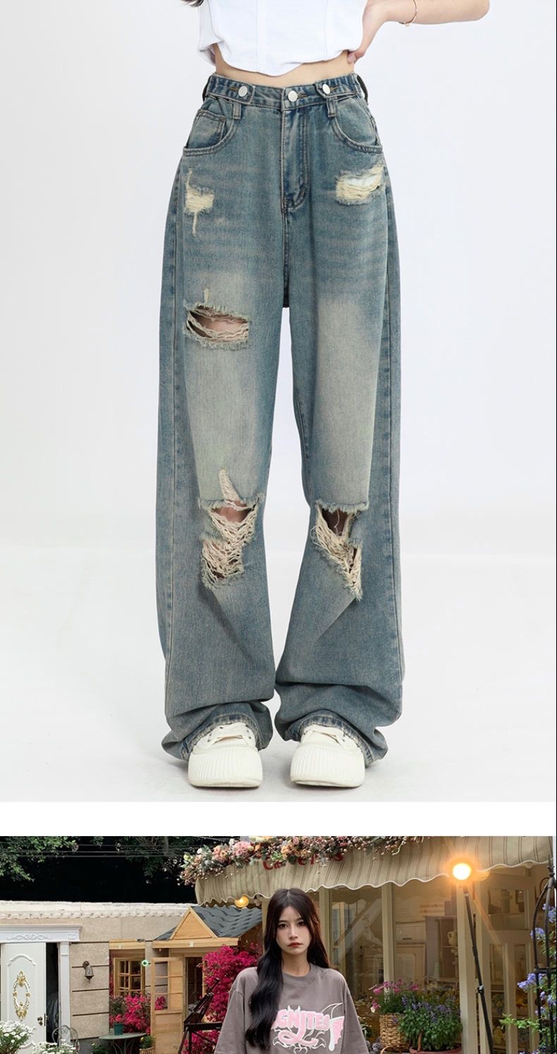 미국 레트로 스타일 찢어진 청바지 여성용 하이웨이스트 스트레이트 루즈핏 와이드 레그 바지 캐주얼하고 다재다능하며 패셔너블스토어 가기