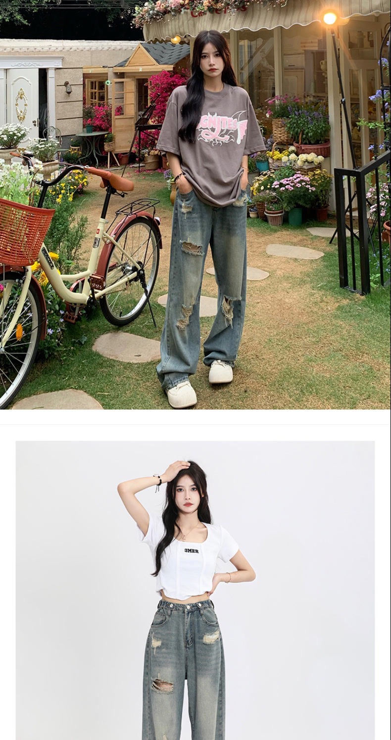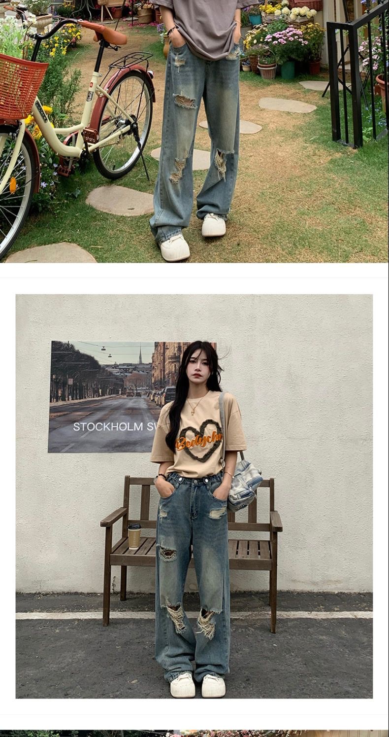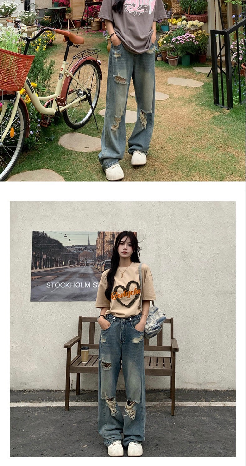 미국 레트로 스타일 찢어진 청바지 여성용 하이웨이스트 스트레이트 루즈핏 와이드 레그 바지 캐주얼하고 다재다능하며 패셔너블스토어 가기
