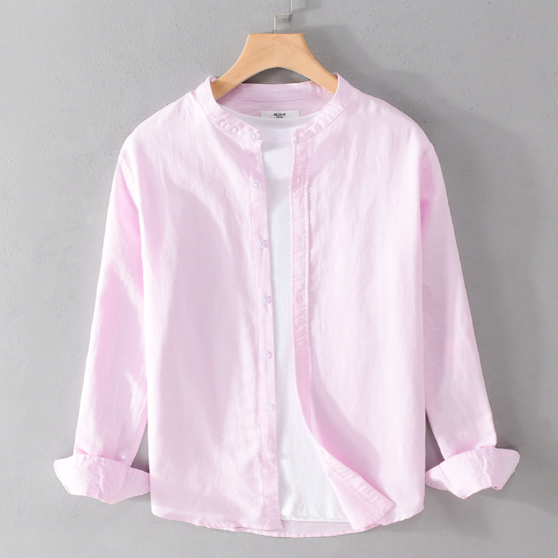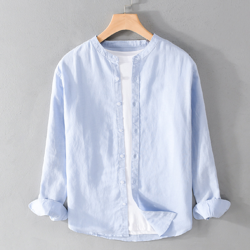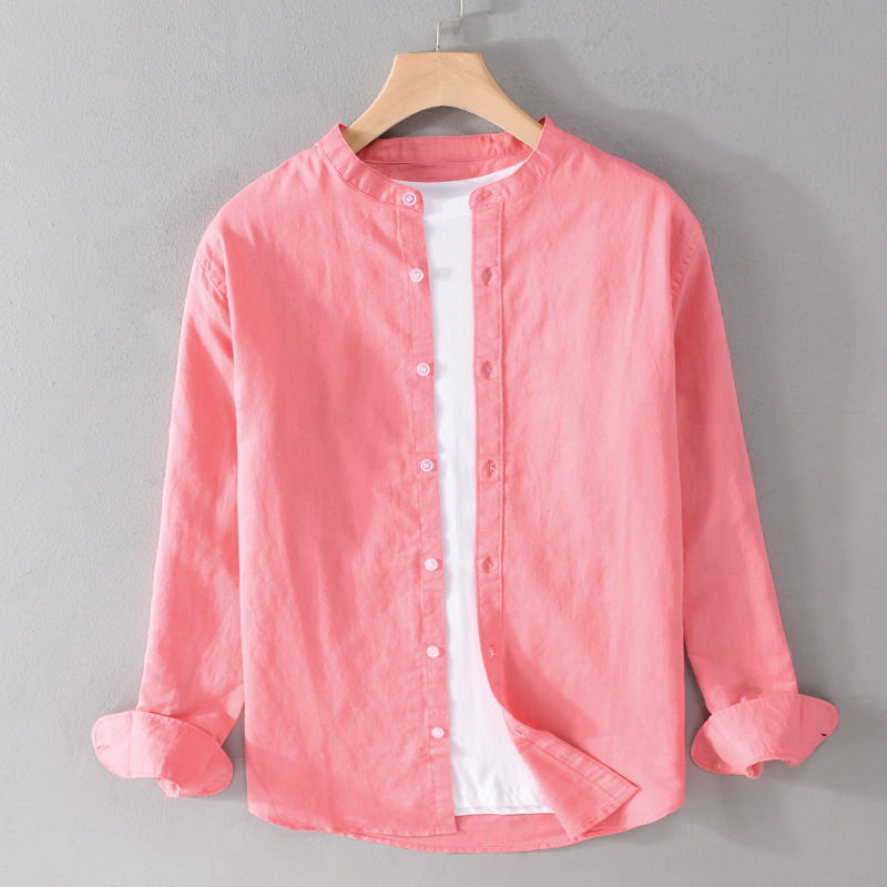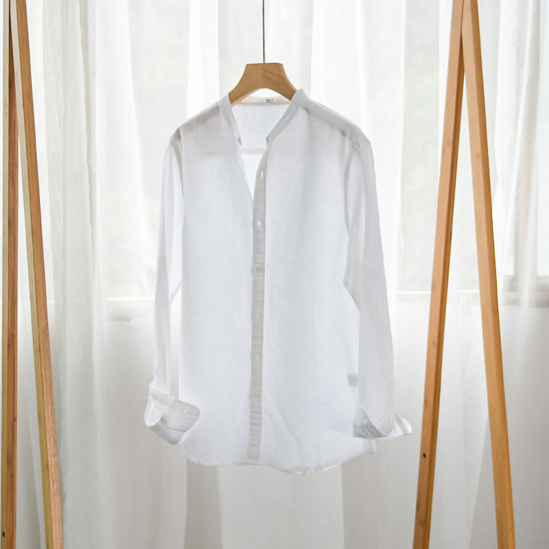 남성 캐주얼 긴팔 코튼 린넨 셔츠 작은 스탠드 칼라 청소년 린넨 아트 셔츠 9207스토어 가기