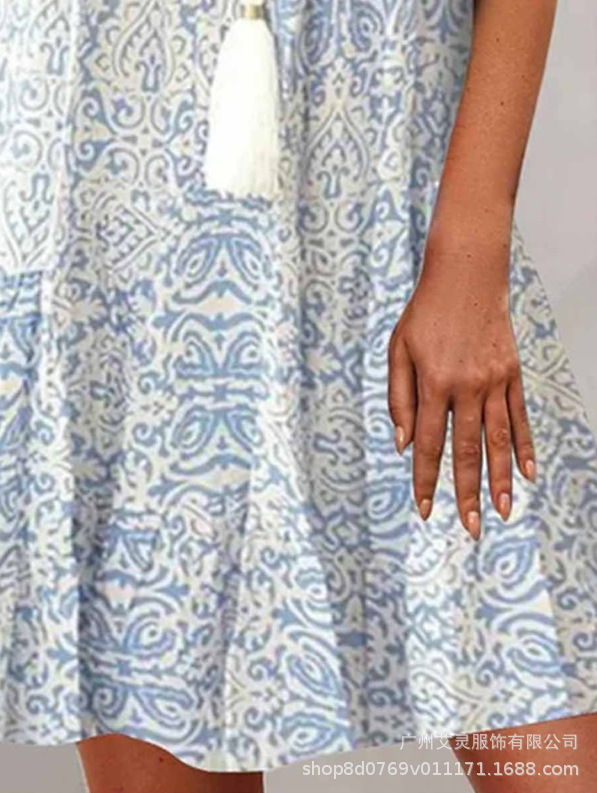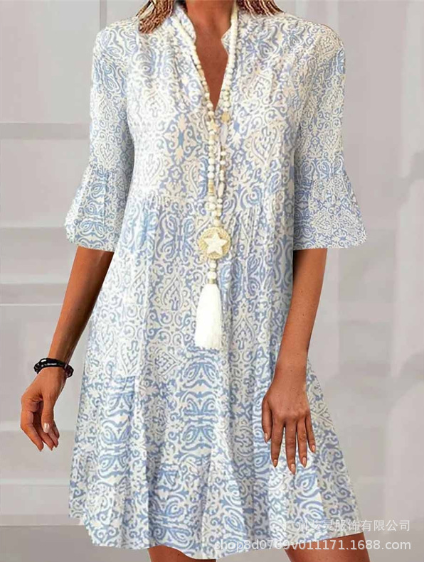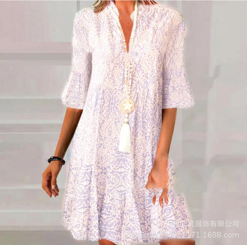 2023 새로운 여름 스타일 아마존 유럽과 미국 여성의 크로스 보더 대외 무역 v 넥 느슨한 5부 소매 프린트 드레스