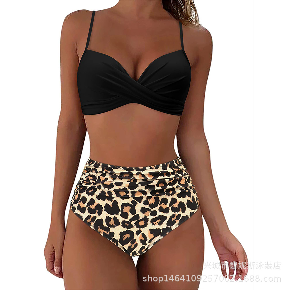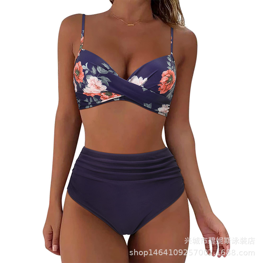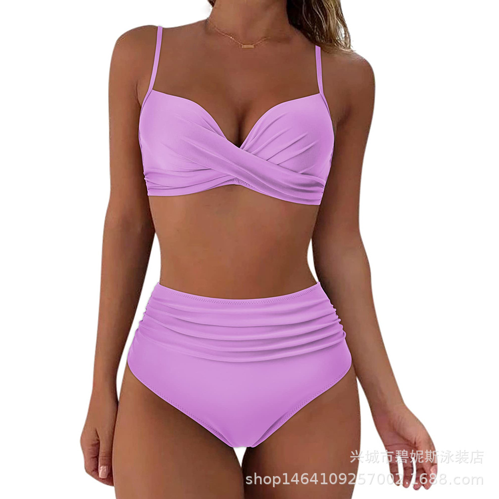 새로운 수영복 스플릿 비키니 단색 크로스 스트랩 아마존 폭발 하이 웨이스트 수영복 유럽과 미국 대외 무역 섹시