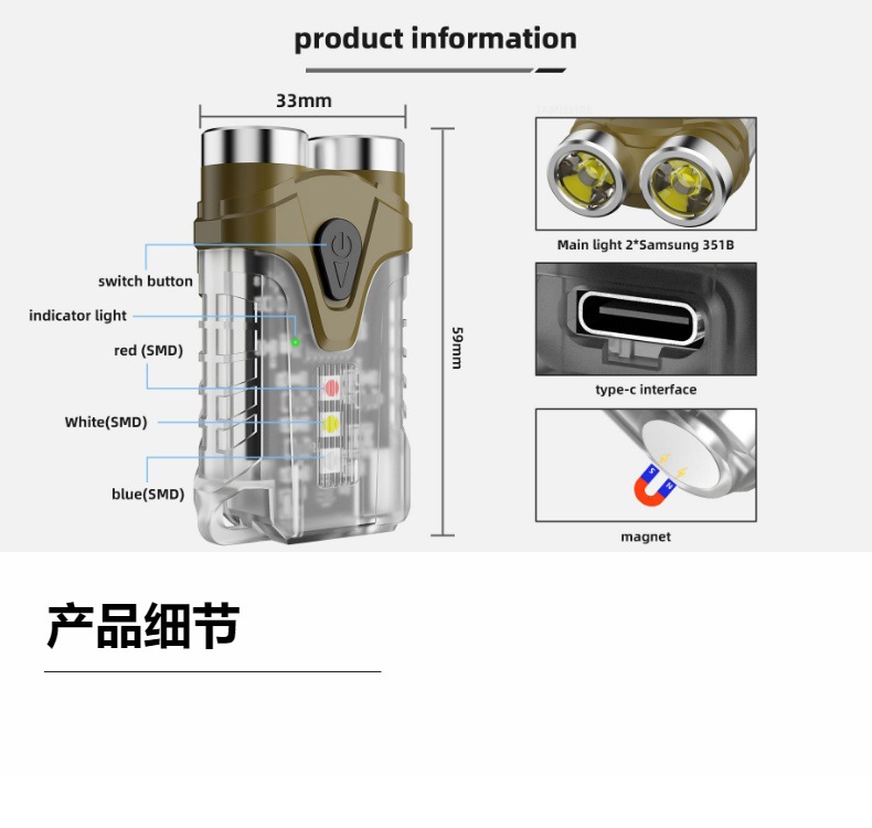 크로스보더 핫세일 듀얼코어 Type-C 충전식 미니 손전등 다기능 키체인 라이트 휴대용 작업등스토어 가기