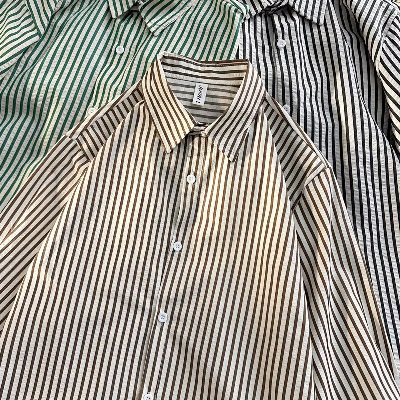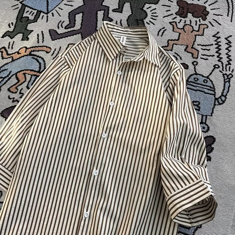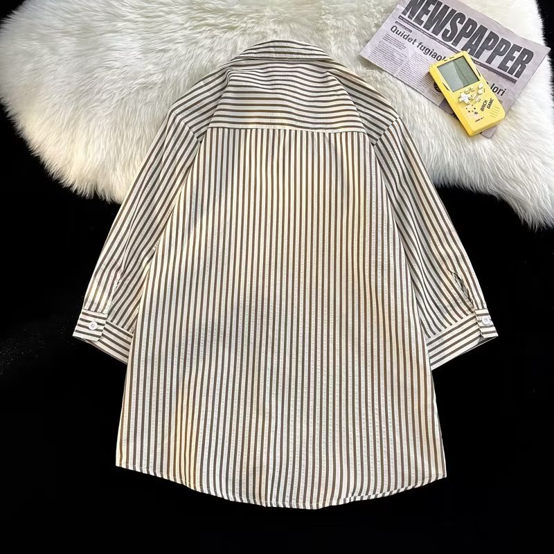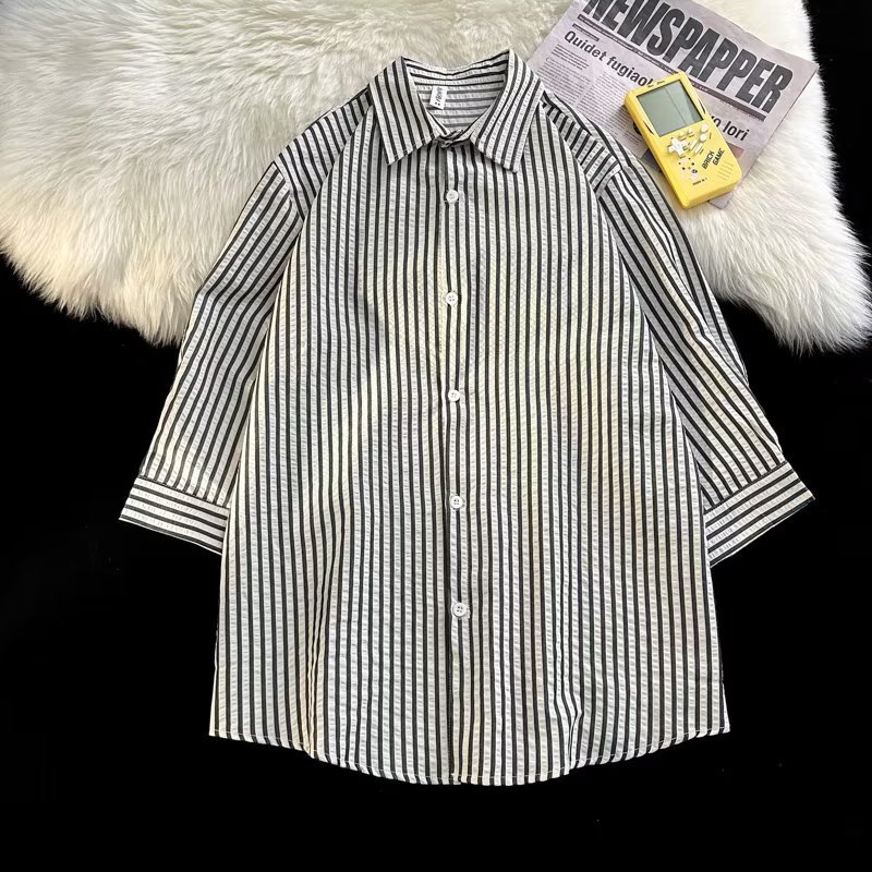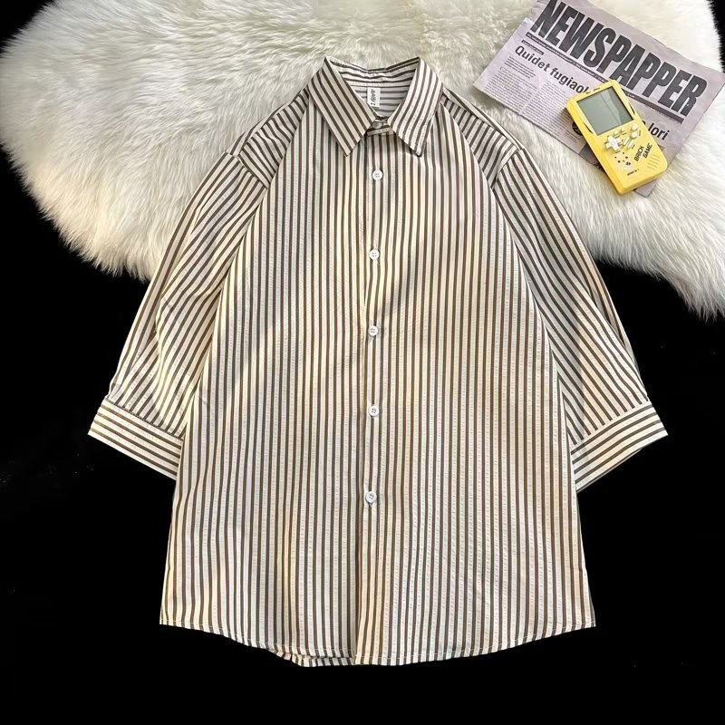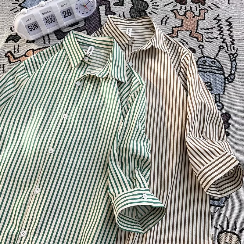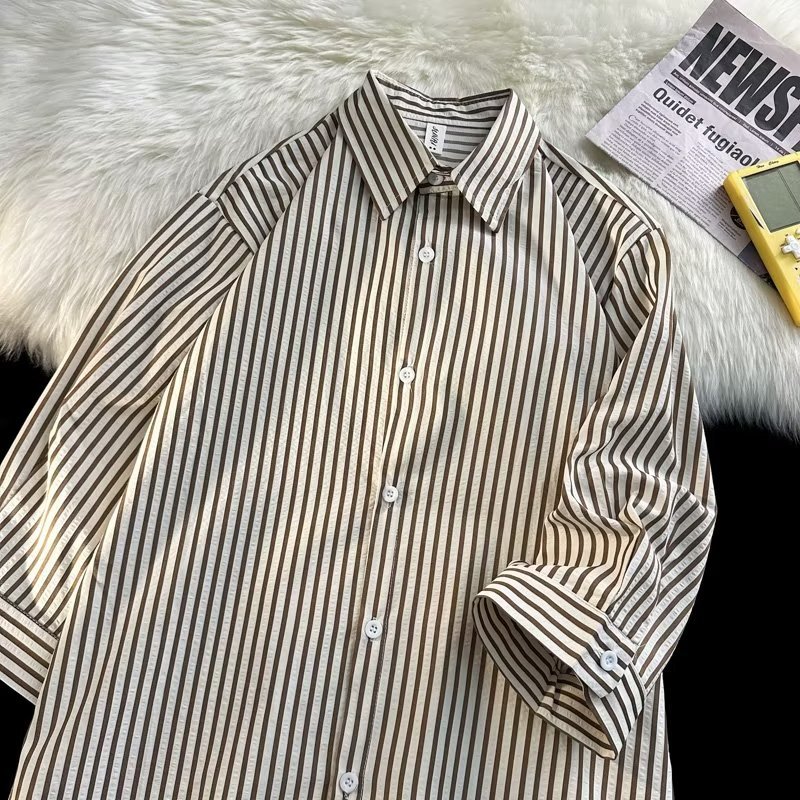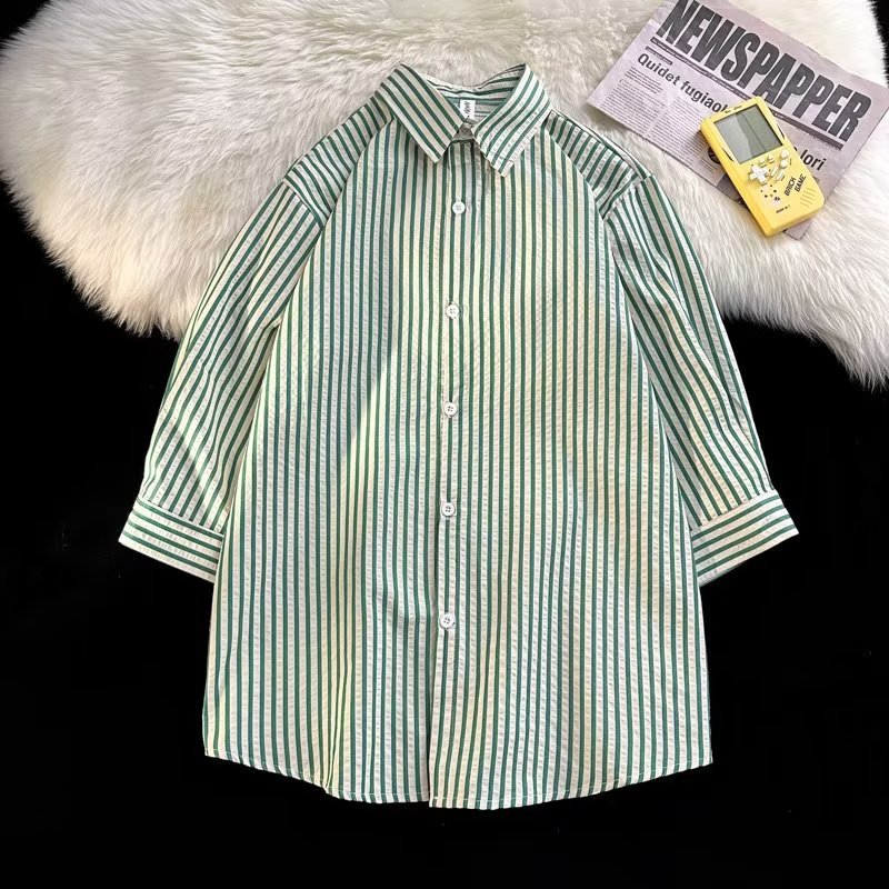 여름 줄무늬 반팔 셔츠 남자 트렌디 브랜드 뉴 남자 세븐 슬리브 탑 하이 엔드 느낌 망가진 잘 생긴 캐주얼 셔츠스토어 가기