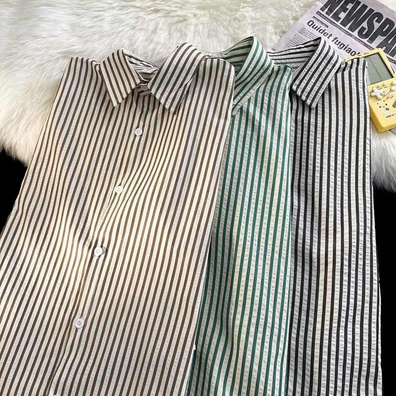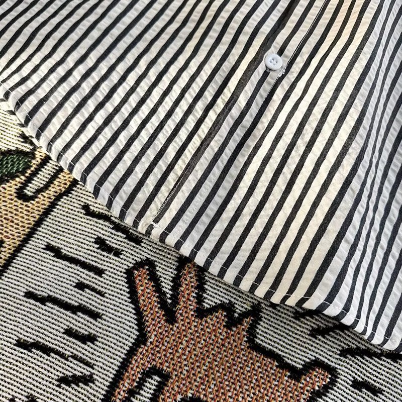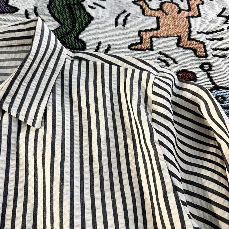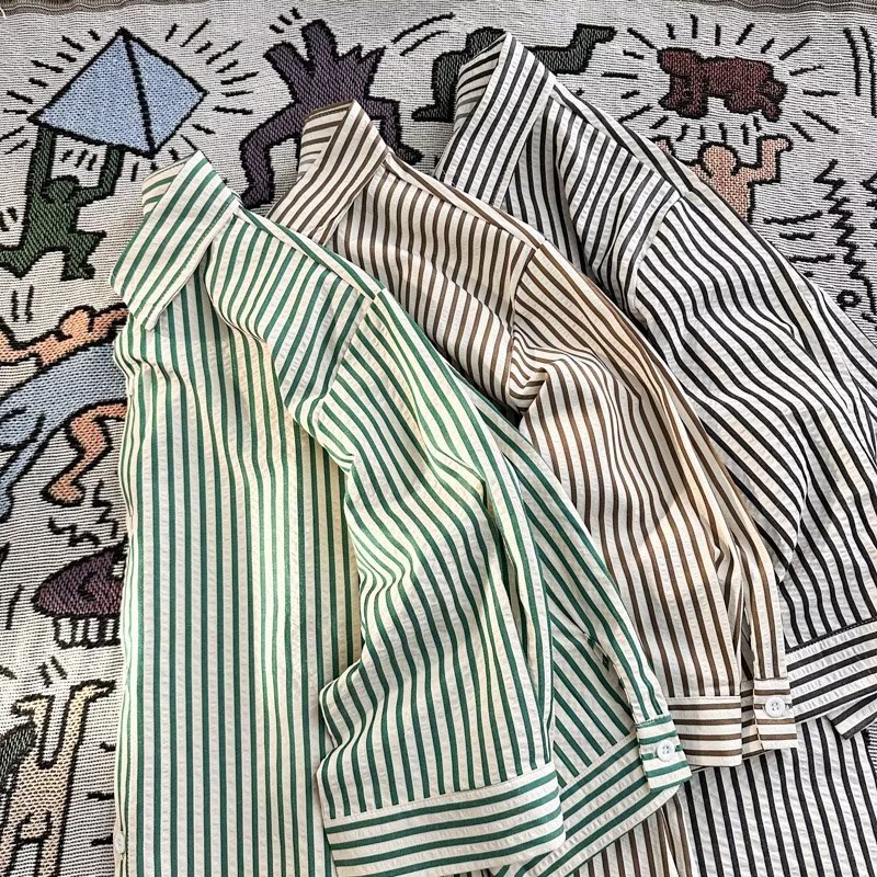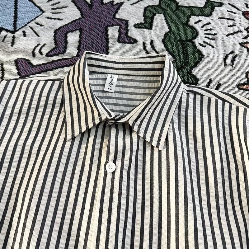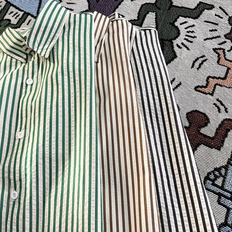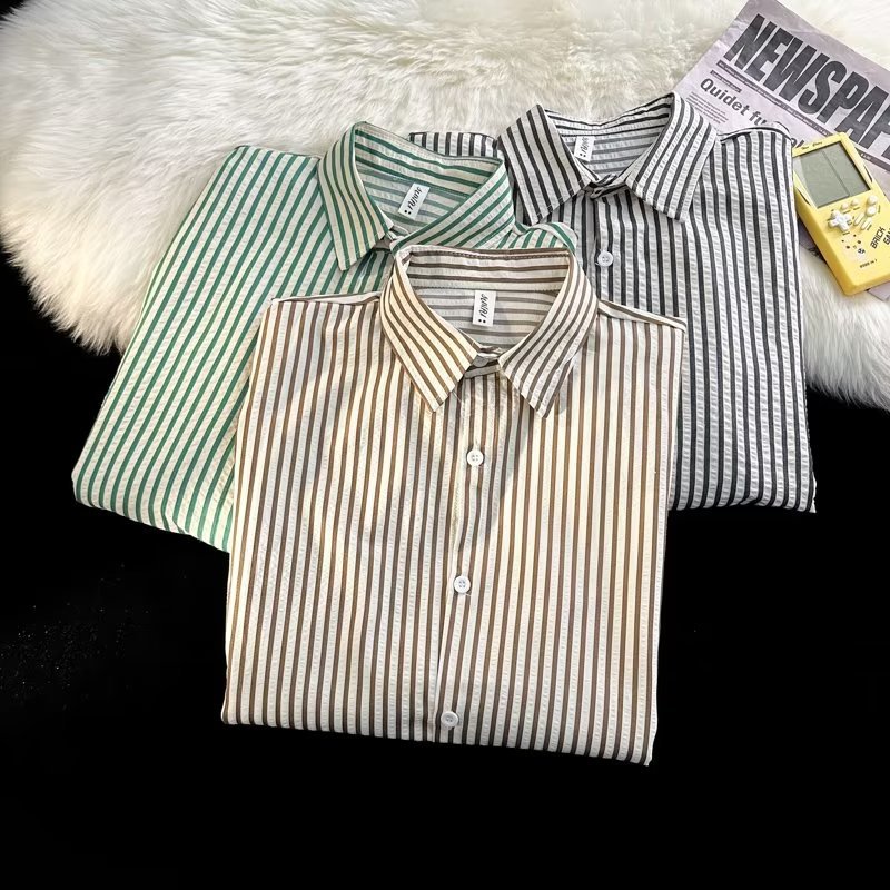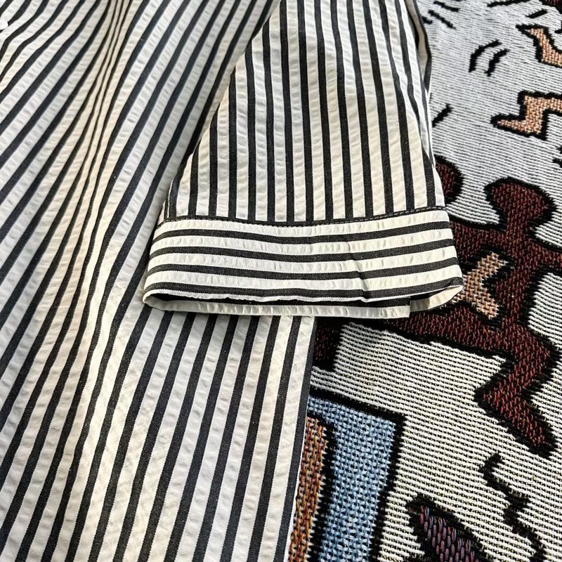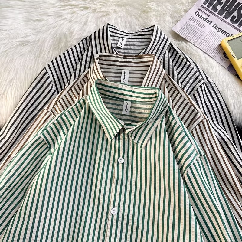 여름 줄무늬 반팔 셔츠 남자 트렌디 브랜드 뉴 남자 세븐 슬리브 탑 하이 엔드 느낌 망가진 잘 생긴 캐주얼 셔츠스토어 가기