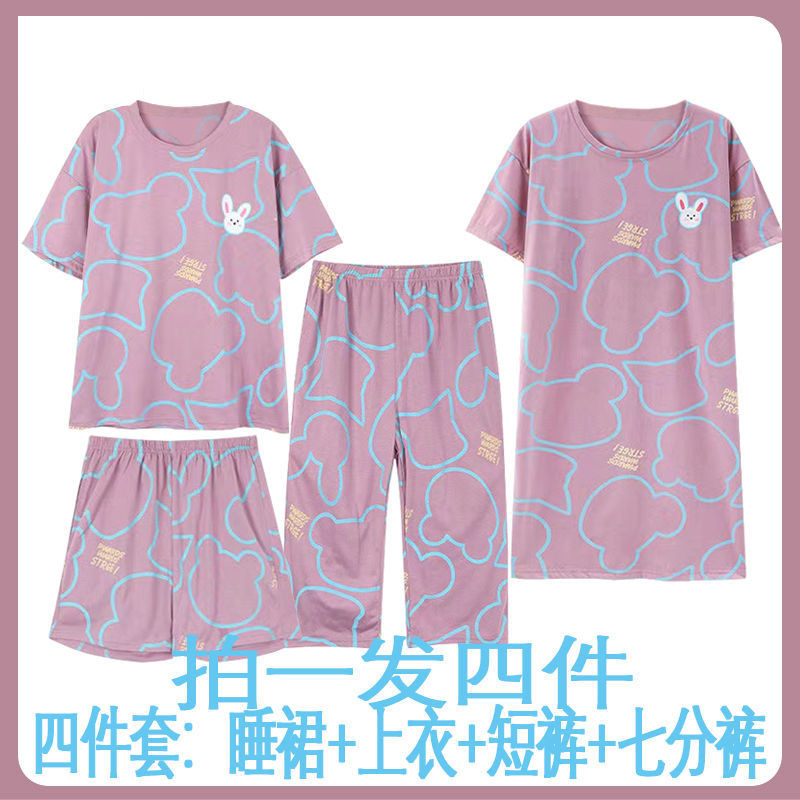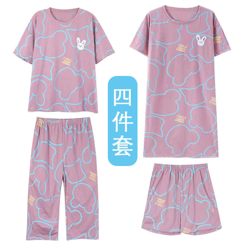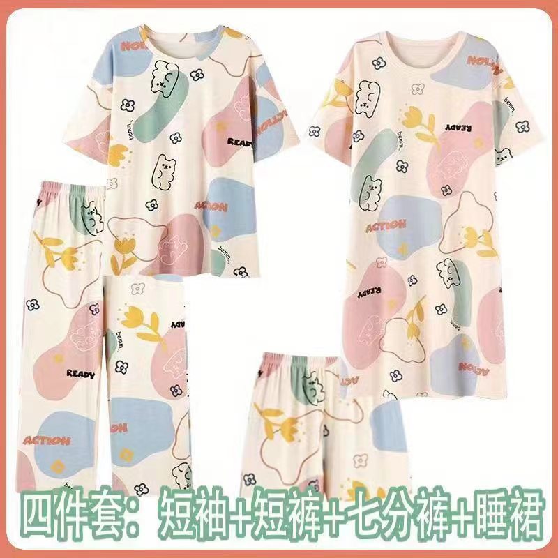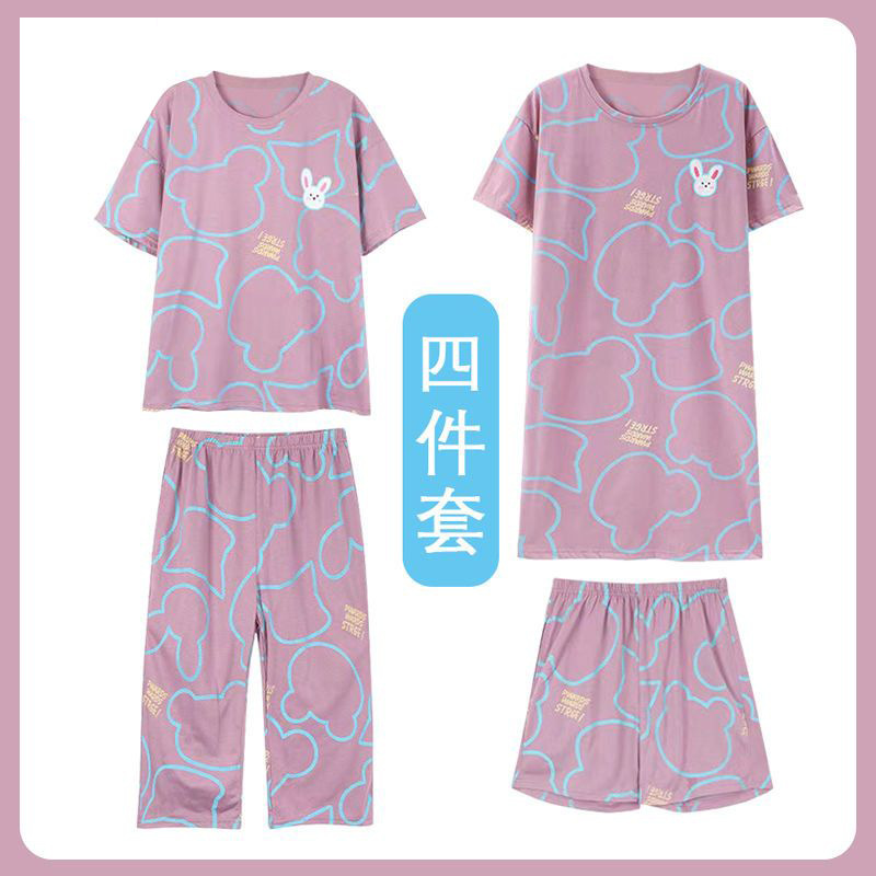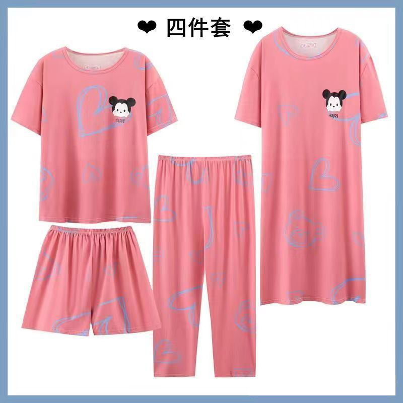 모조 면 4 피스 잠옷 여자의 여름 만화 잠옷 여름 카프리 바지 반팔 세트 가정 옷 라이브 폭발스토어 가기