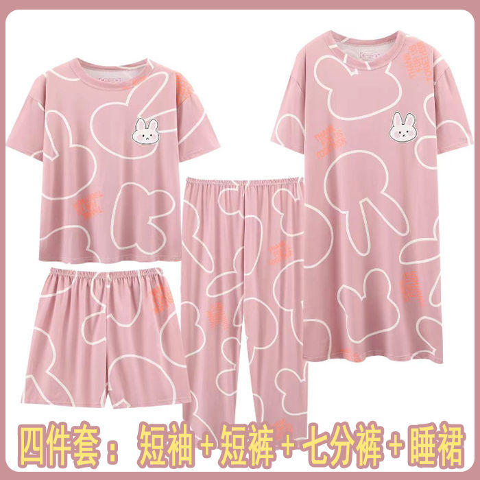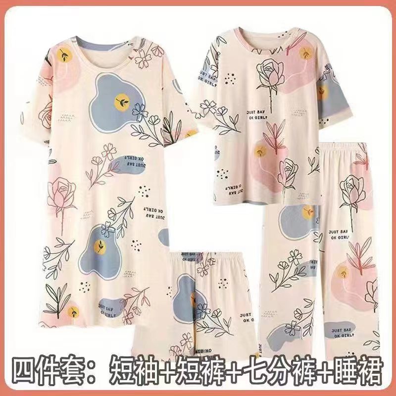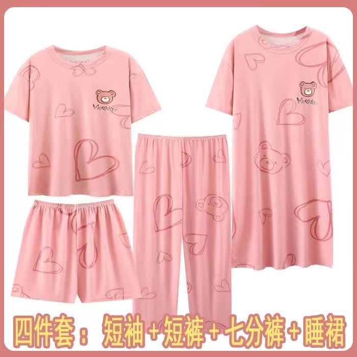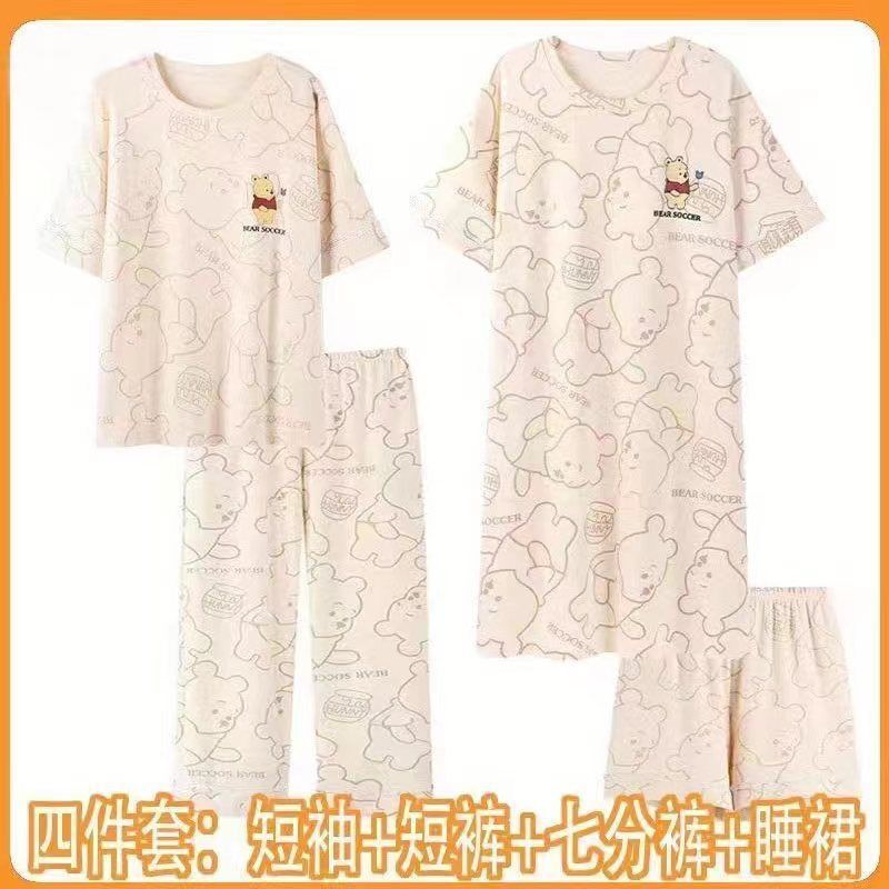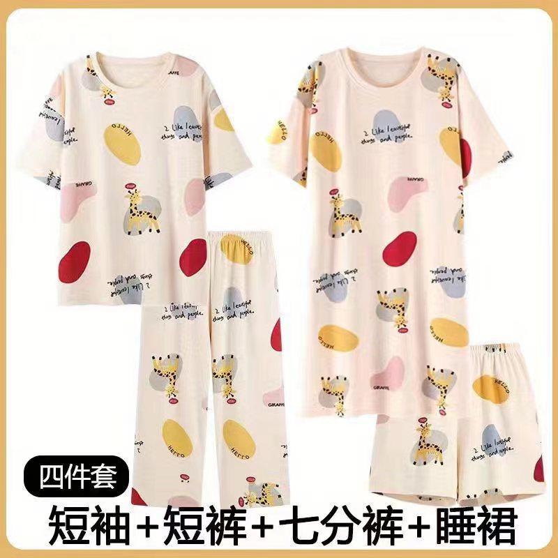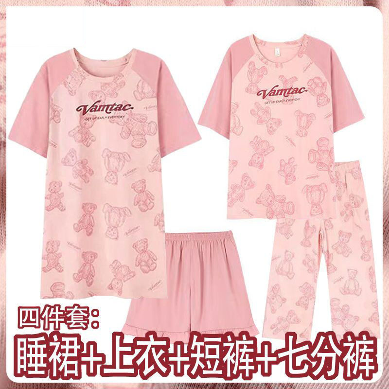 모조 면 4 피스 잠옷 여자의 여름 만화 잠옷 여름 카프리 바지 반팔 세트 가정 옷 라이브 폭발스토어 가기