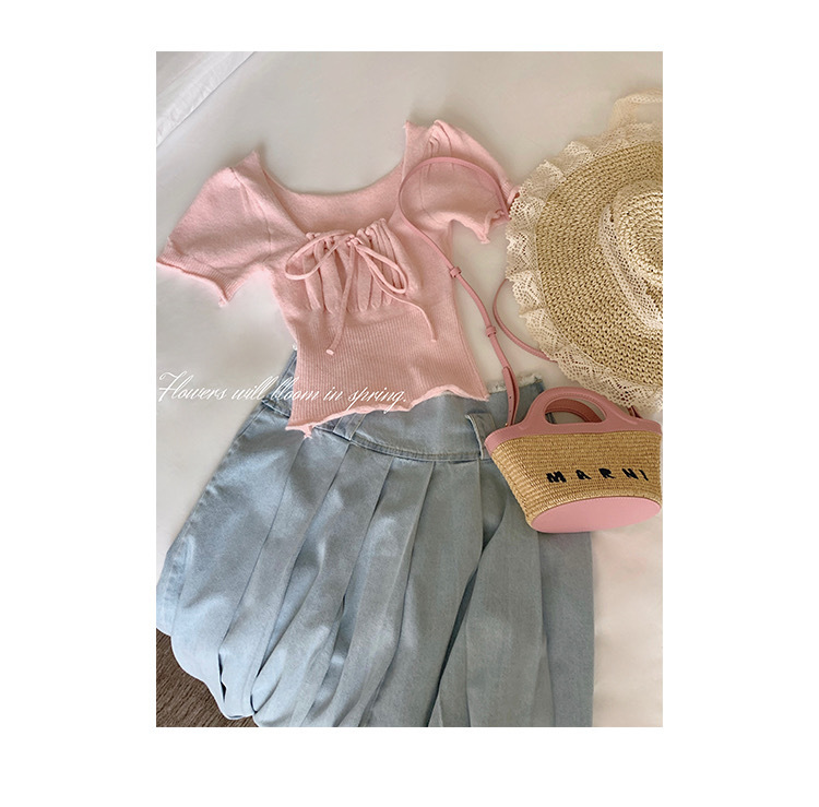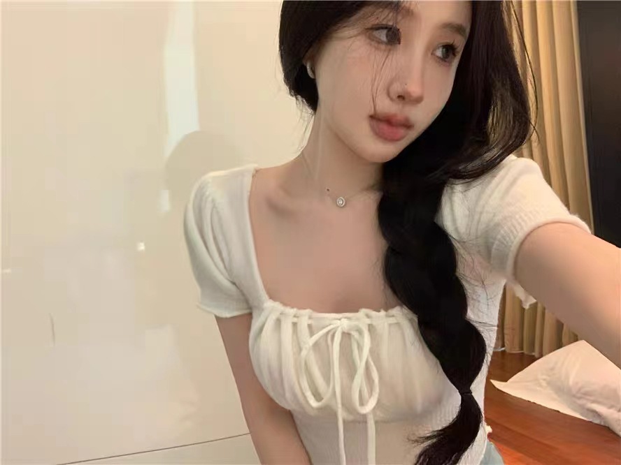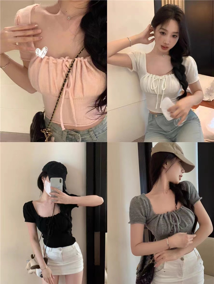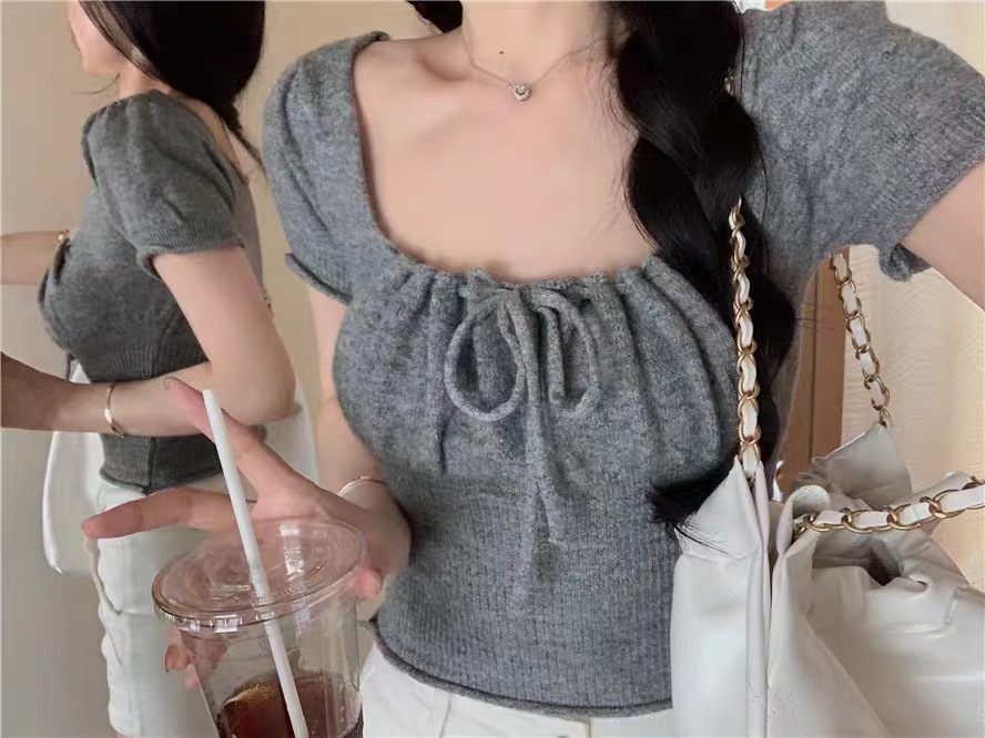 봄 한국식 퓨어 욕망 스퀘어 칼라 레이스업 디자인 짧은 스웨터 반팔 여성 상의스토어 가기