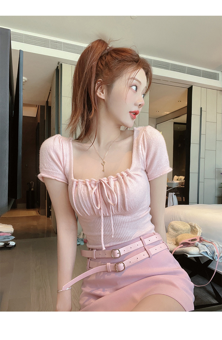 봄 한국식 퓨어 욕망 스퀘어 칼라 레이스업 디자인 짧은 스웨터 반팔 여성 상의