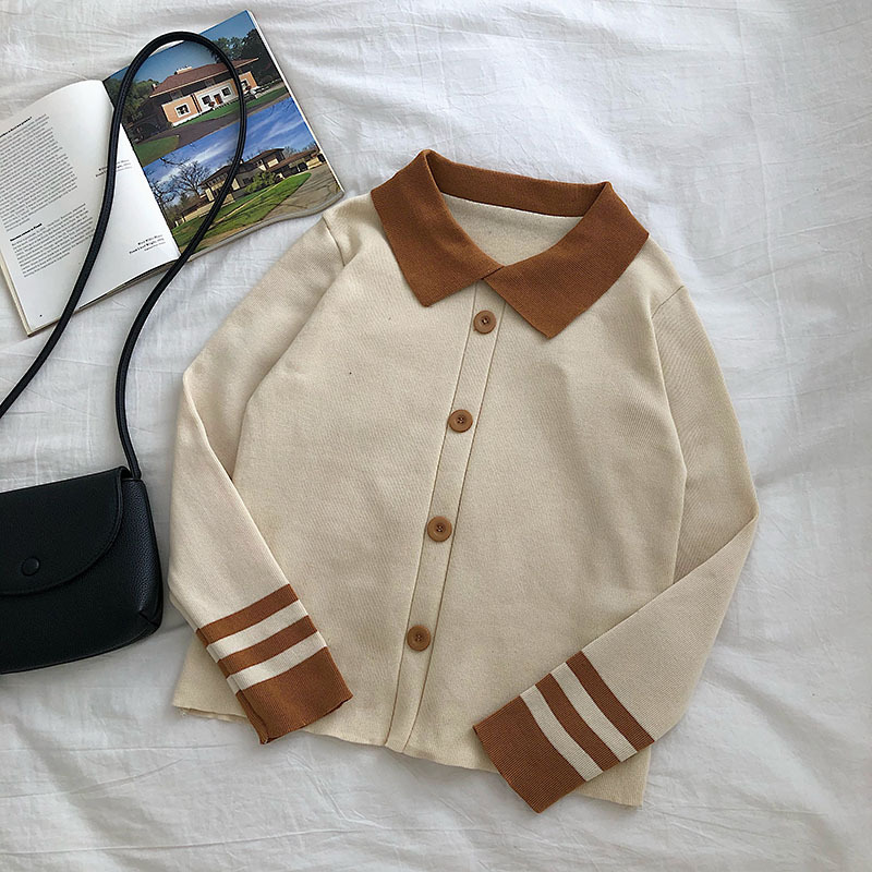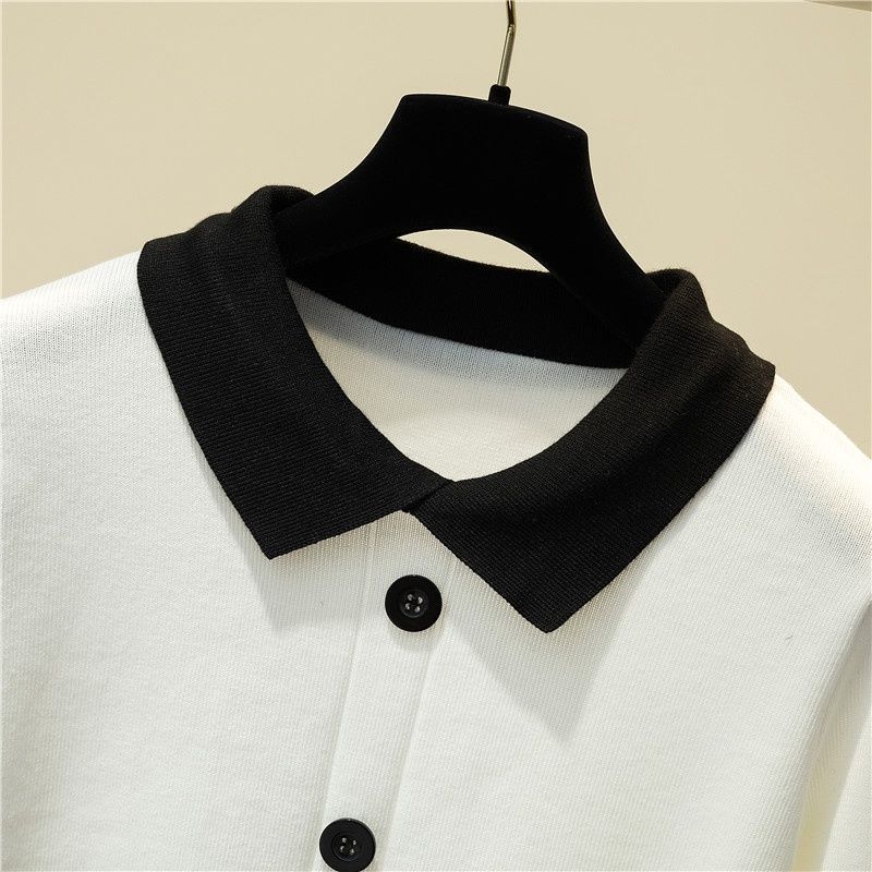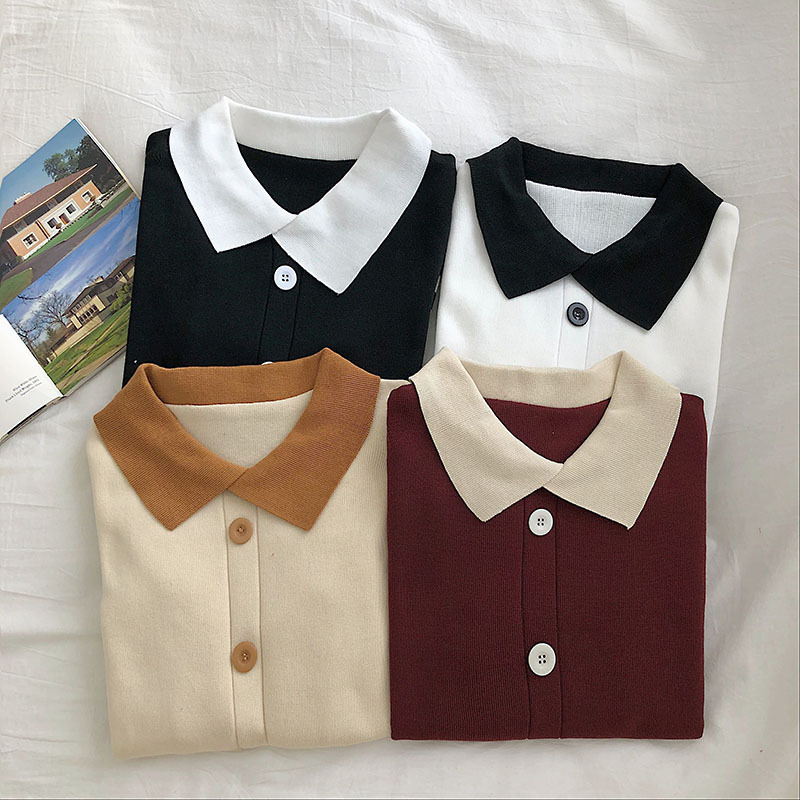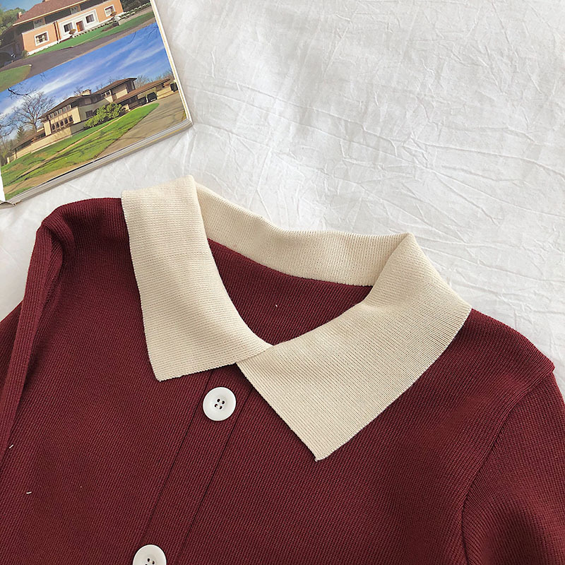 가을 겨울 2023 새로운 여성 한국식 슬림핏 슬림핏 컬러매칭 긴팔 니트 스웨터 인형 칼라 스웨터 짧은 유행