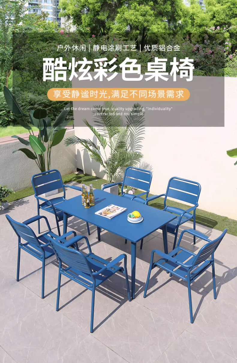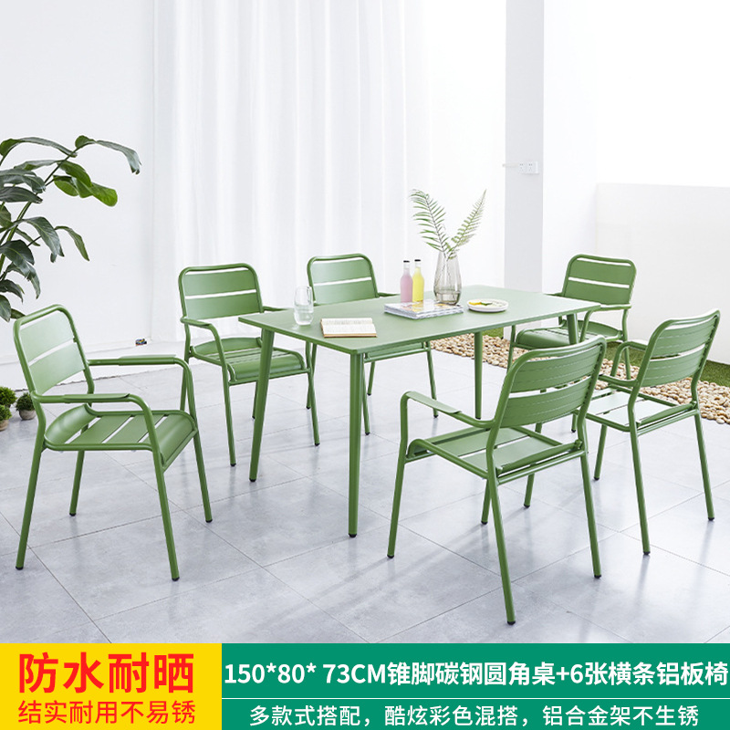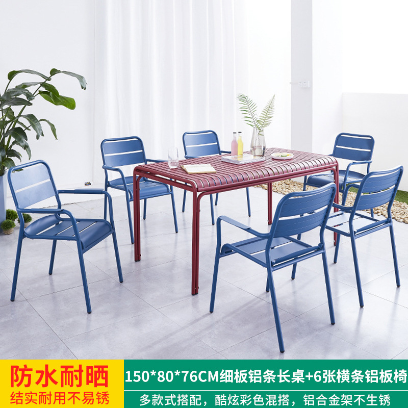 • 150*80*76cm 얇은 알루미늄 긴 테이블 + 6 수평 알루미늄 의자