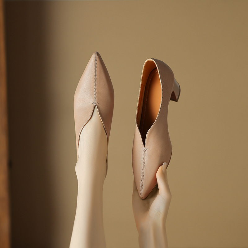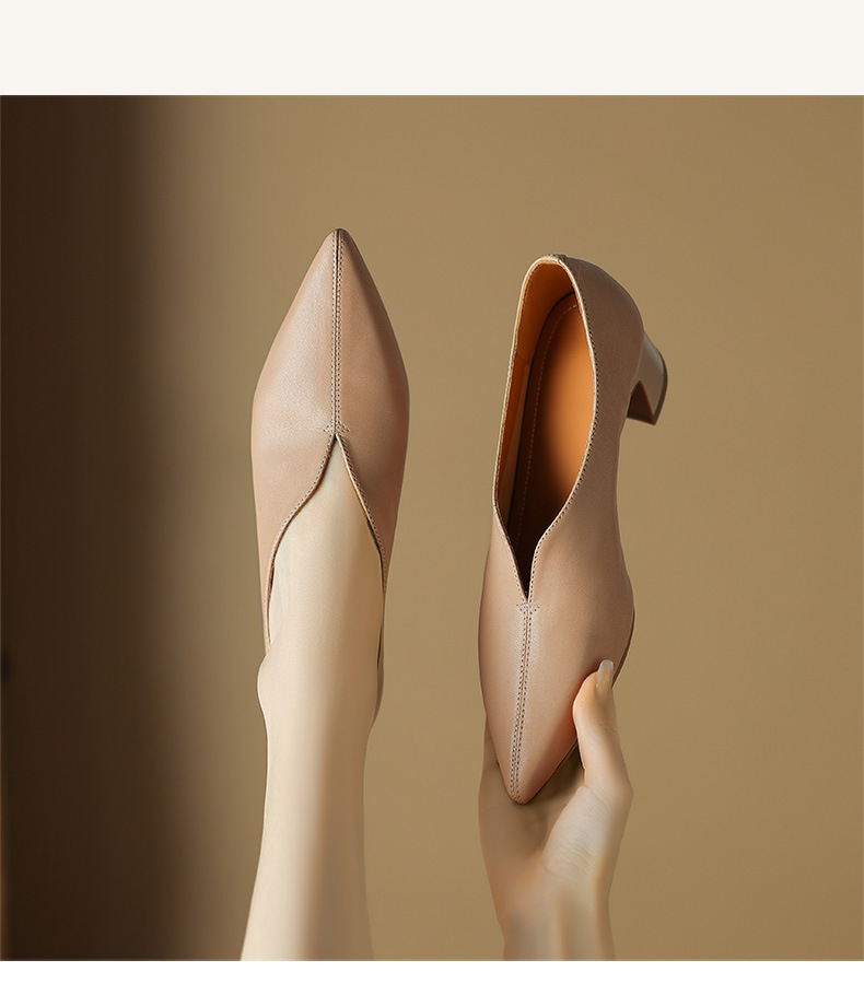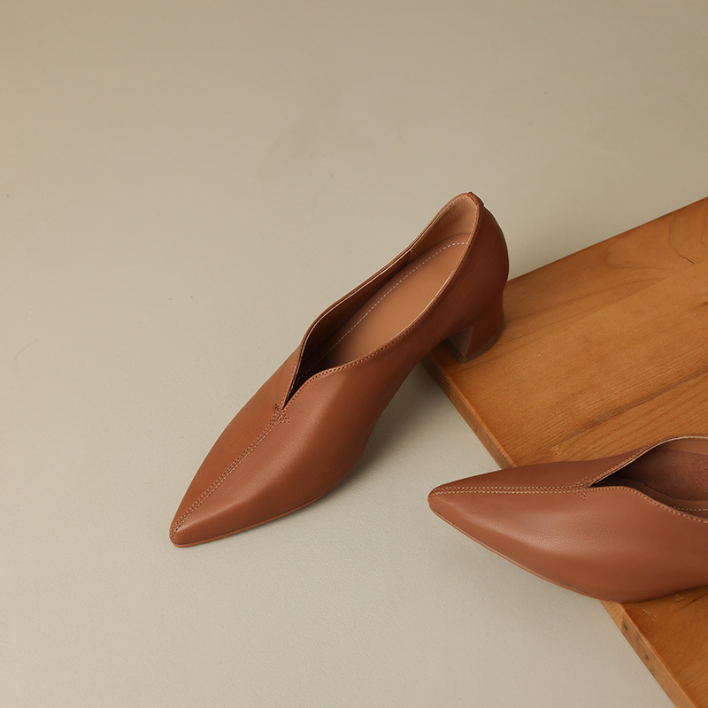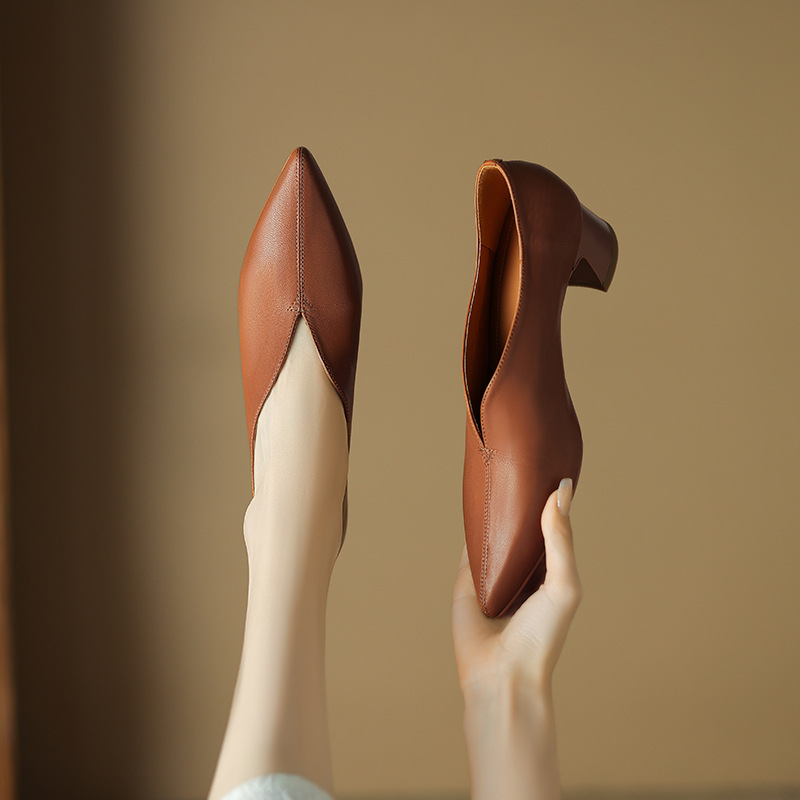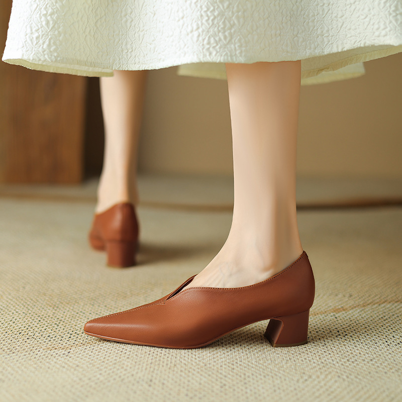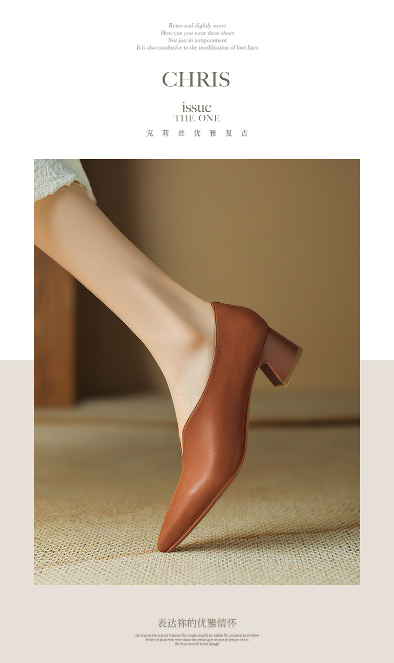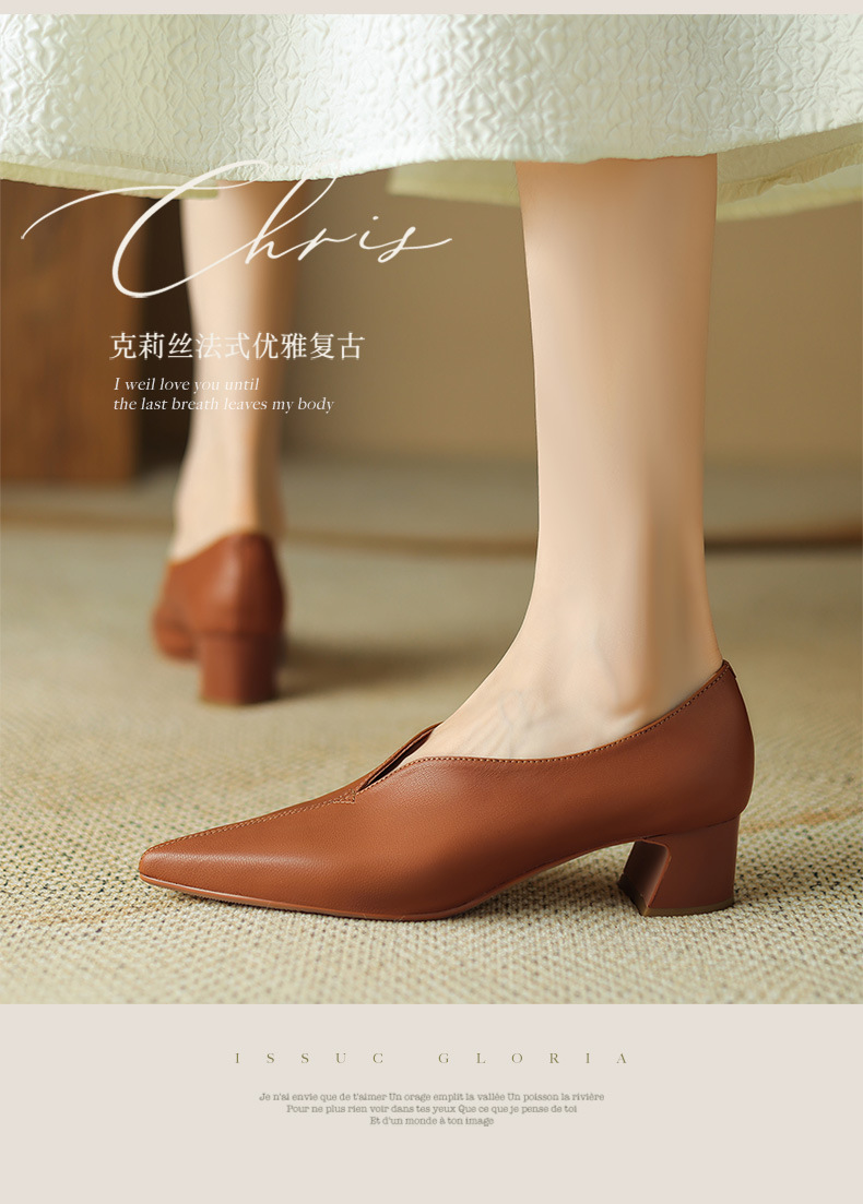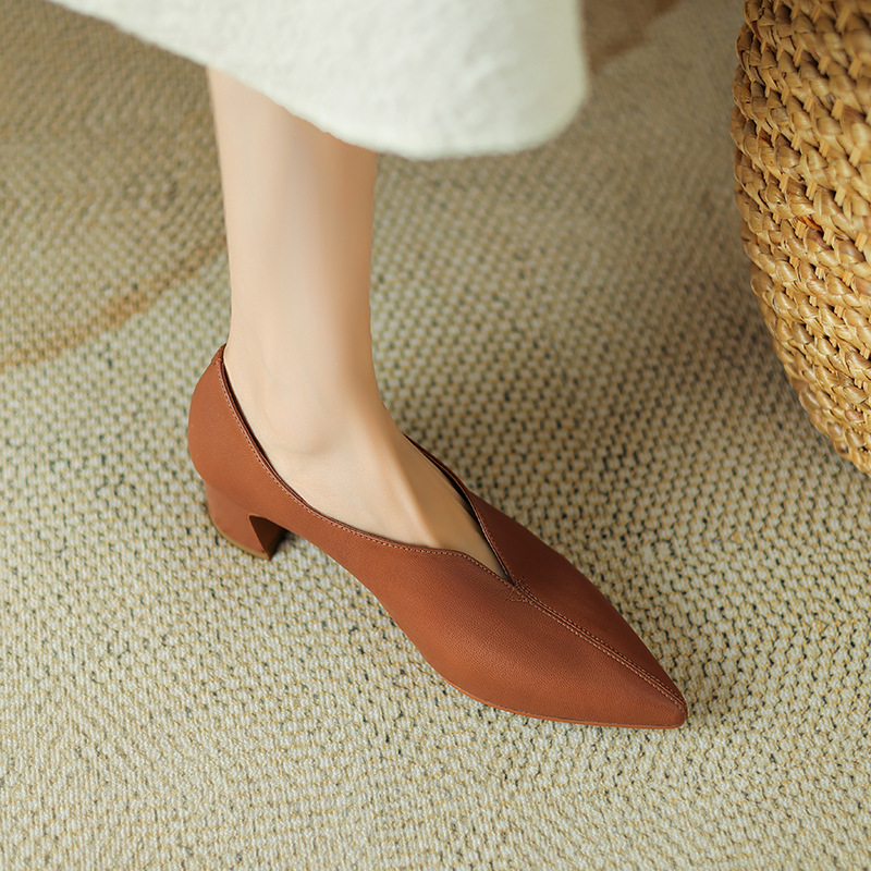 심플 콜드 스타일 레트로 밀크 슈즈 풀 가죽 2023 가을 새로운 두꺼운 뒤꿈치 뾰족한 V 입 양피 신발 여성스토어 가기