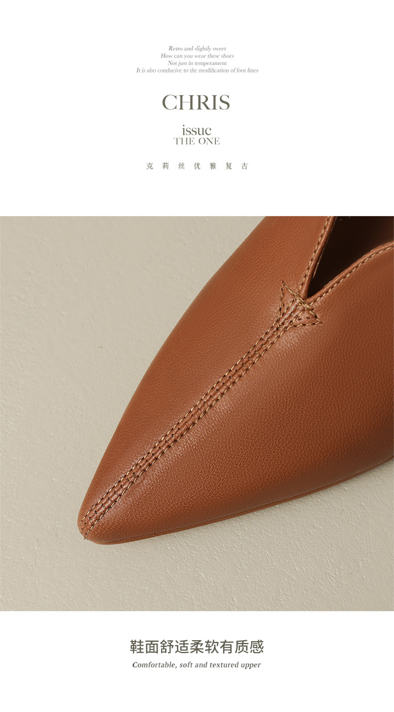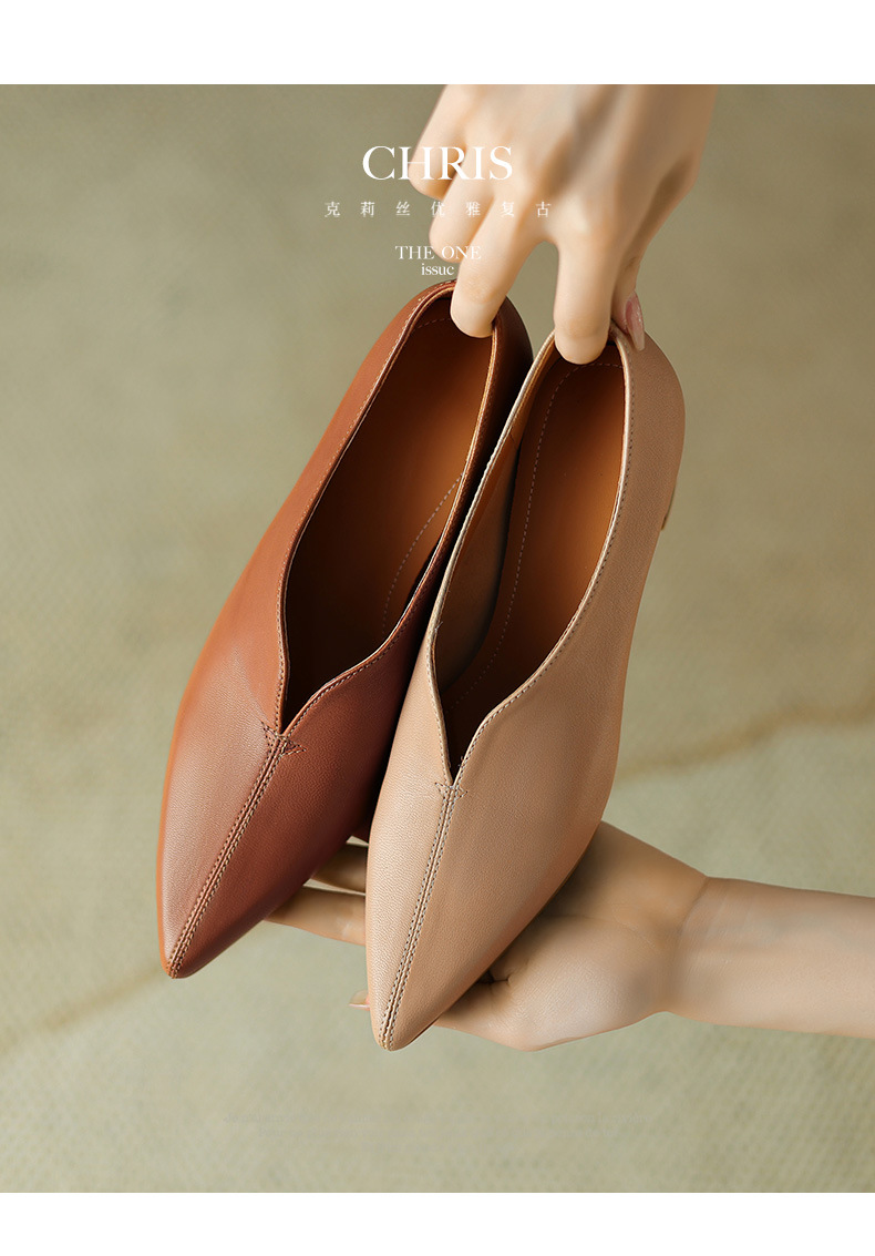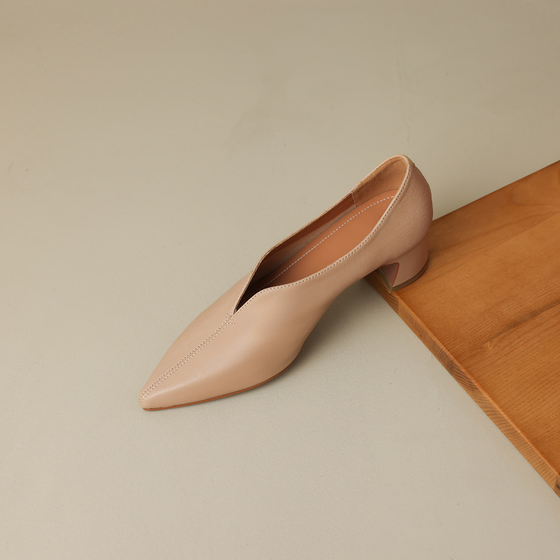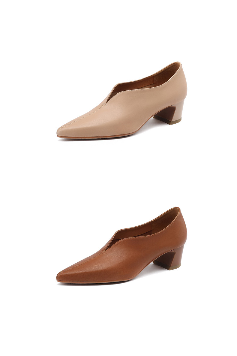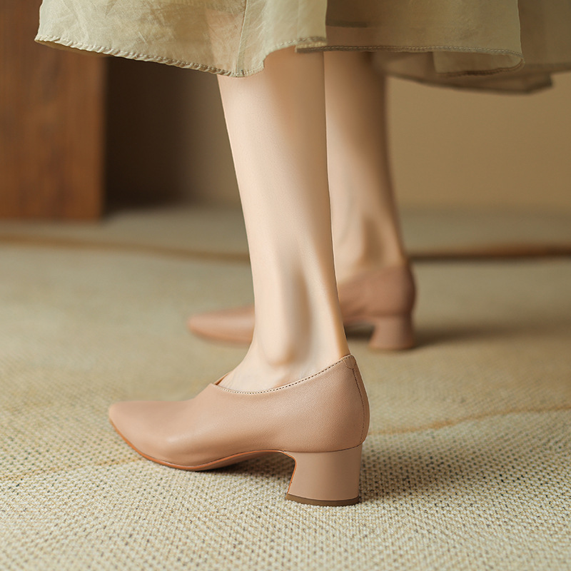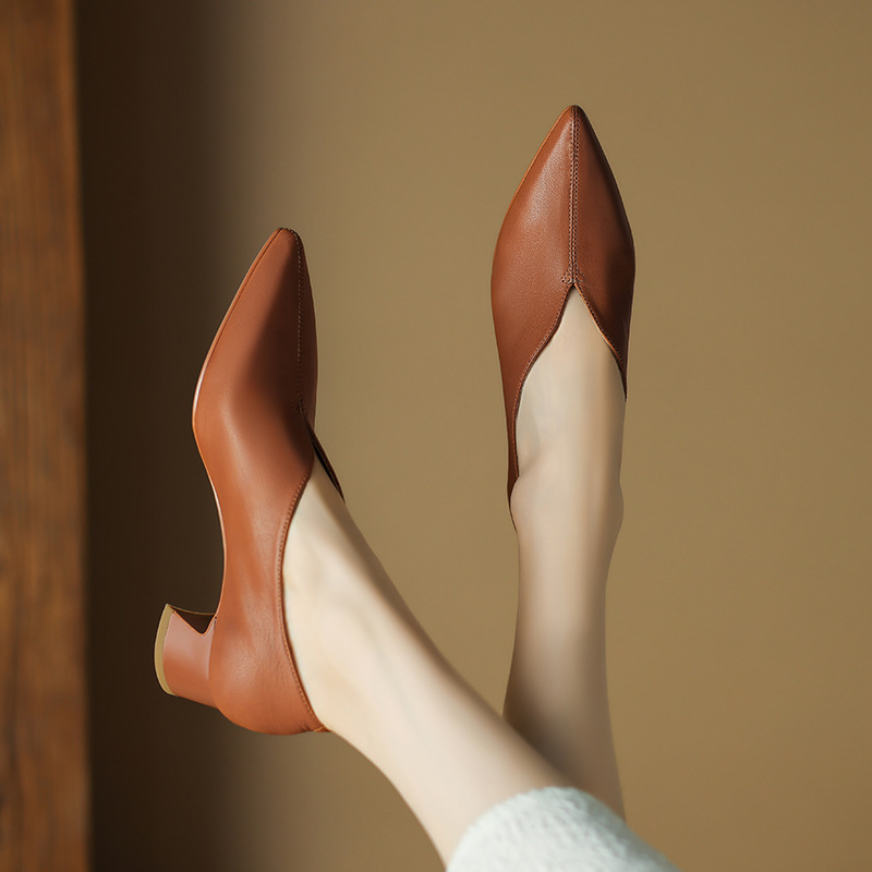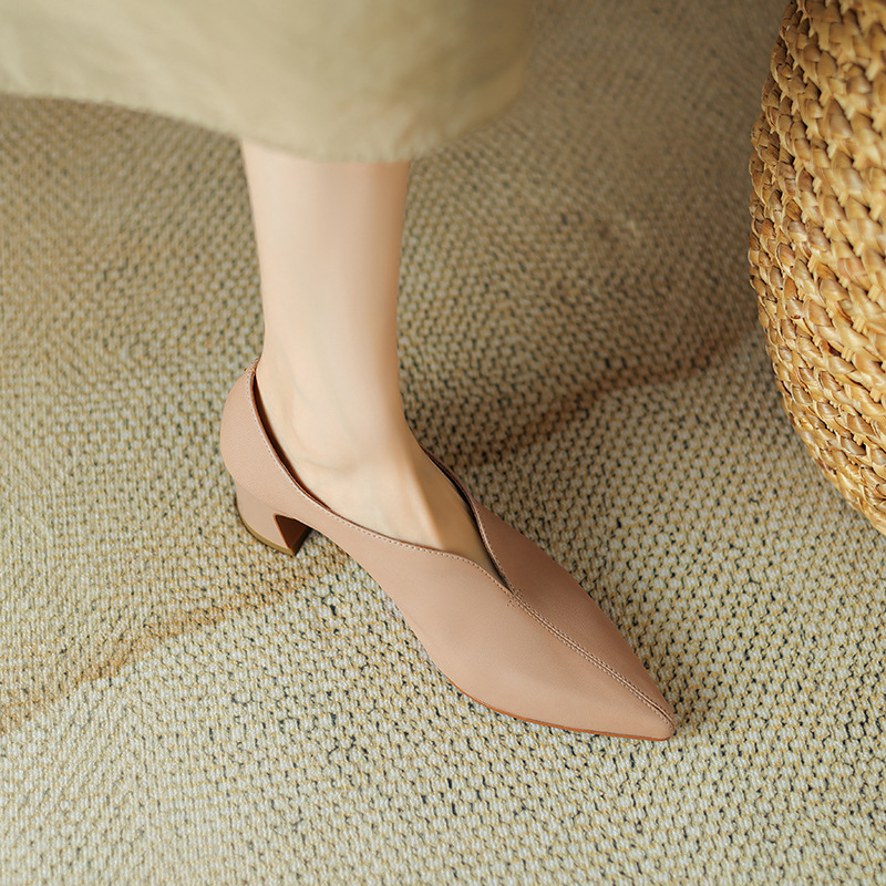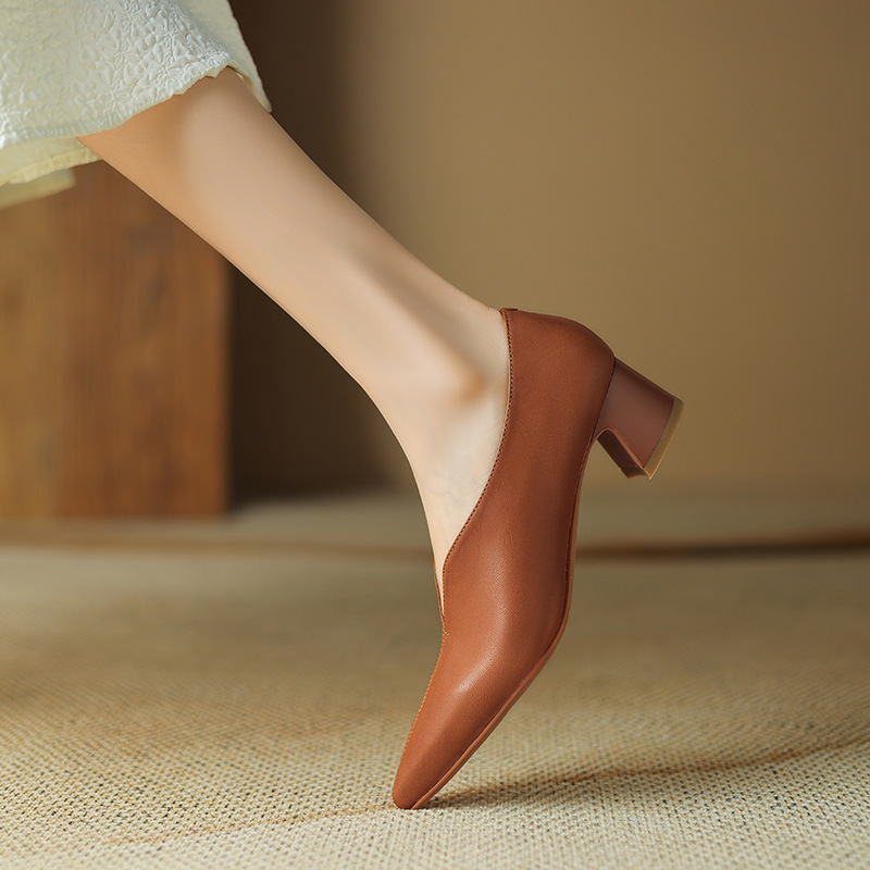 심플 콜드 스타일 레트로 밀크 슈즈 풀 가죽 2023 가을 새로운 두꺼운 뒤꿈치 뾰족한 V 입 양피 신발 여성스토어 가기