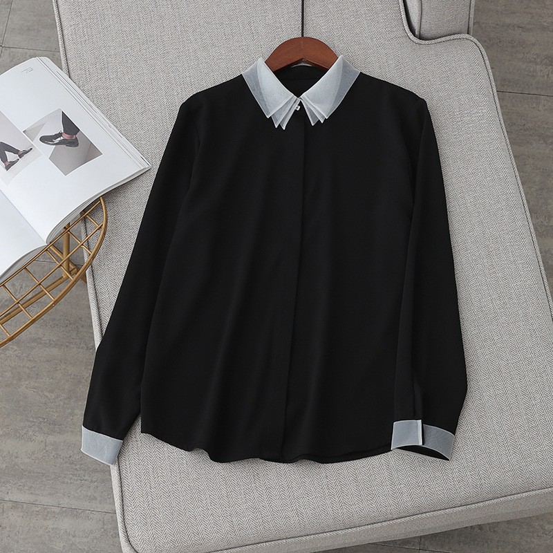 봄 새로운 콘트라스트 컬러 디자인 센스 틈새 쉬폰 여성 화이트 셔츠 기질 통근 인터뷰 전문 롱 슬리브 탑스토어 가기