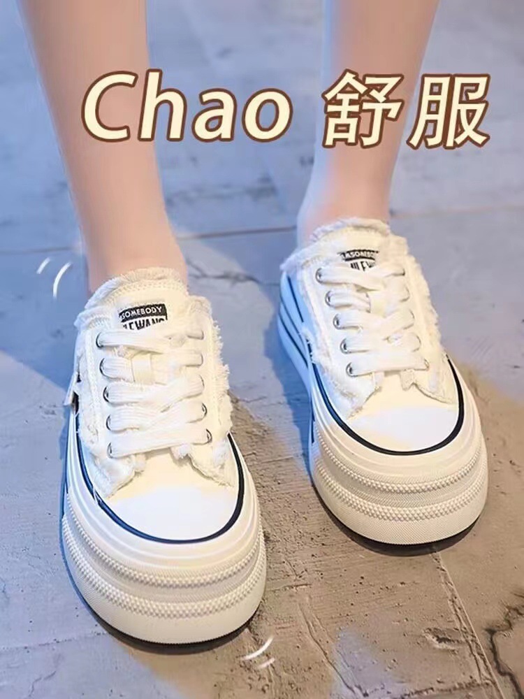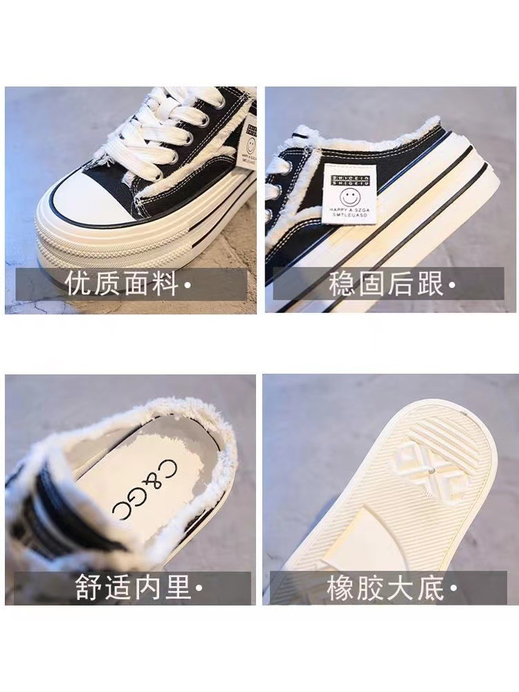 캔버스 Baotou 하프 슬리퍼 여성용 2023 봄 새로운 두꺼운 밑창 겉옷 게으른 굽 없는 내부 높이 올리는 흰색 신발