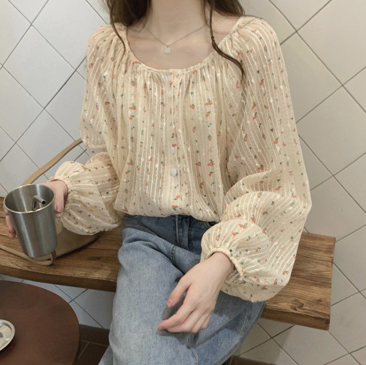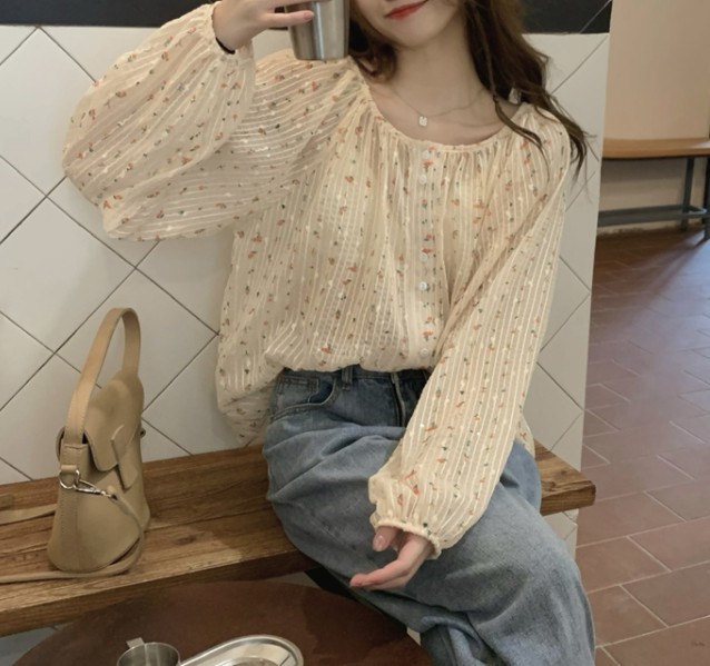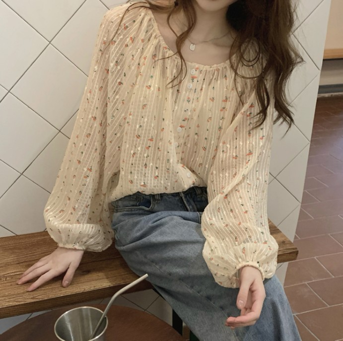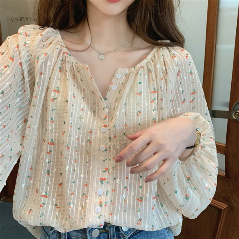 이른 봄과 가을 신선한 쉬폰 꽃 셔츠 여성의 디자인 감각 틈새 시크 얇은 홍콩 스타일 여름 긴 소매 탑