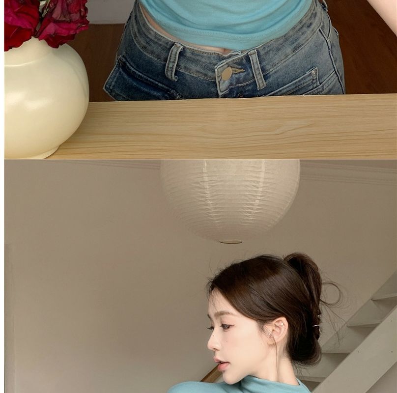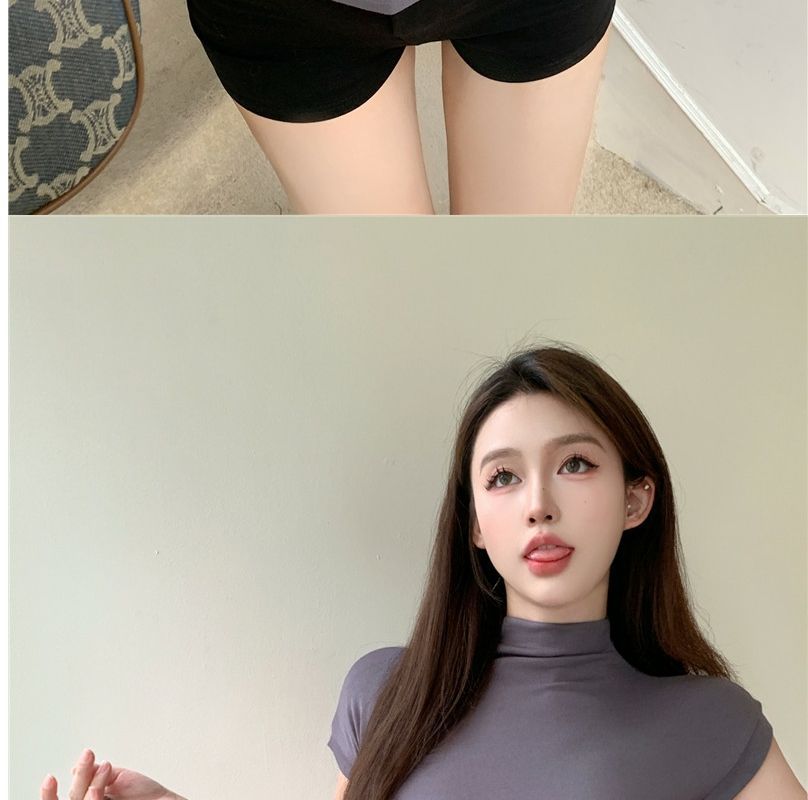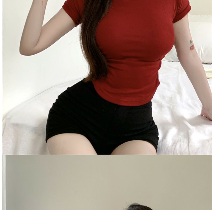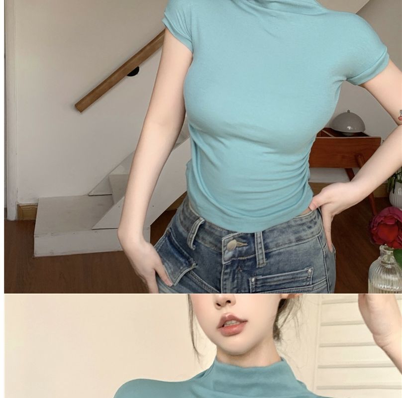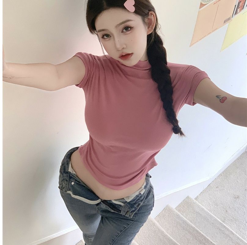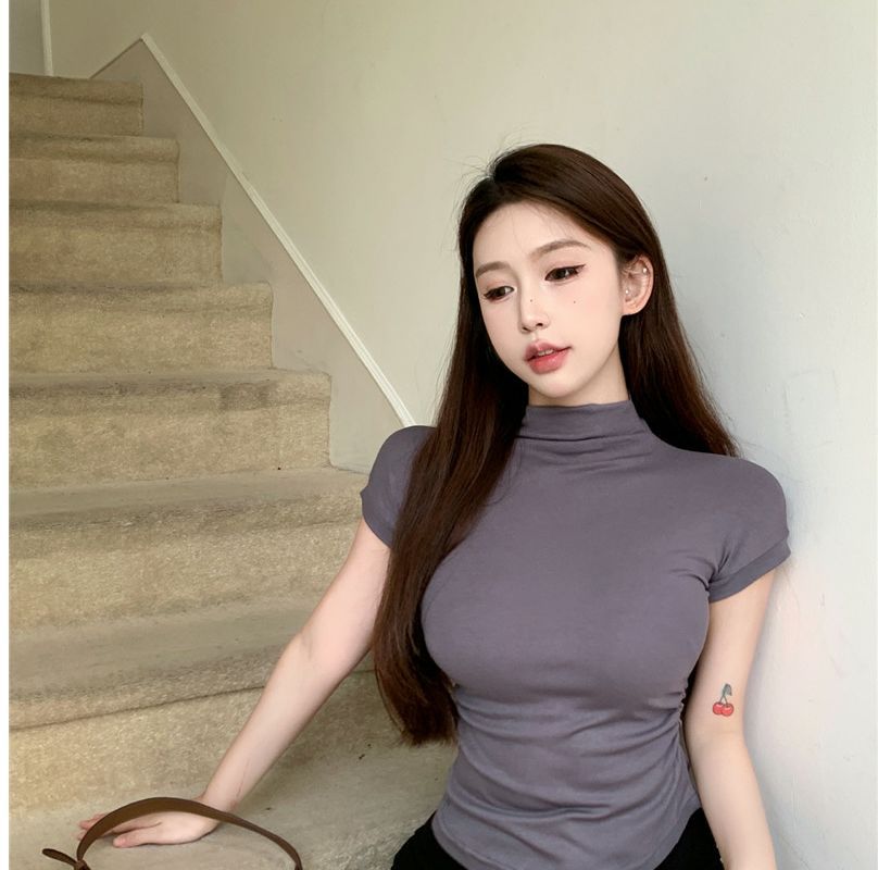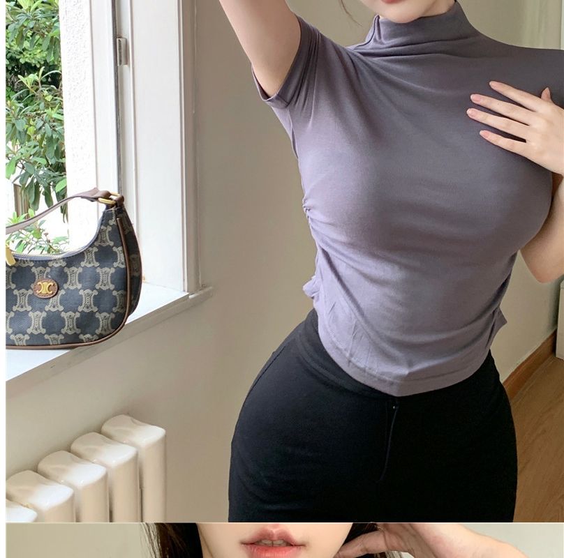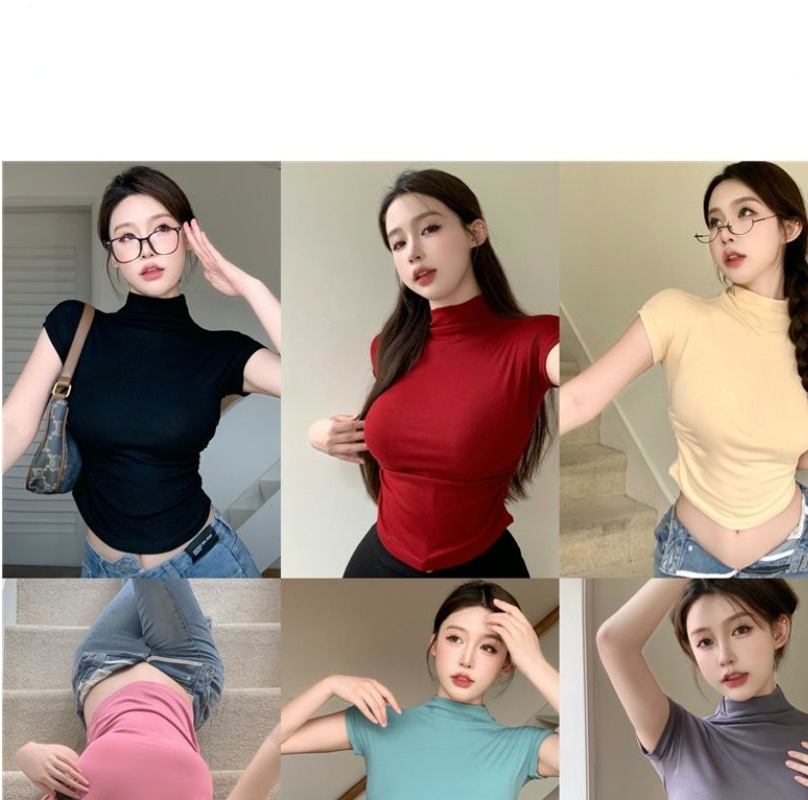 2023 여름 새로운 섹시한 내부 타이트 슬림베이스 셔츠 탑 여성용 디자인 센스 하프 하이 넥 반팔 티셔츠스토어 가기