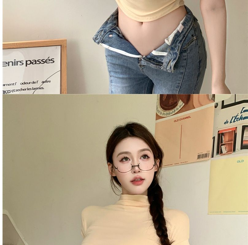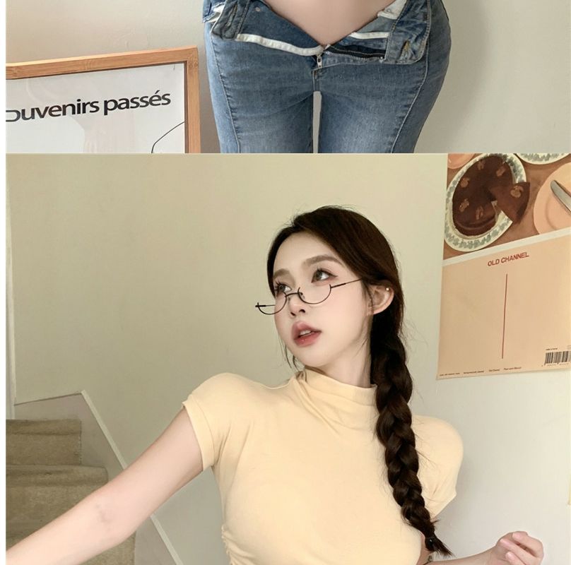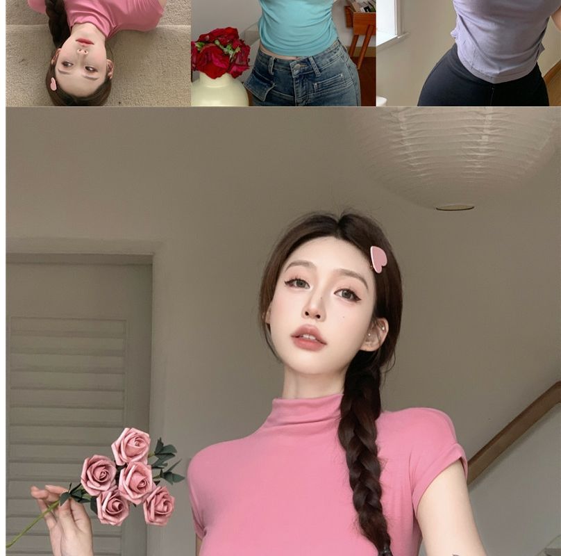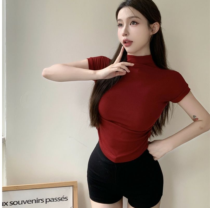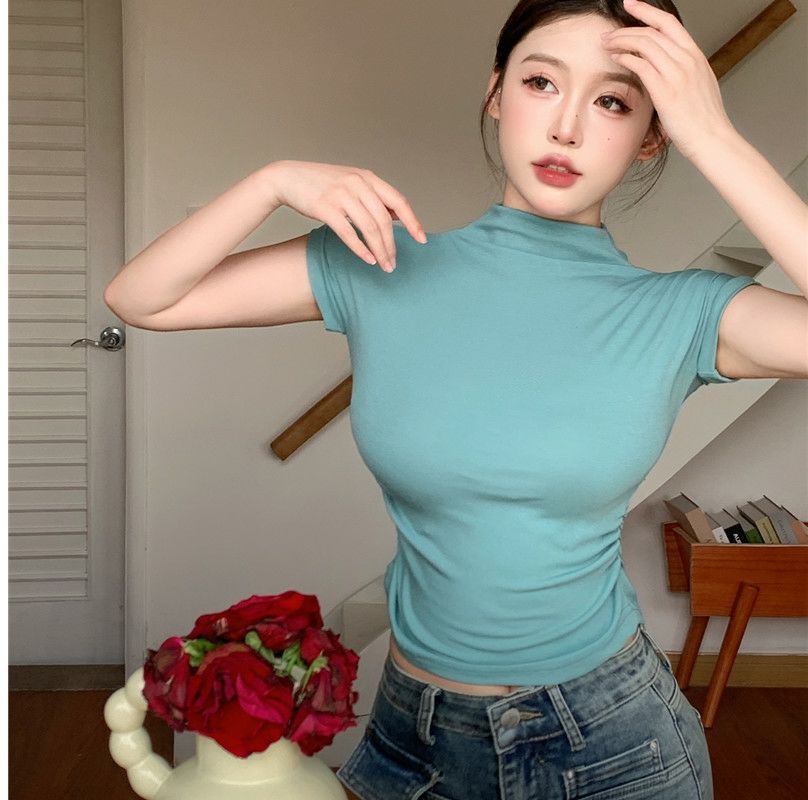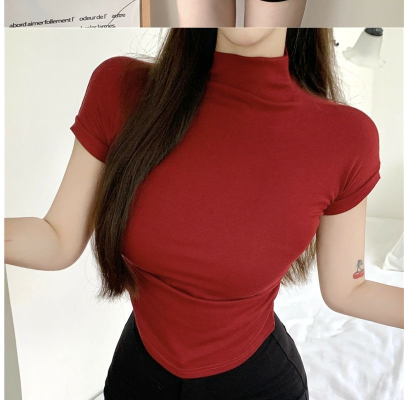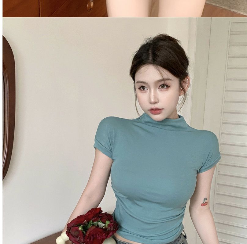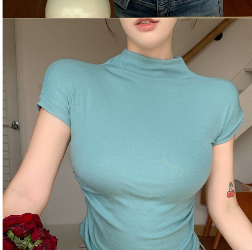 2023 여름 새로운 섹시한 내부 타이트 슬림베이스 셔츠 탑 여성용 디자인 센스 하프 하이 넥 반팔 티셔츠