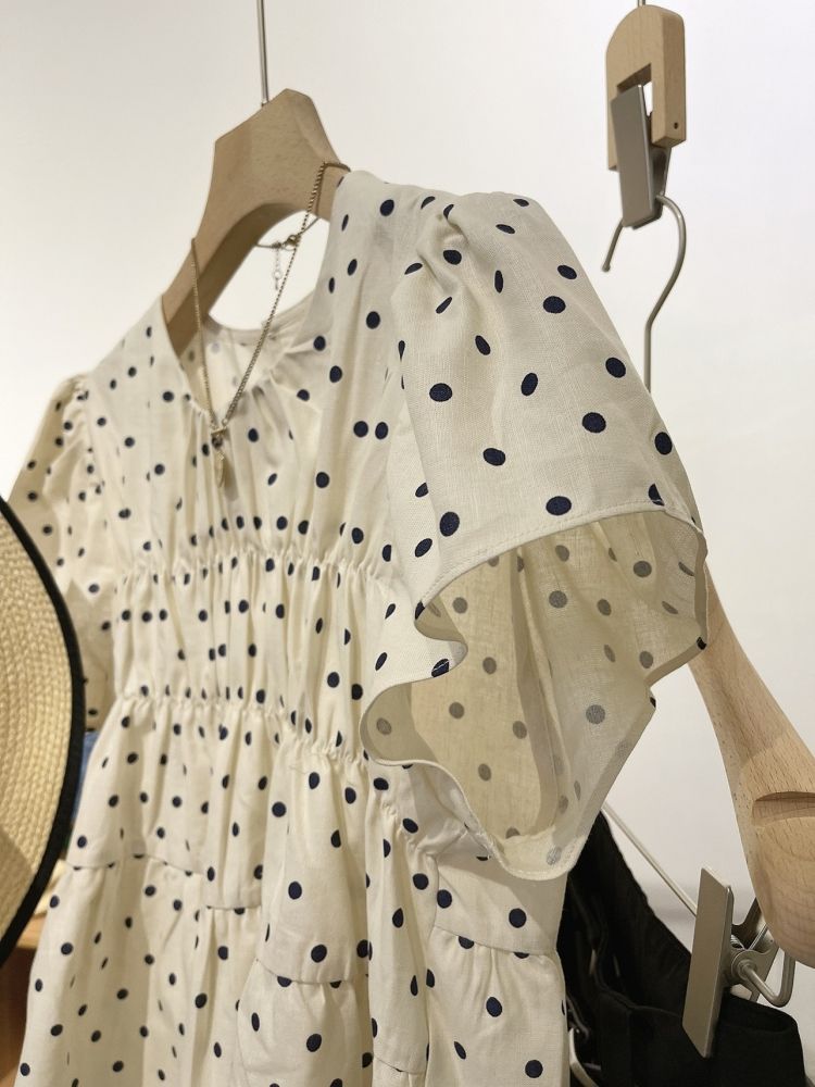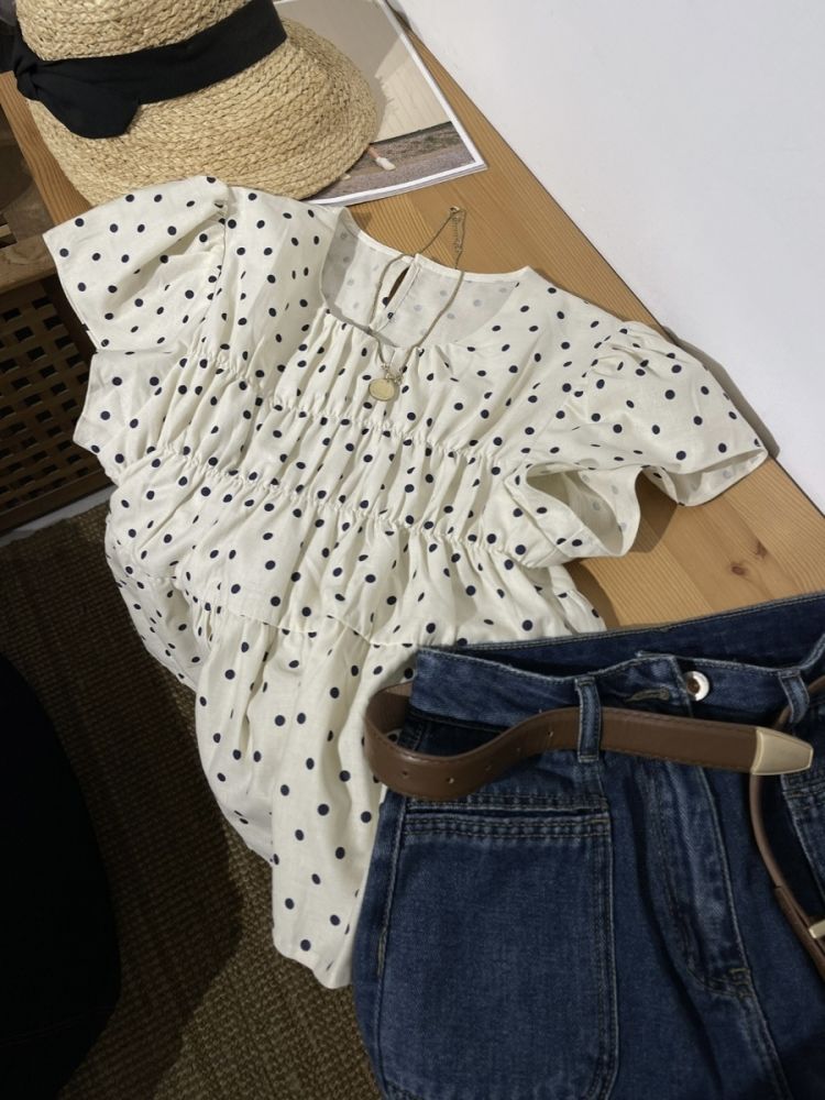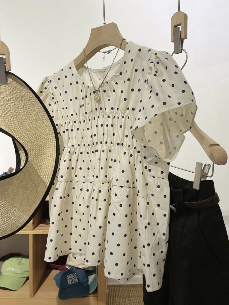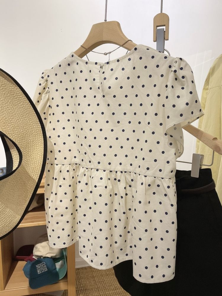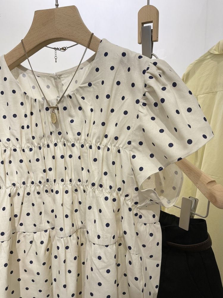 2023 여름 새로운 라운드 넥 플라잉 슬리브 스몰 웨이브 도트 타이트 웨이스트 스위트 인형 셔츠 코튼 린넨 탑 셔츠 여성용 얇은스토어 가기