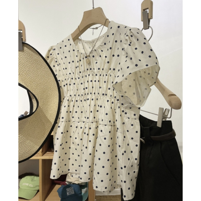 2023 여름 새로운 라운드 넥 플라잉 슬리브 스몰 웨이브 도트 타이트 웨이스트 스위트 인형 셔츠 코튼 린넨 탑 셔츠 여성용 얇은