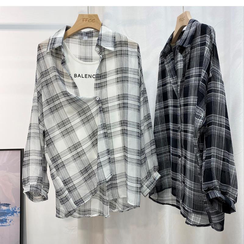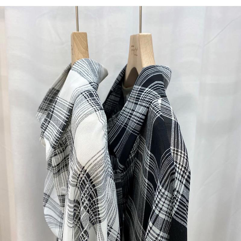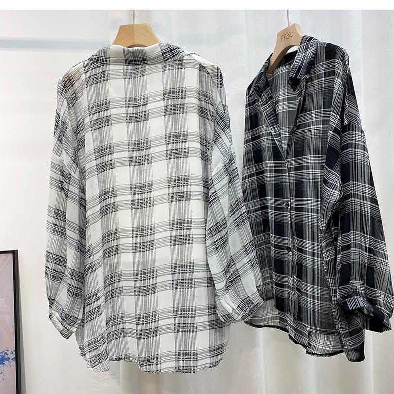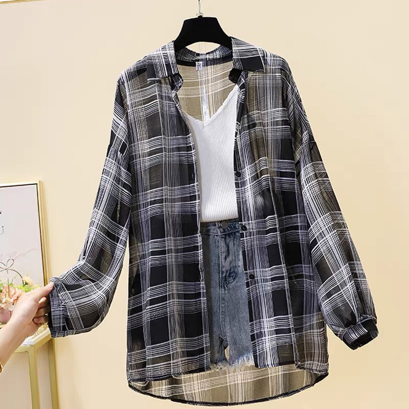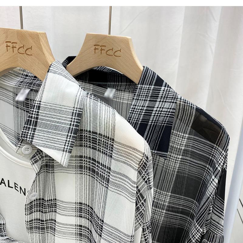 2025년 여름 신상 여성 체크무늬 셔츠, 독특한 디자인, 루즈핏, 드레이프감 있는 쉬폰 셔츠, 자외선 차단 셔츠, 탑스토어 가기