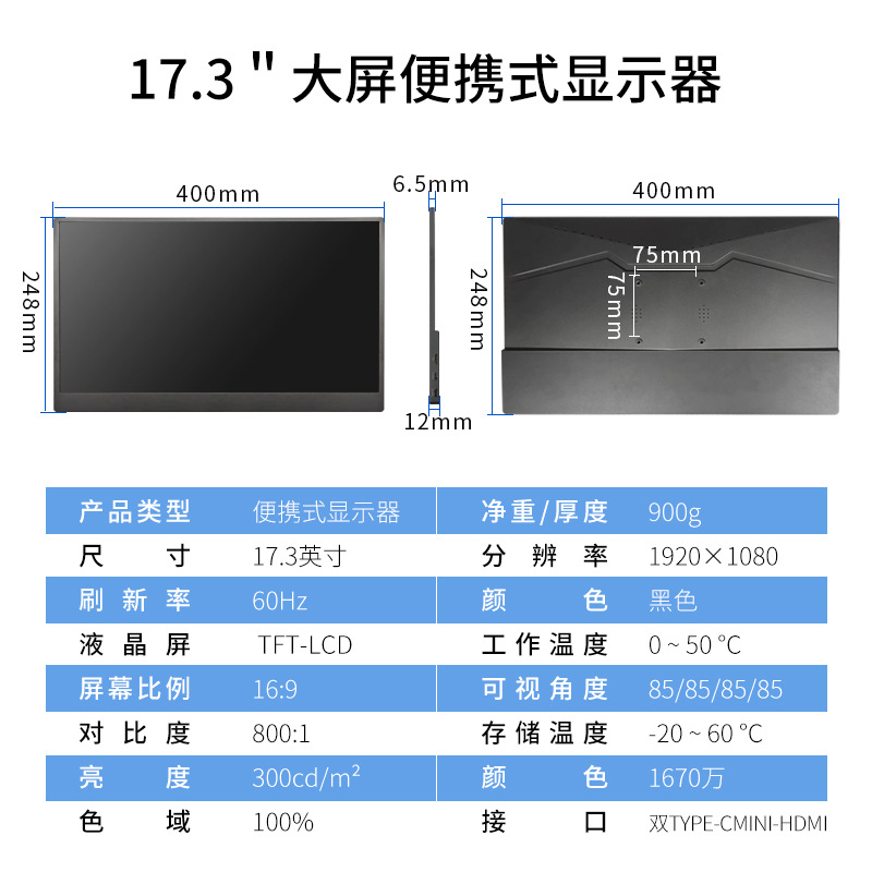 17.3 "HD 휴대용 디스플레이 컴퓨터 확장 하위 화면 스위치 외부 확장 화면 100 색 영역