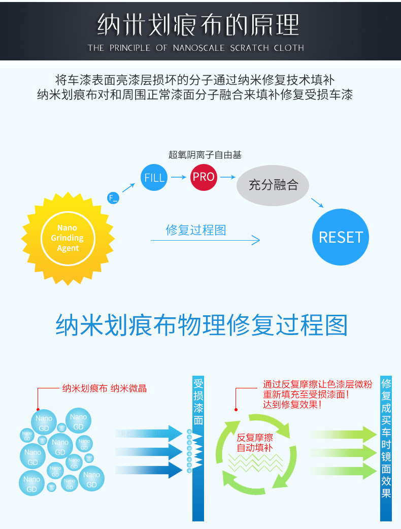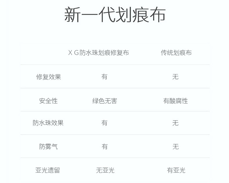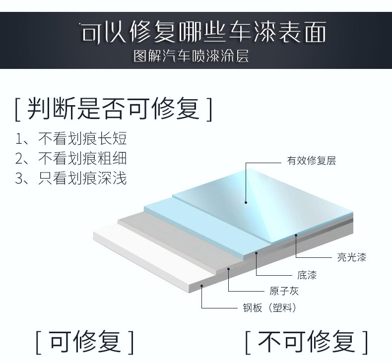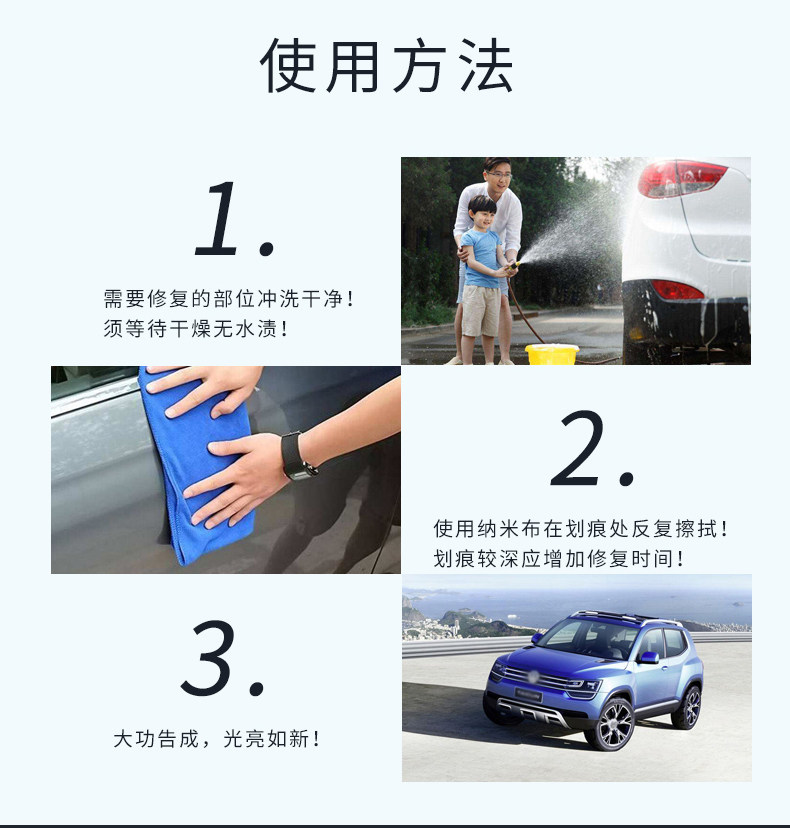1,修复布主要针对漆面轻微痕处理【如指甲痕,浅层擦撞痕,沙粒磨痕等】较深的划痕【不伤漆】用力多擦几分钟也可以有一定的淡化效果!