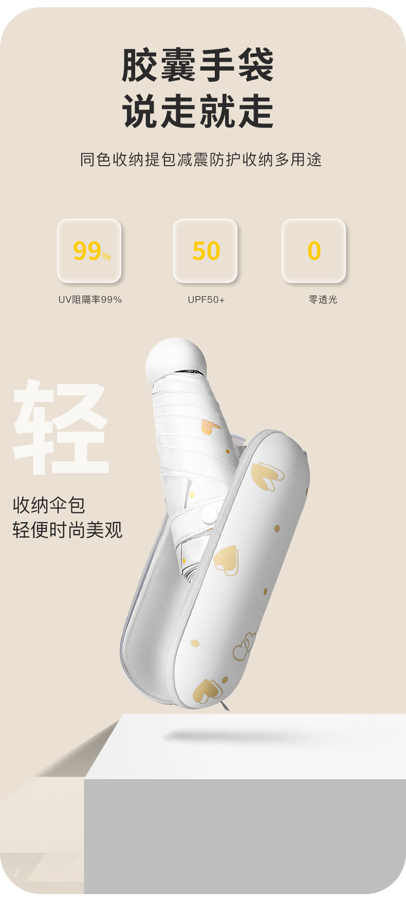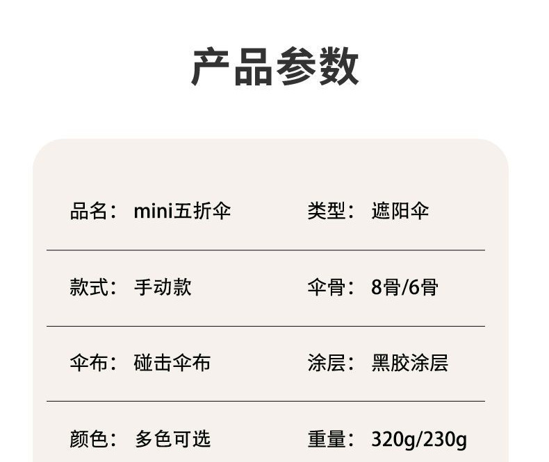 • [솔리드 베이지] 50% 접기 경량 6 본 블랙 접착제 우산