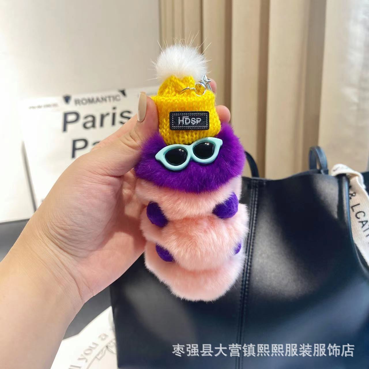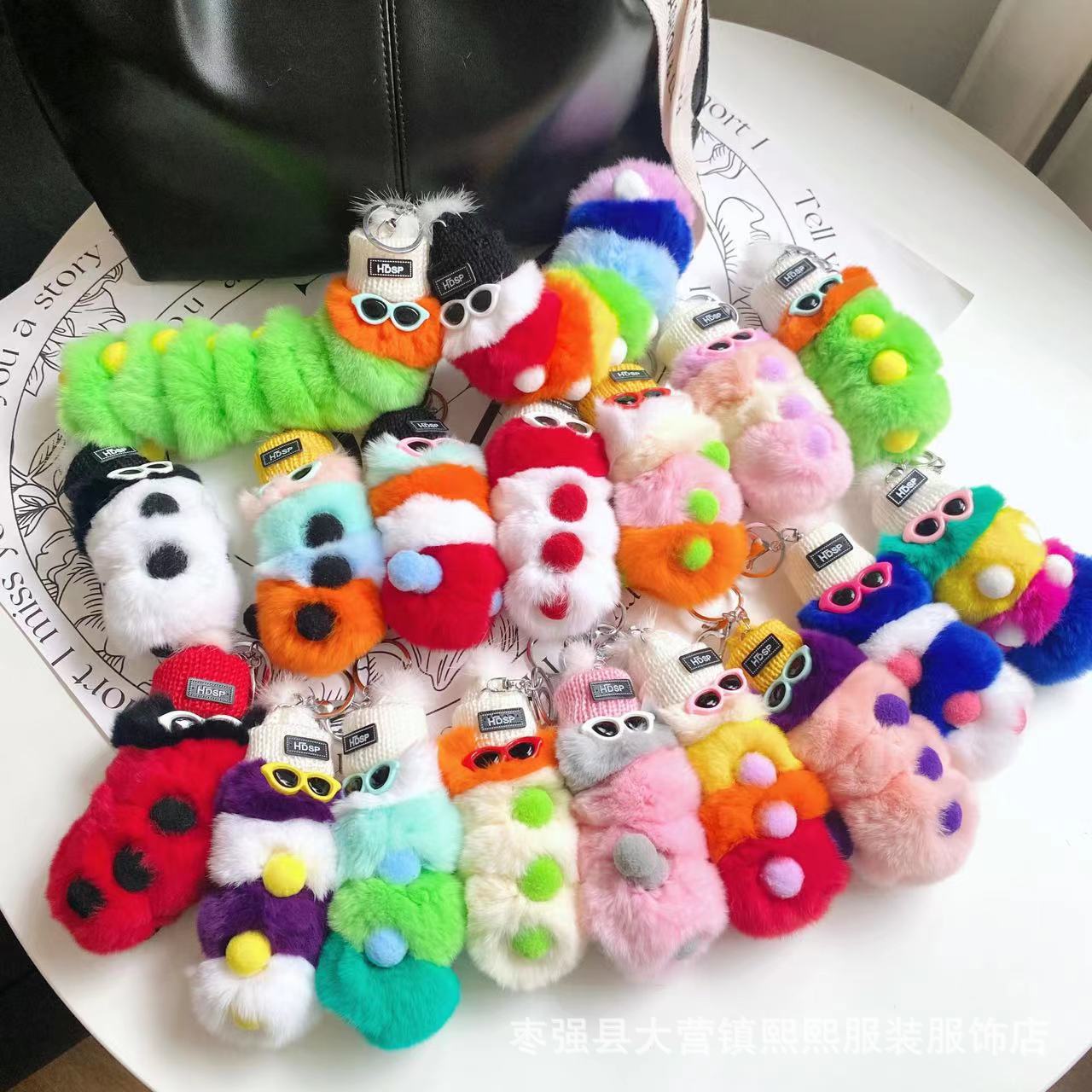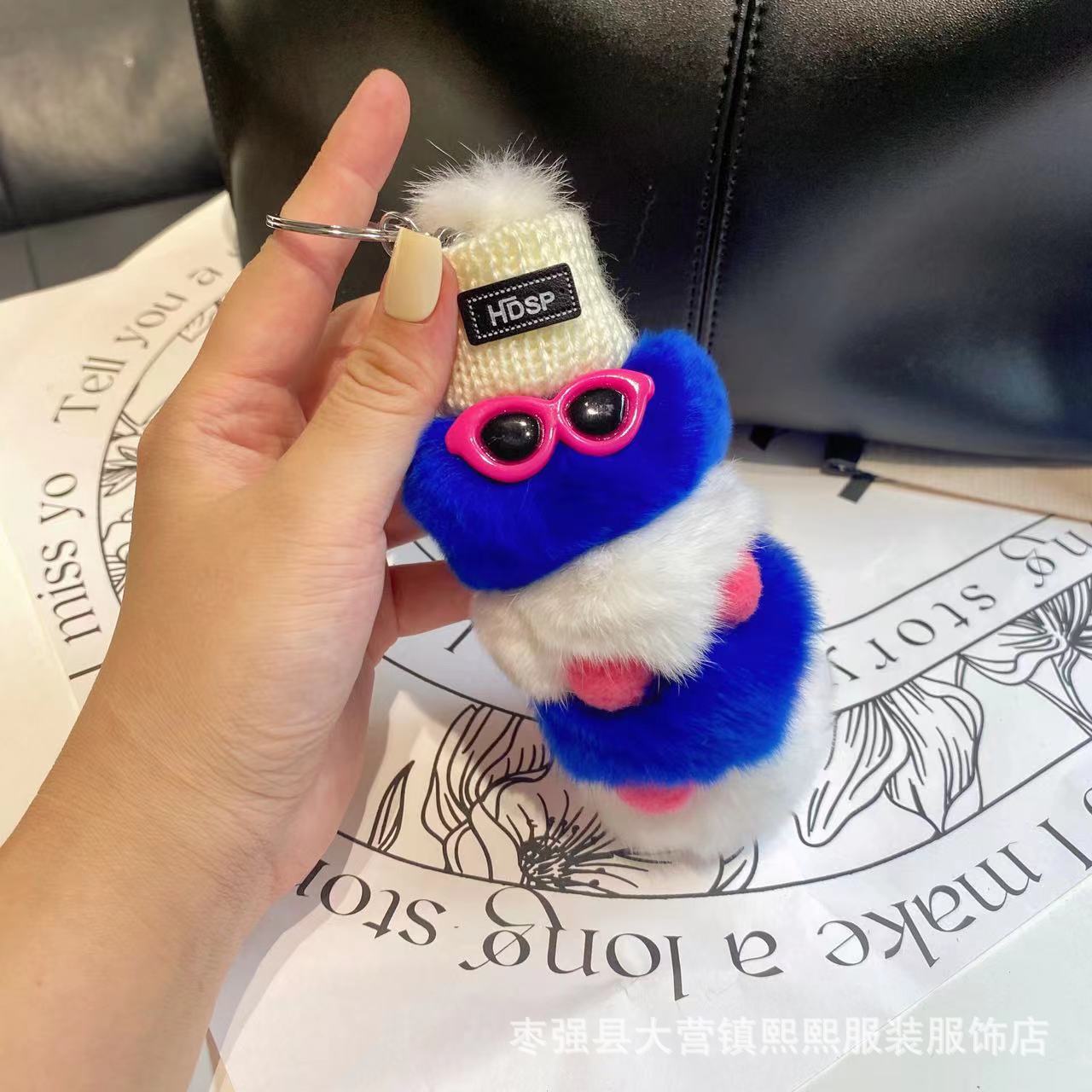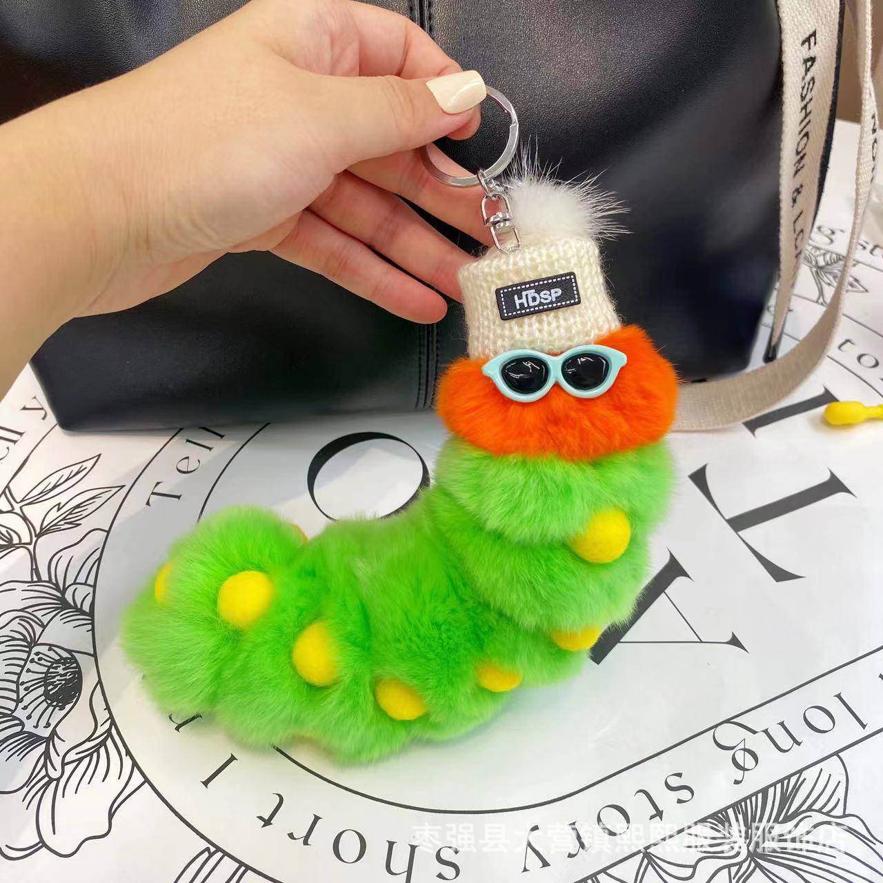 귀여운 진짜 렉스 토끼 모피 애벌레 펜던트 자동차 키 체인 스타 못생긴 귀여운 봉제 인형 가방 펜던트스토어 가기