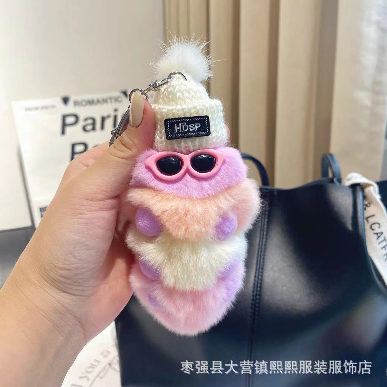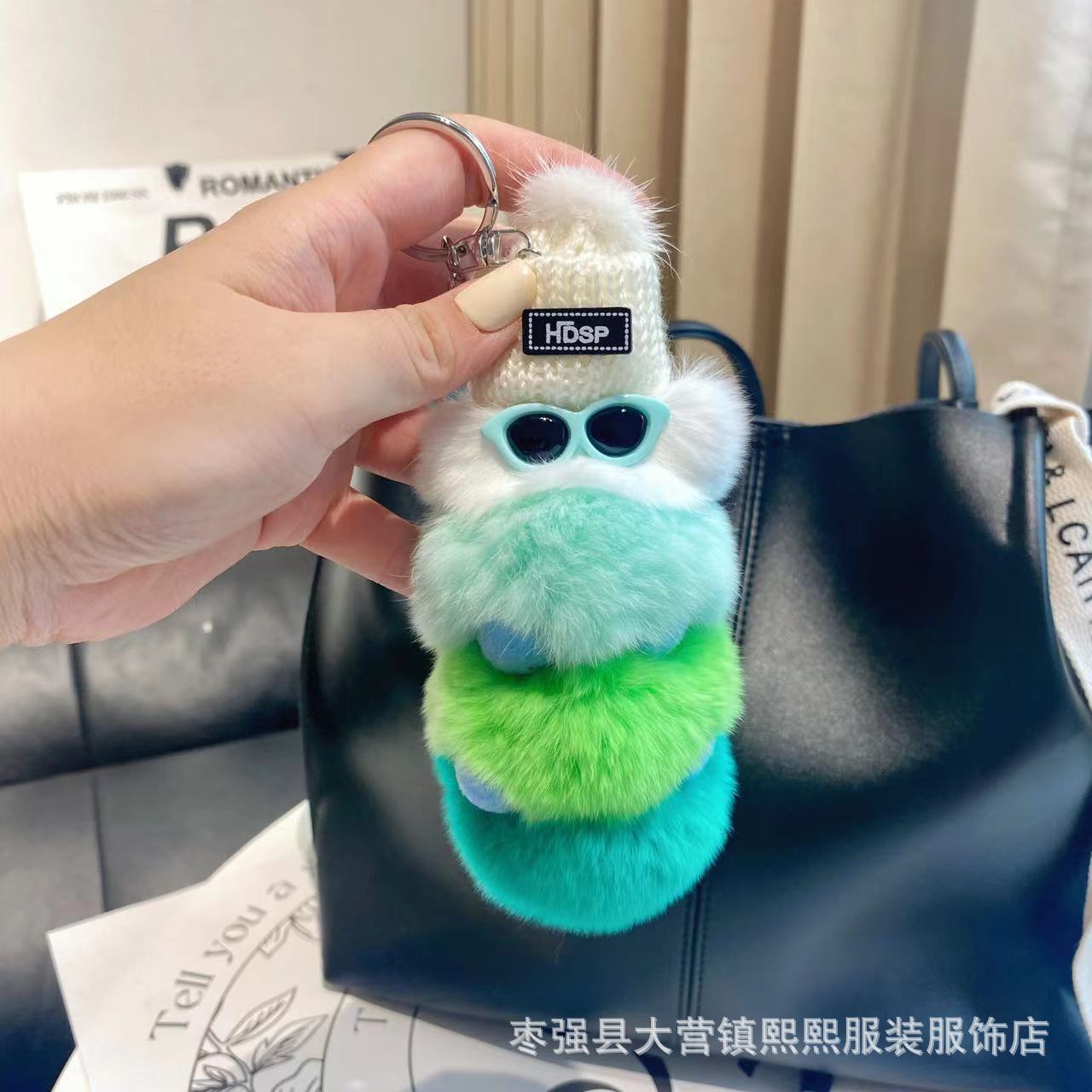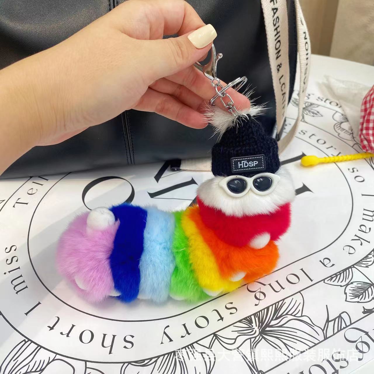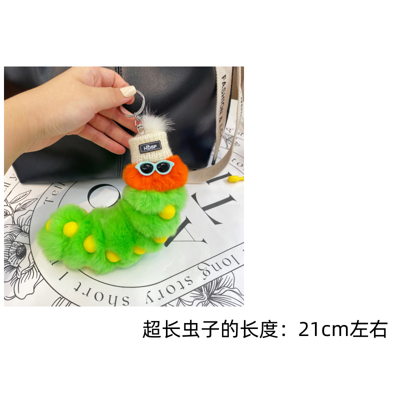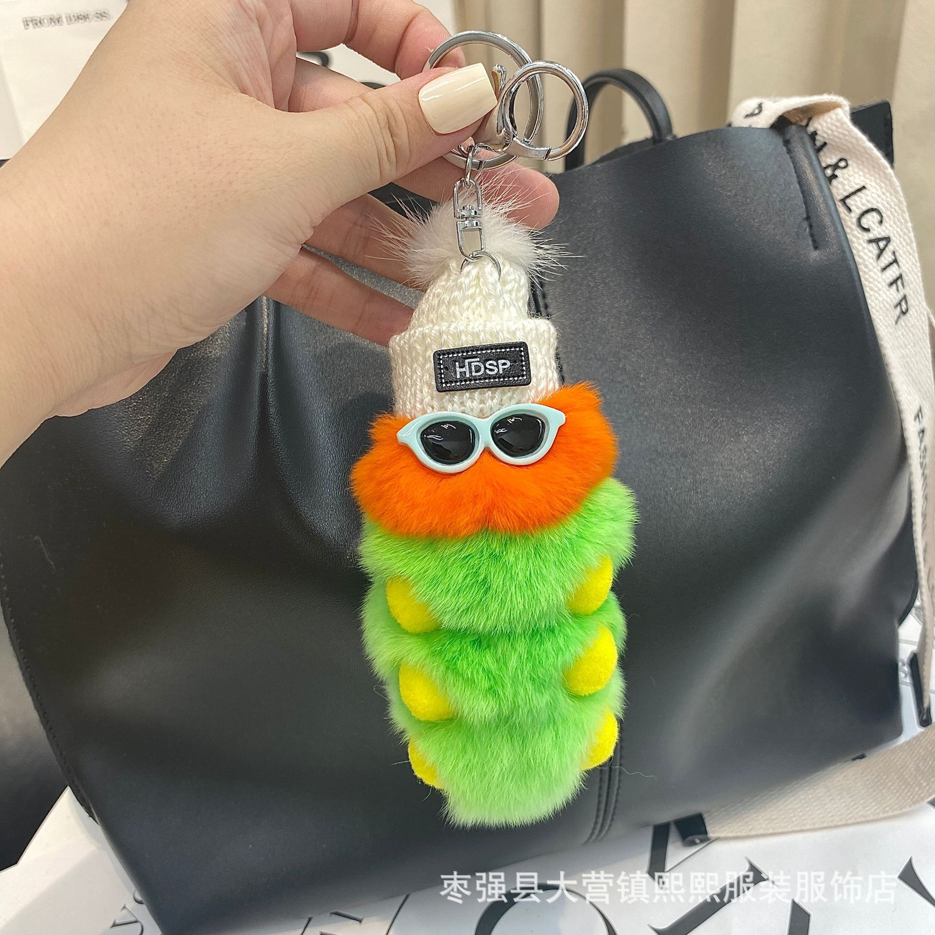 귀여운 진짜 렉스 토끼 모피 애벌레 펜던트 자동차 키 체인 스타 못생긴 귀여운 봉제 인형 가방 펜던트스토어 가기