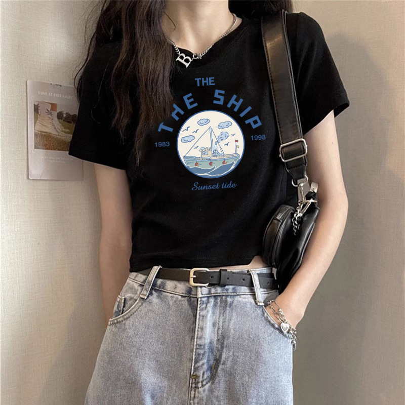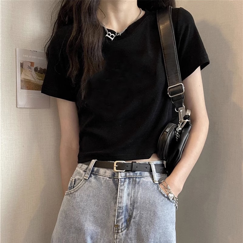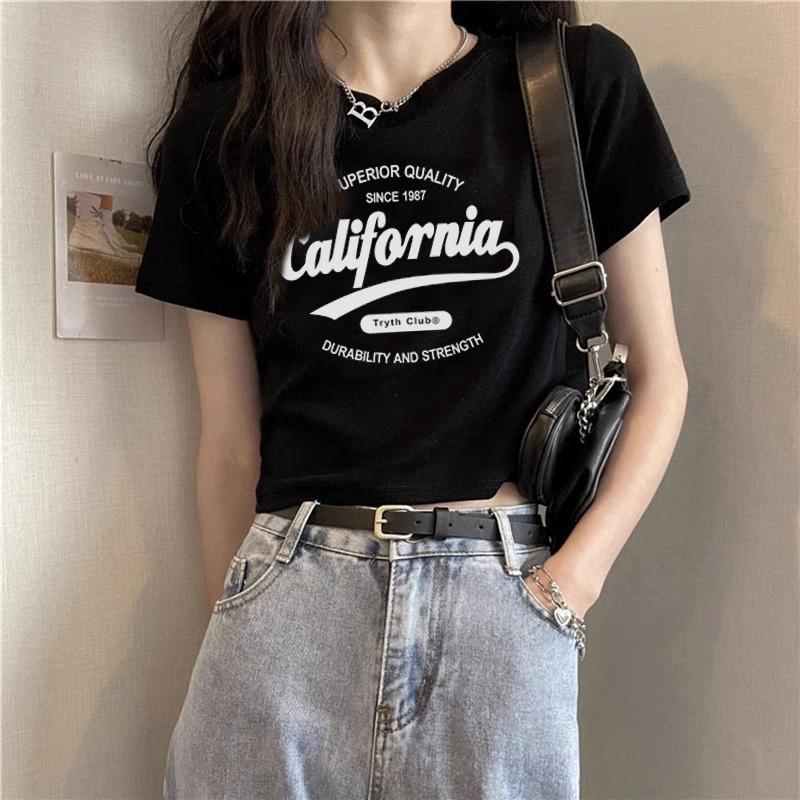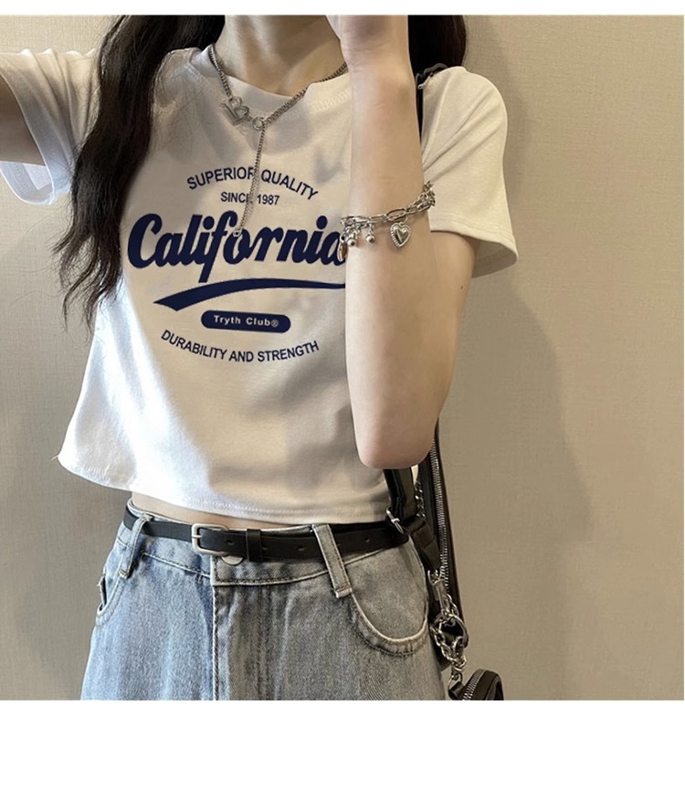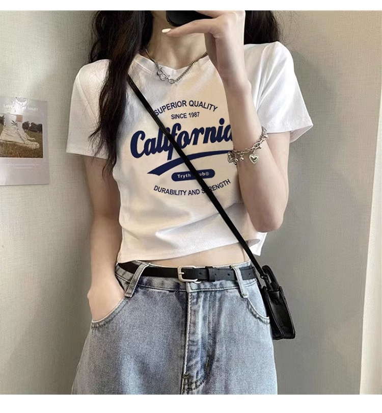 순면 화이트 티셔츠 여성 디자인 감각 어깨 반팔 여름 편지 인쇄 하이 웨이스트 핫 걸 탑