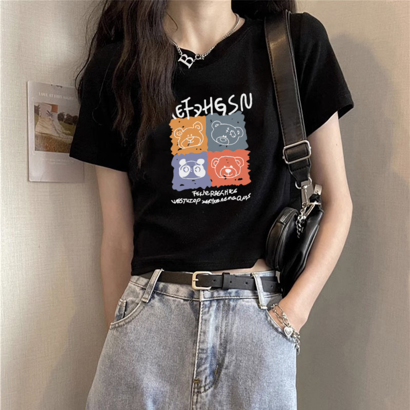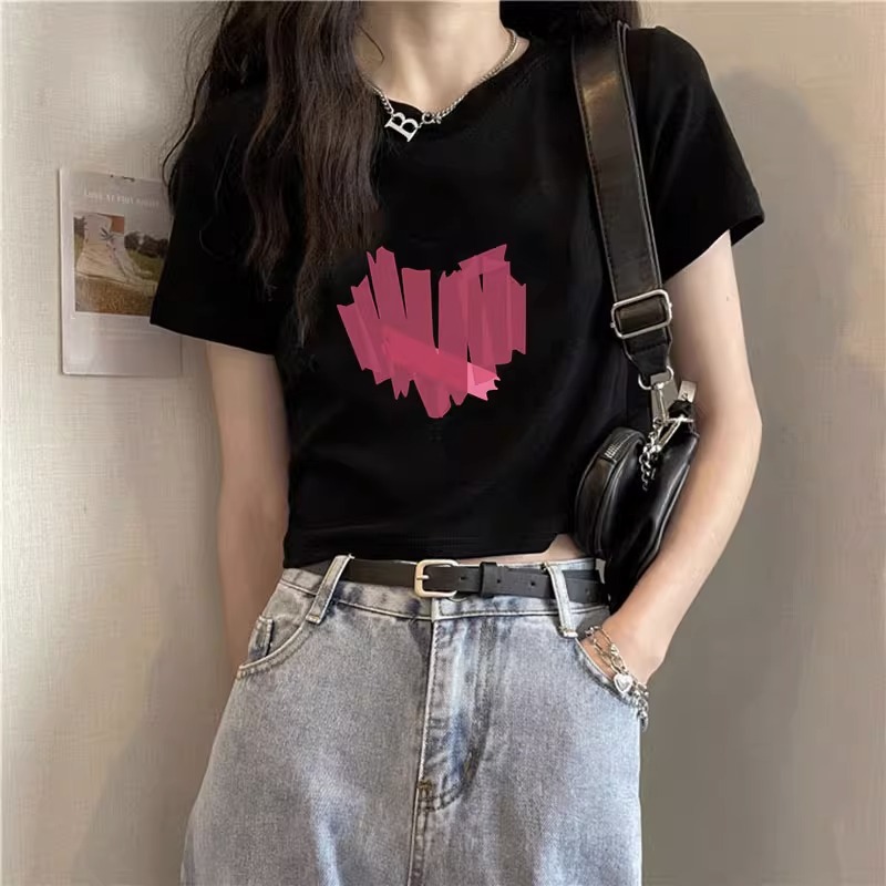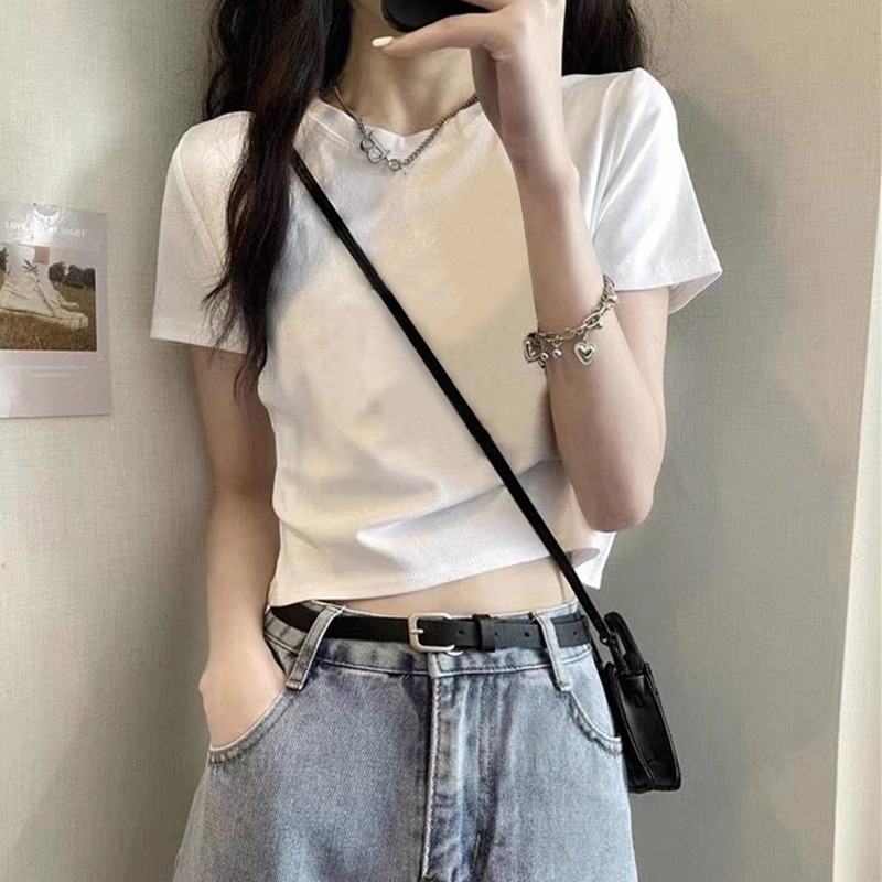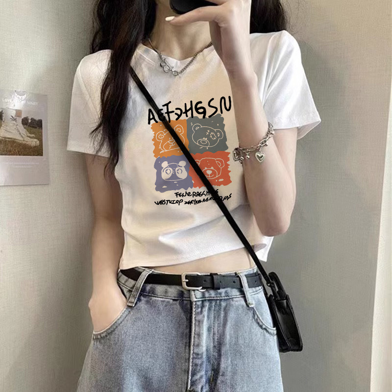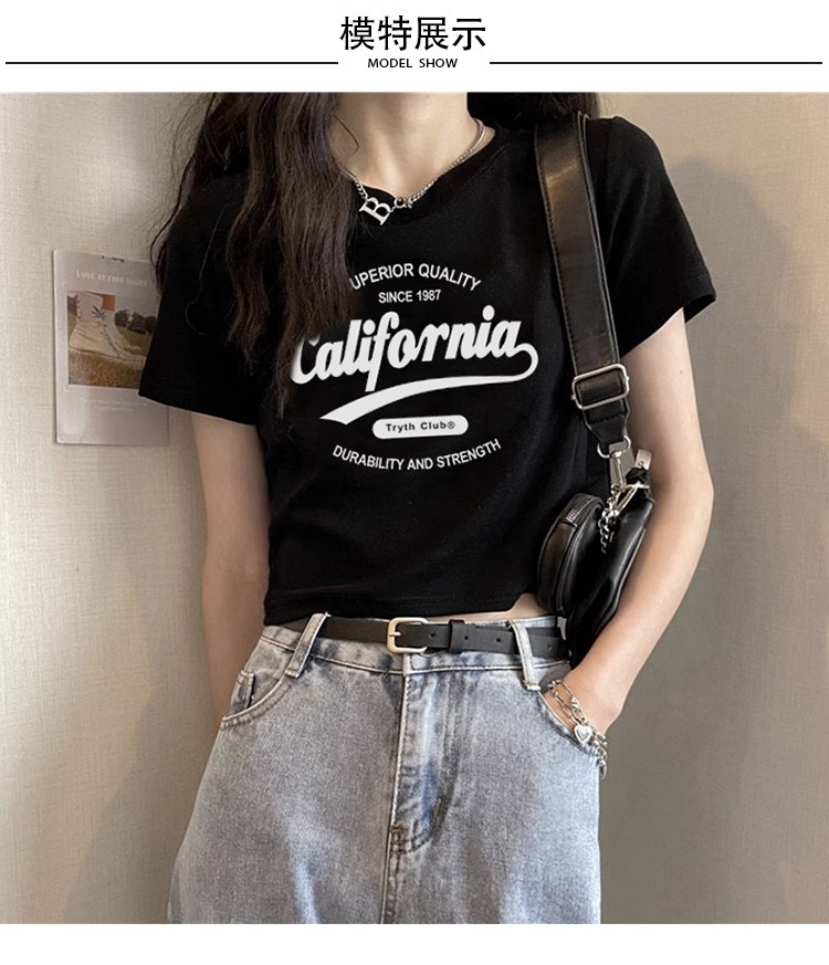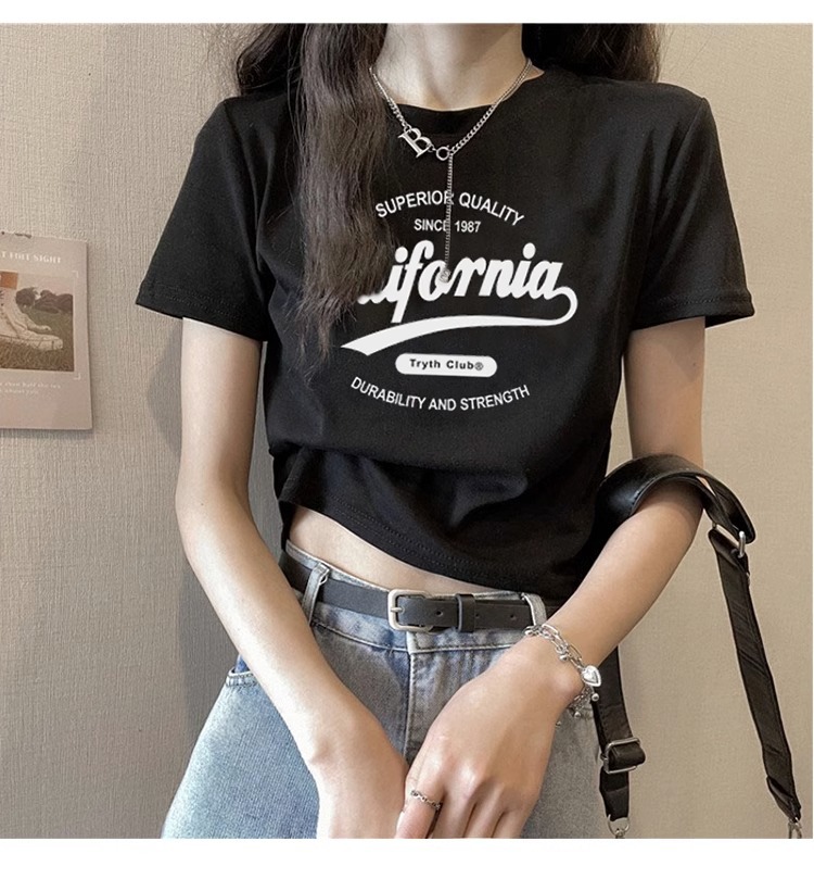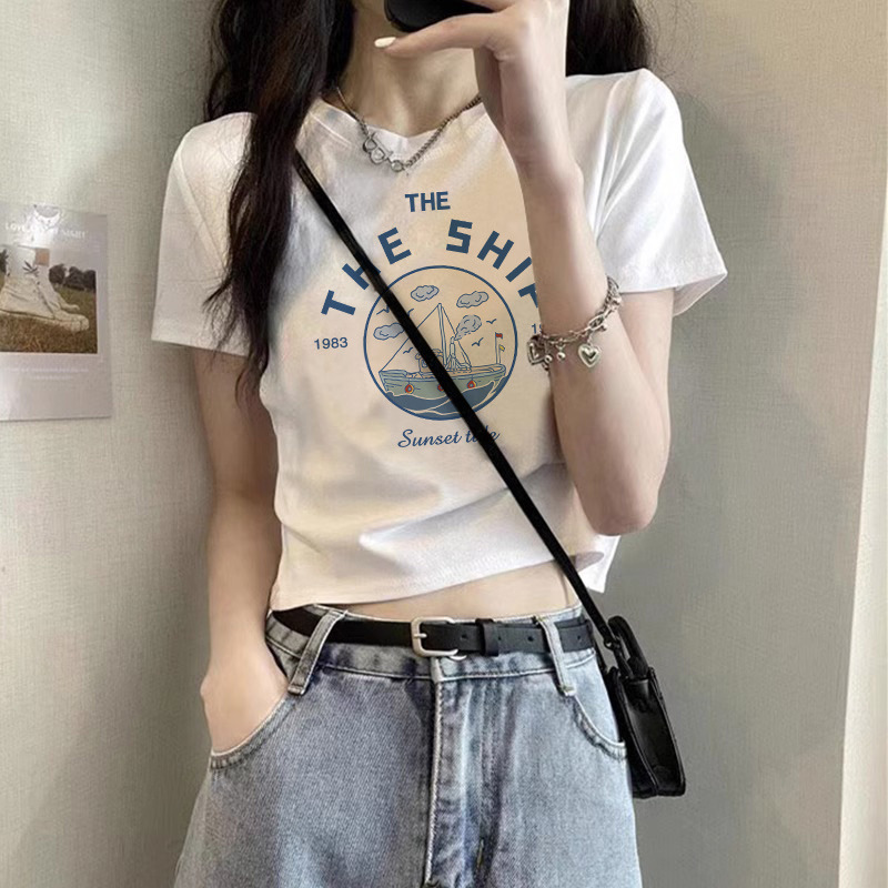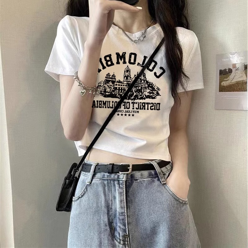 순면 화이트 티셔츠 여성 디자인 감각 어깨 반팔 여름 편지 인쇄 하이 웨이스트 핫 걸 탑스토어 가기
